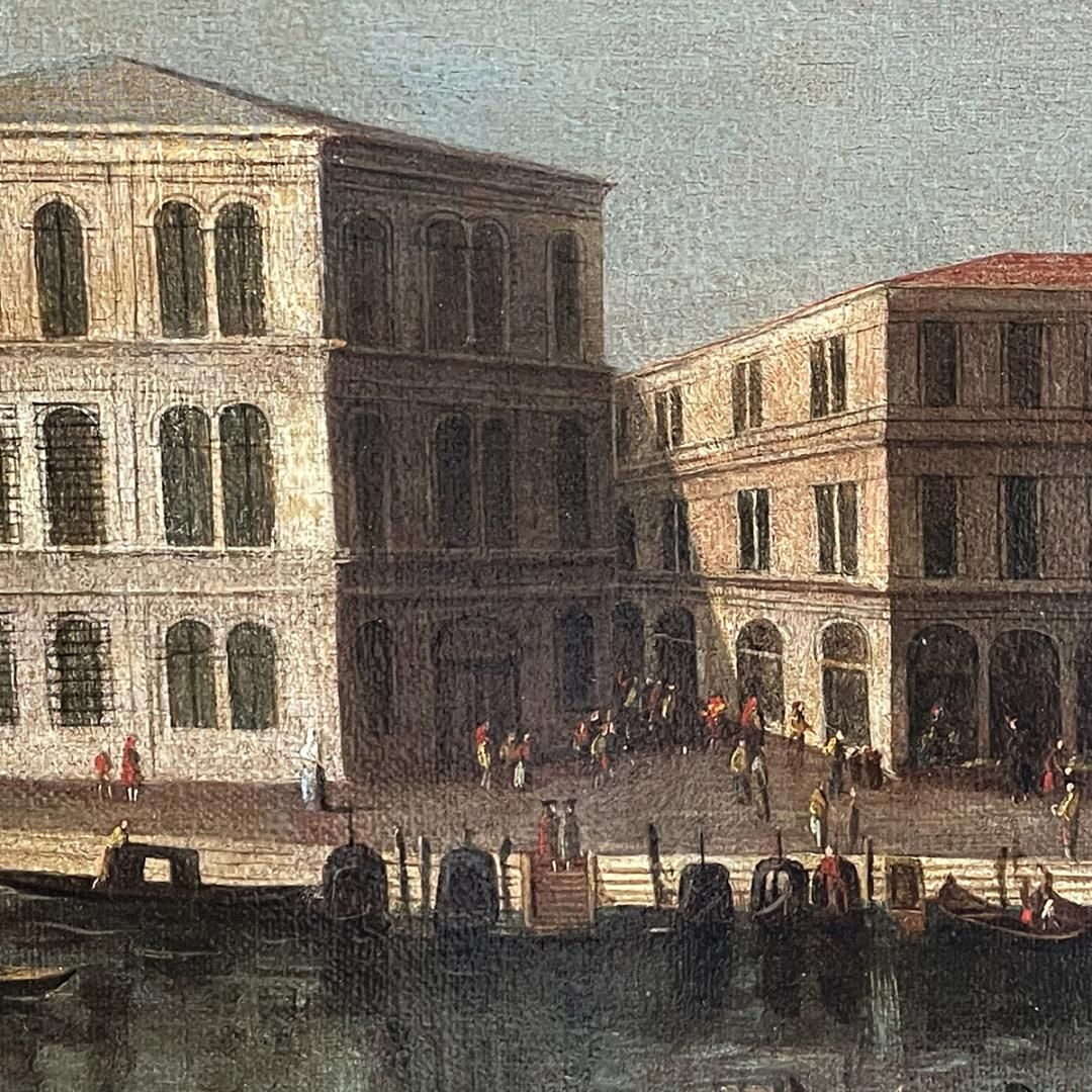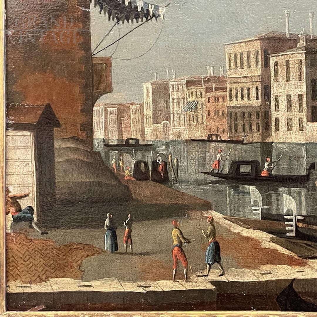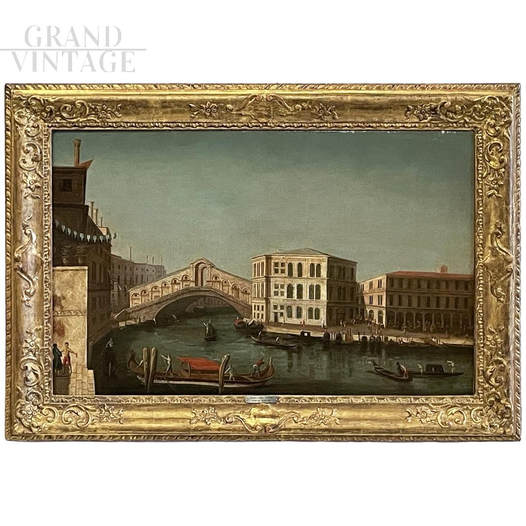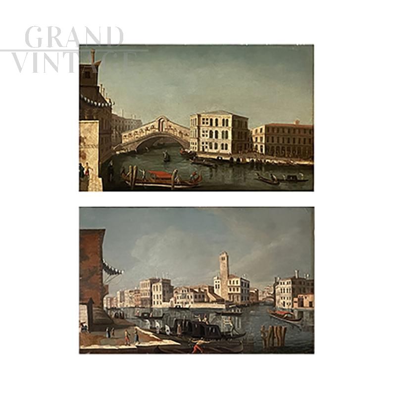 Pair of splendid oil paintings on canvas depicting Venetian landscapes. One canvas represents the entrance to Cannaregio and Palazzo Labia, the other the Grand Canal and the Rialto Bridge. These two views can be traced back to the hand of the famous painter Francesco Tironi – Venice, 1745 – Bologna 1799 (a talented landscape painter active in Italy during the second part of the Age of Enlightenment, specialized in architectural views intended to skilfully reproduce perspective illusions), in fact a particularity at the base of the Rialto Bridge, the artist monogrammed the work. In the paintings we can admire corners of the Venice lagoon animated by boats, gondolas, gondoliers and travellers, as well as palaces, new factories and churches, with elegant architectural structures of the buildings and the magnificent rippling motion of the waves.