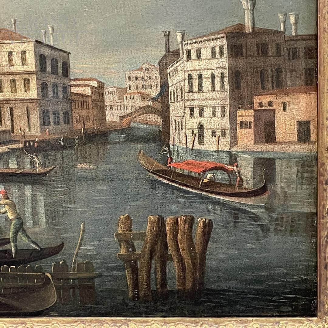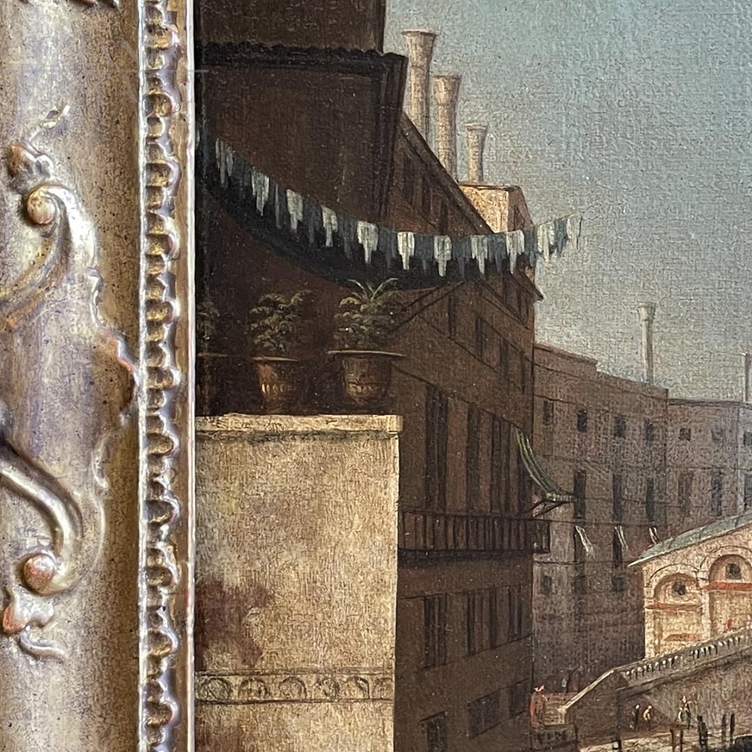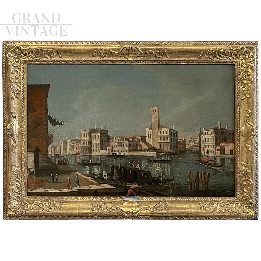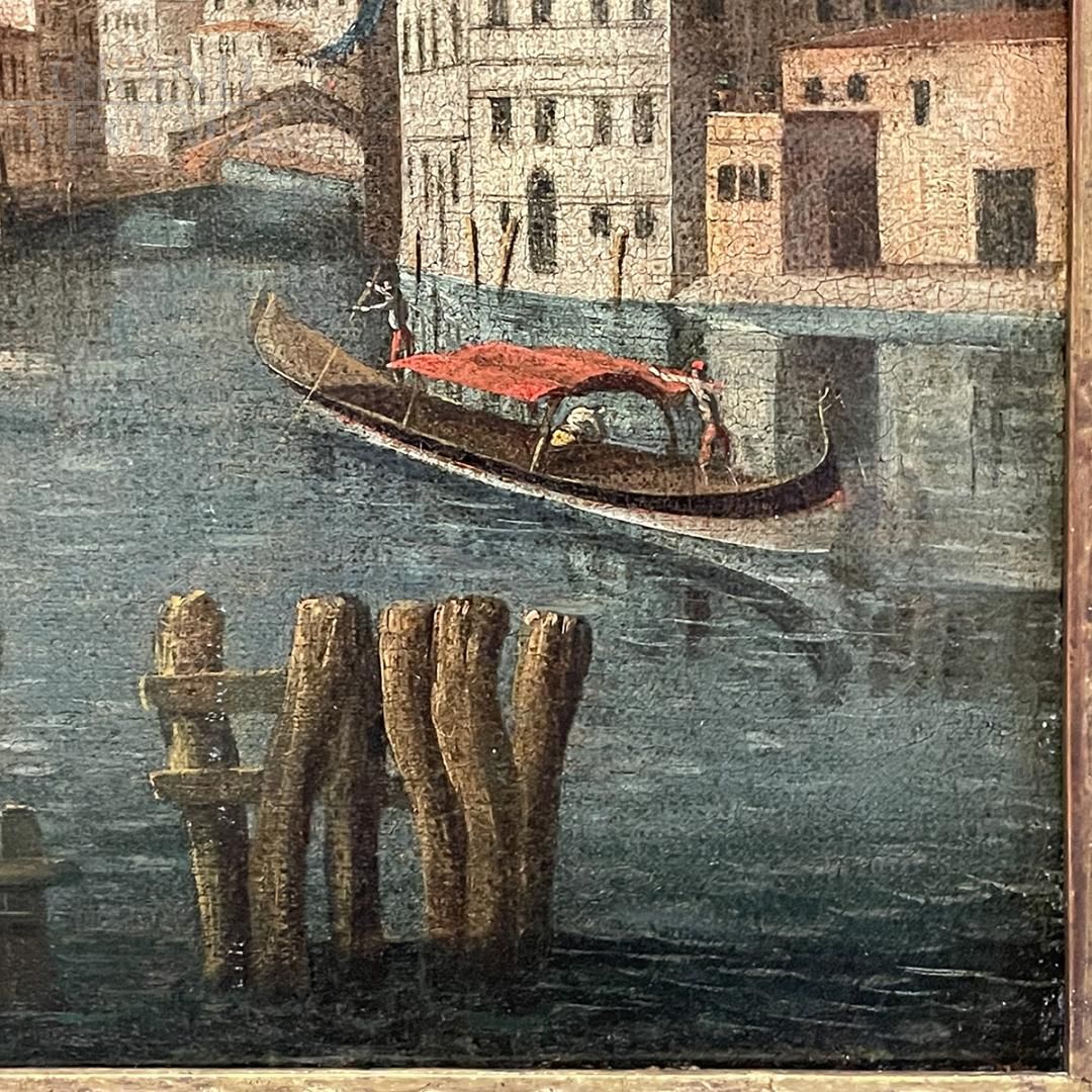 Pair of splendid oil paintings on canvas depicting Venetian landscapes. One canvas represents the entrance to Cannaregio and Palazzo Labia, the other the Grand Canal and the Rialto Bridge. These two views can be traced back to the hand of the famous painter Francesco Tironi – Venice, 1745 – Bologna 1799 (a talented landscape painter active in Italy during the second part of the Age of Enlightenment, specialized in architectural views intended to skilfully reproduce perspective illusions), in fact a particularity at the base of the Rialto Bridge, the artist monogrammed the work. In the paintings we can admire corners of the Venice lagoon animated by boats, gondolas, gondoliers and travellers, as well as palaces, new factories and churches, with elegant architectural structures of the buildings and the magnificent rippling motion of the waves.