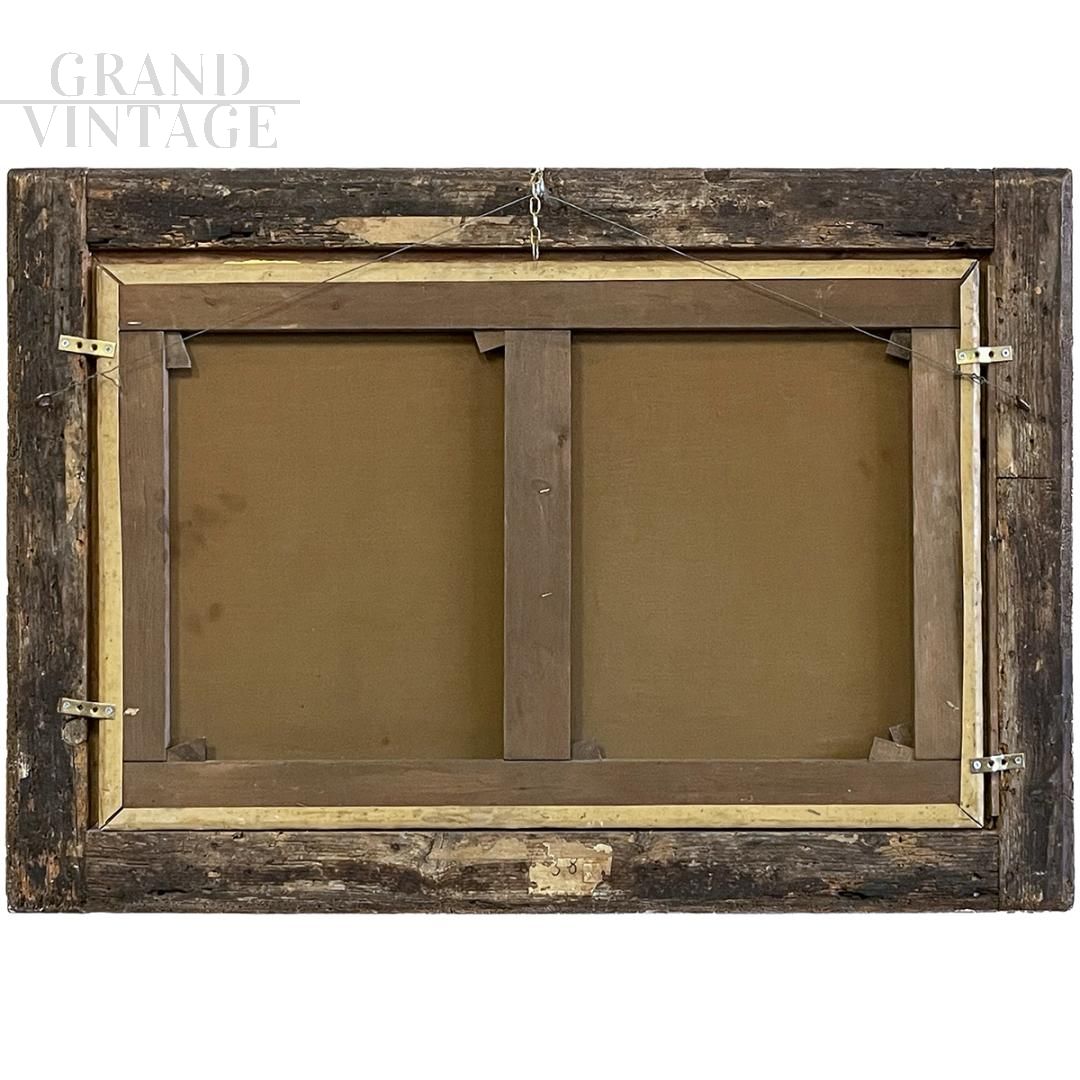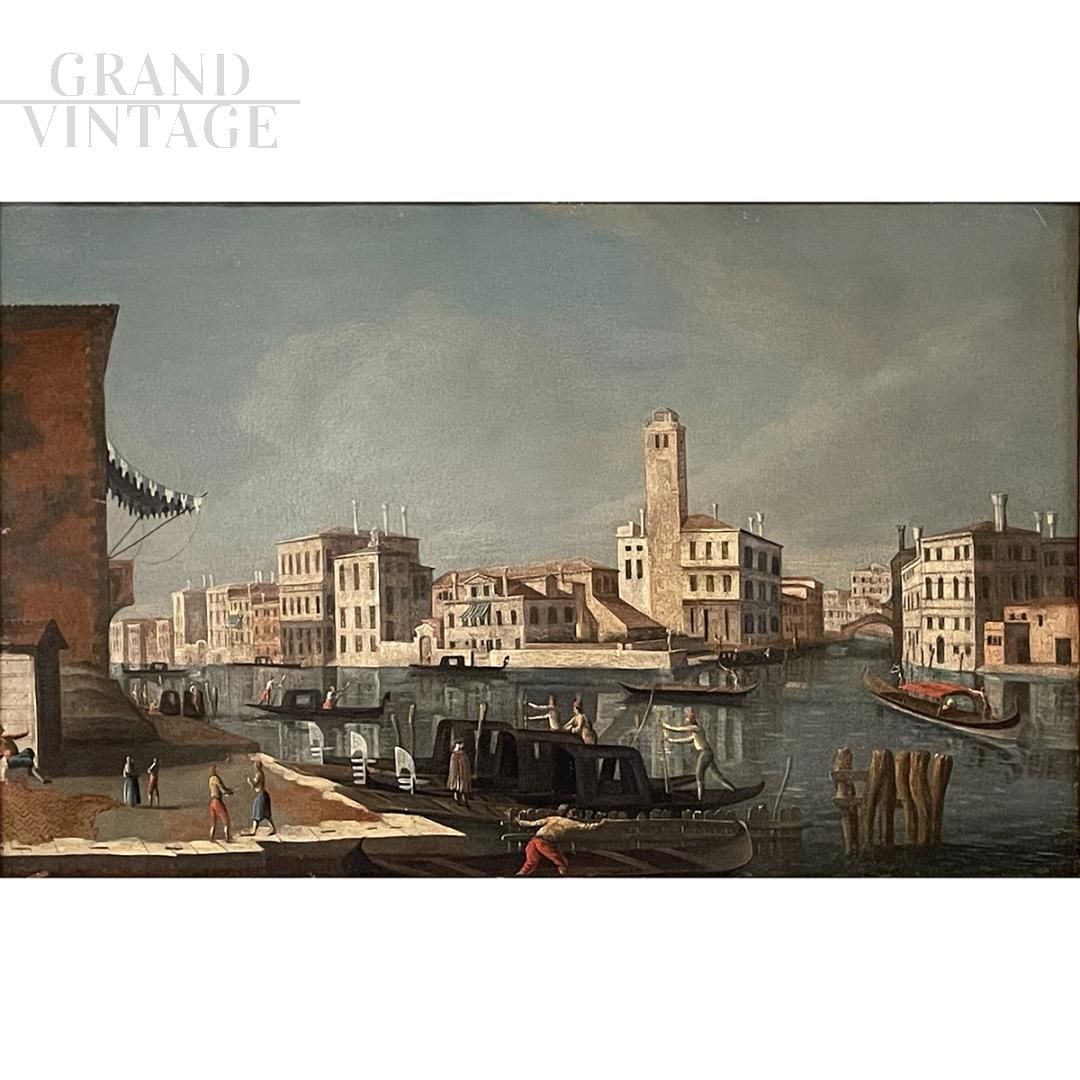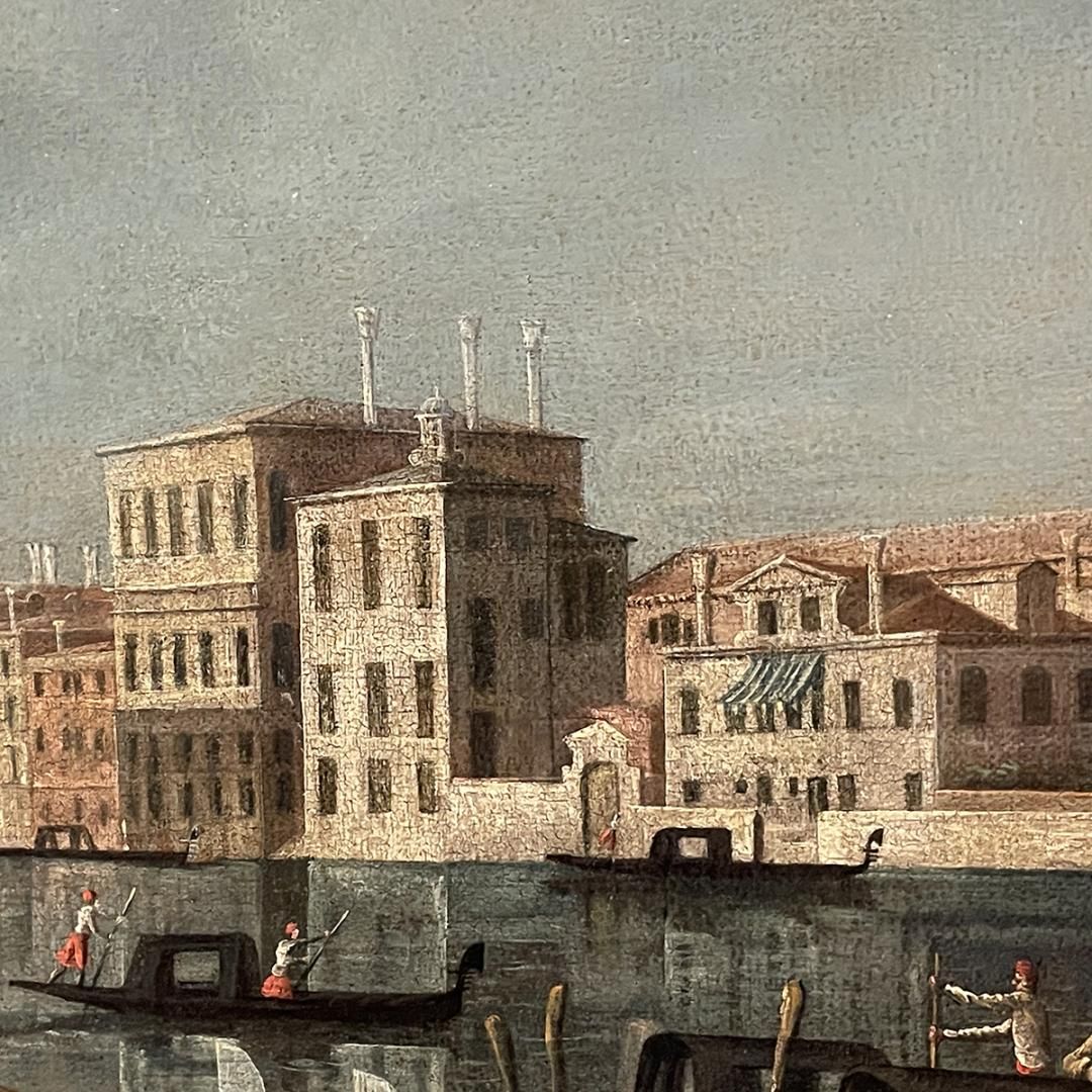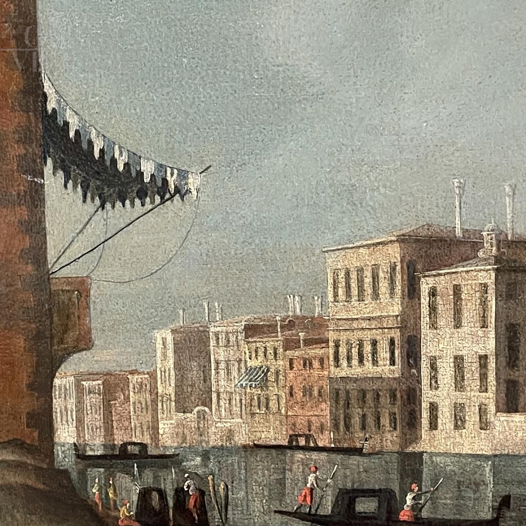 Pair of splendid oil paintings on canvas depicting Venetian landscapes. One canvas represents the entrance to Cannaregio and Palazzo Labia, the other the Grand Canal and the Rialto Bridge. These two views can be traced back to the hand of the famous painter Francesco Tironi – Venice, 1745 – Bologna 1799 (a talented landscape painter active in Italy during the second part of the Age of Enlightenment, specialized in architectural views intended to skilfully reproduce perspective illusions), in fact a particularity at the base of the Rialto Bridge, the artist monogrammed the work. In the paintings we can admire corners of the Venice lagoon animated by boats, gondolas, gondoliers and travellers, as well as palaces, new factories and churches, with elegant architectural structures of the buildings and the magnificent rippling motion of the waves.