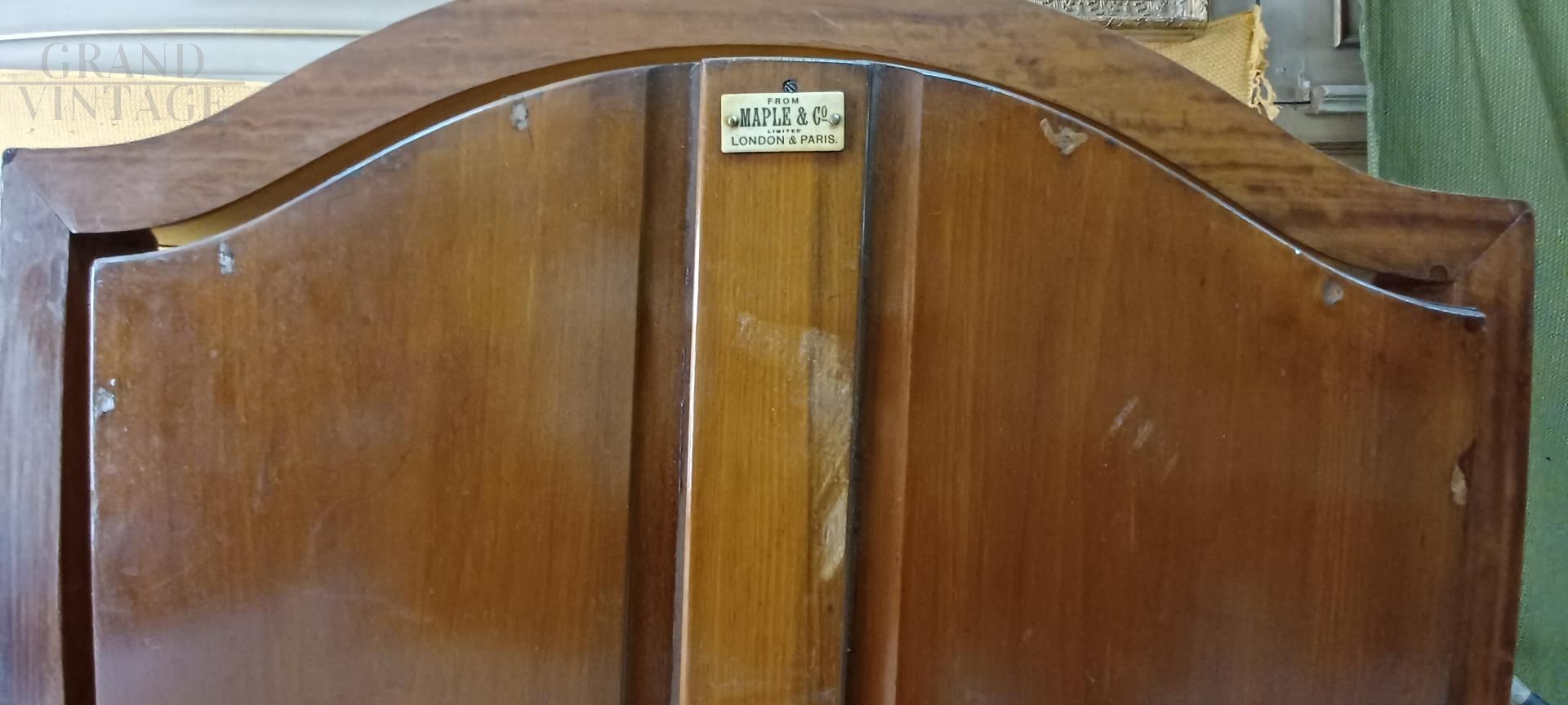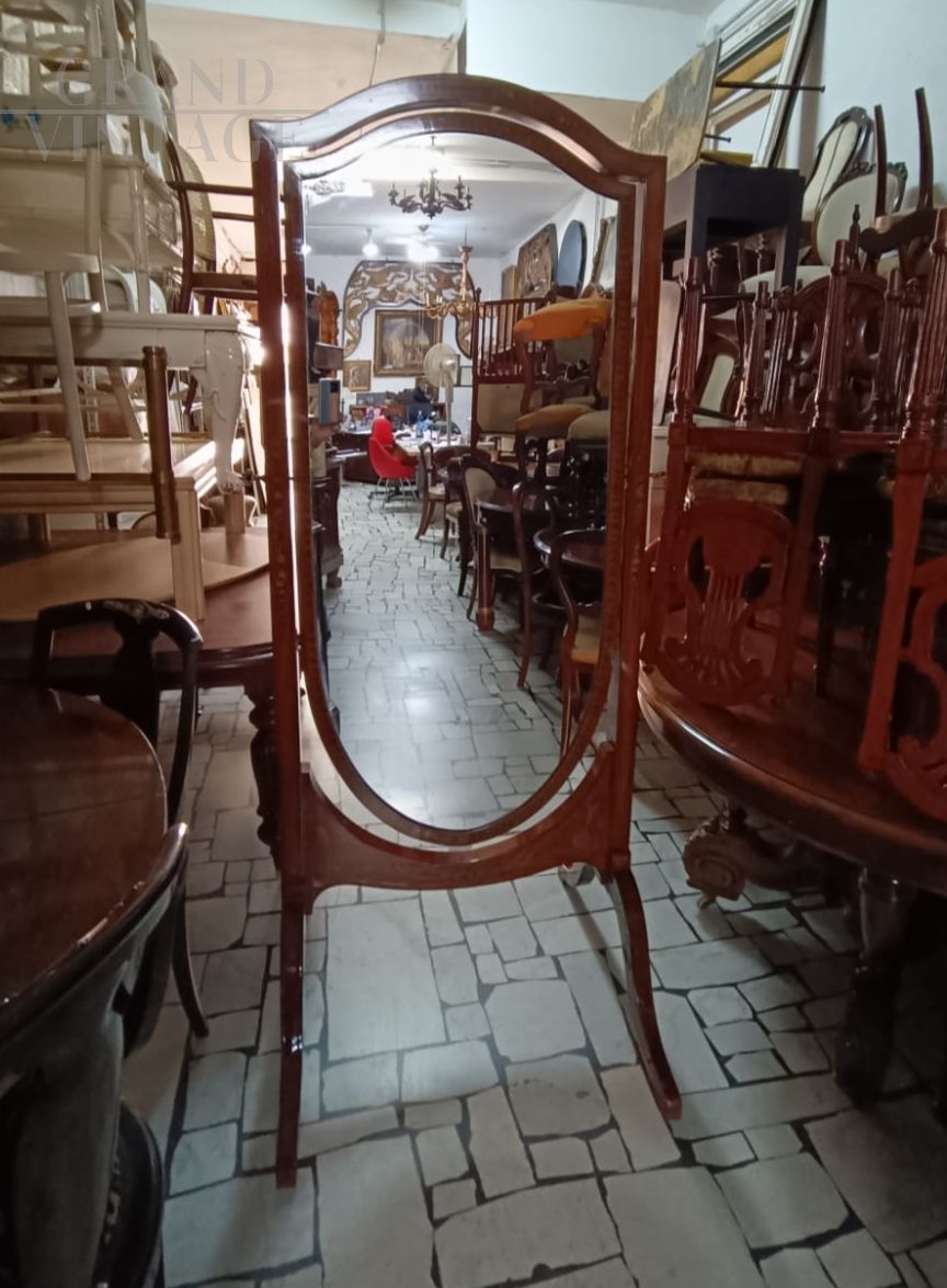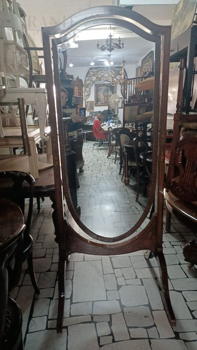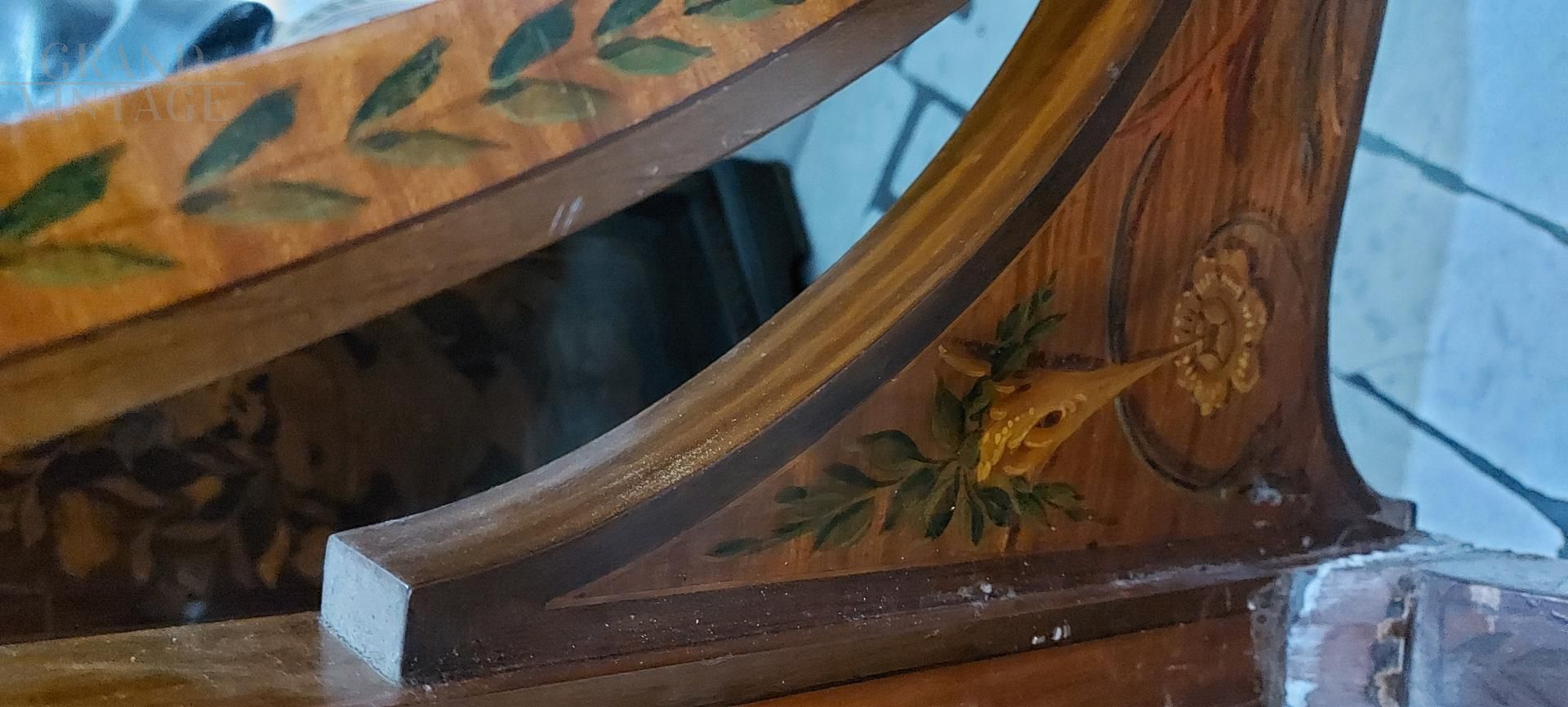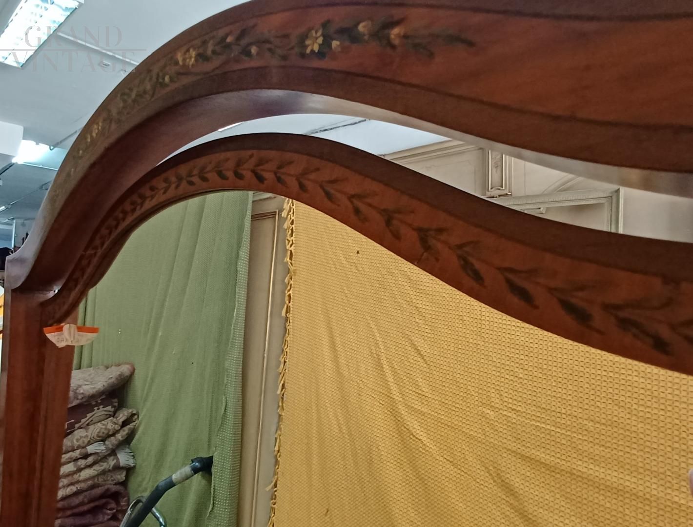 Antique Edwardian standing mirror with Maple & Co brand. English original, in finely lacquered maple wood and hand decorated with floral and geometric motifs. Back in finished maple wood. Late 19th century, from England, branded Maple & Co, a British furniture and upholstery manufacturer founded in 1841 that enjoyed particular success during the Victorian and Edwardian era. The company has become one of the leading manufacturers and suppliers of furniture for the aristocracy and the royal family.
