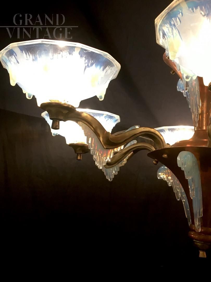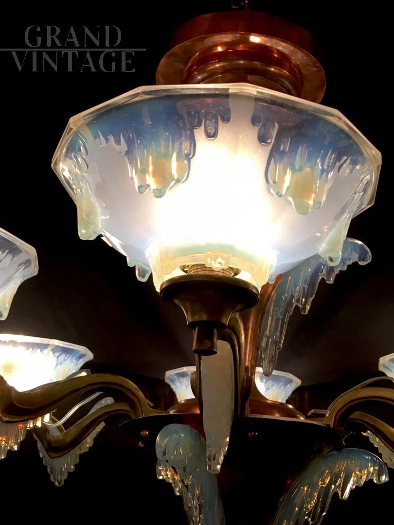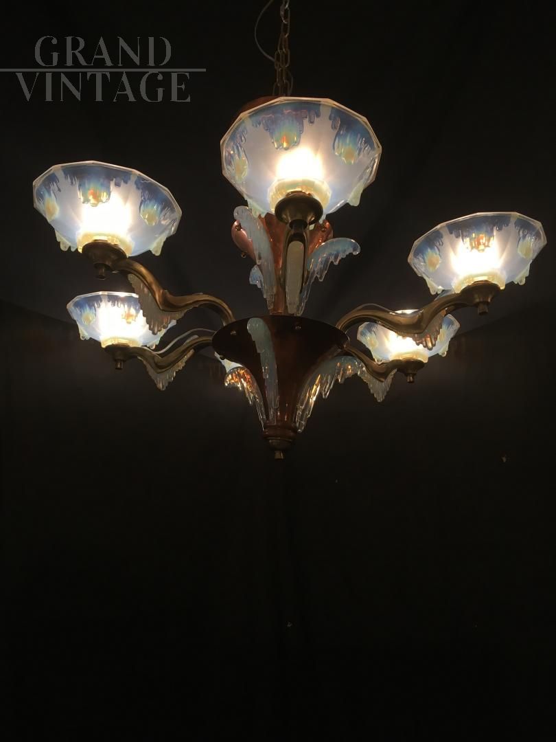 Important chandelier with alloy and copper structure, very particular and interesting. From France, around 1930. The glasses are original, thick and blown on a mold. Ideal for lighting different rooms: living room, kitchen, corridors, studio. Totally restored and functional. Electrical system completely redone with Italian lamp holders. Negotiable price. It has 6 lights. If sold, the glasses will be completely dismantled from the structure and individually wrapped.