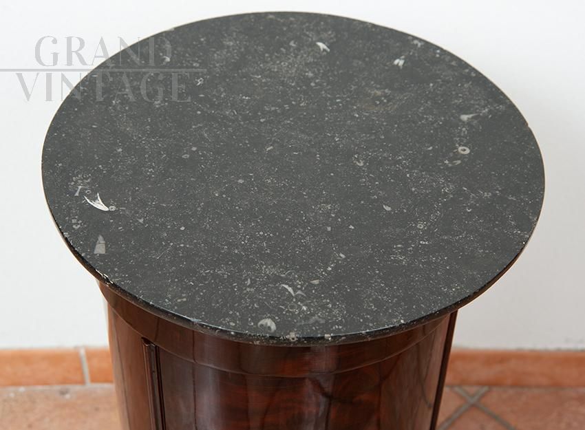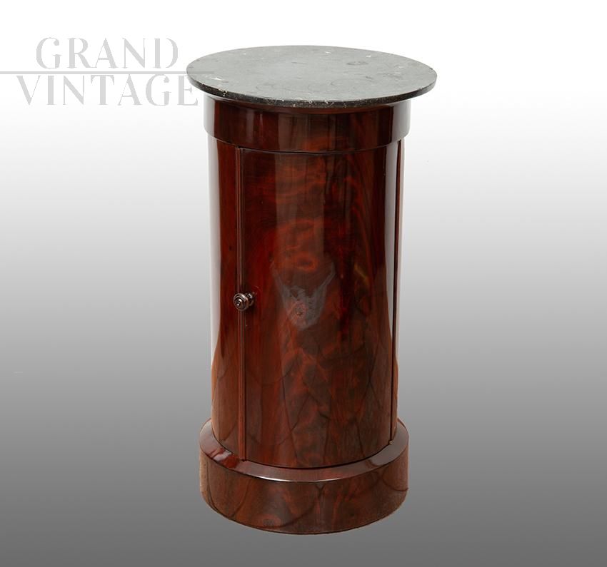 French Empire cylinder bedside table in mahogany feather with black marble top
