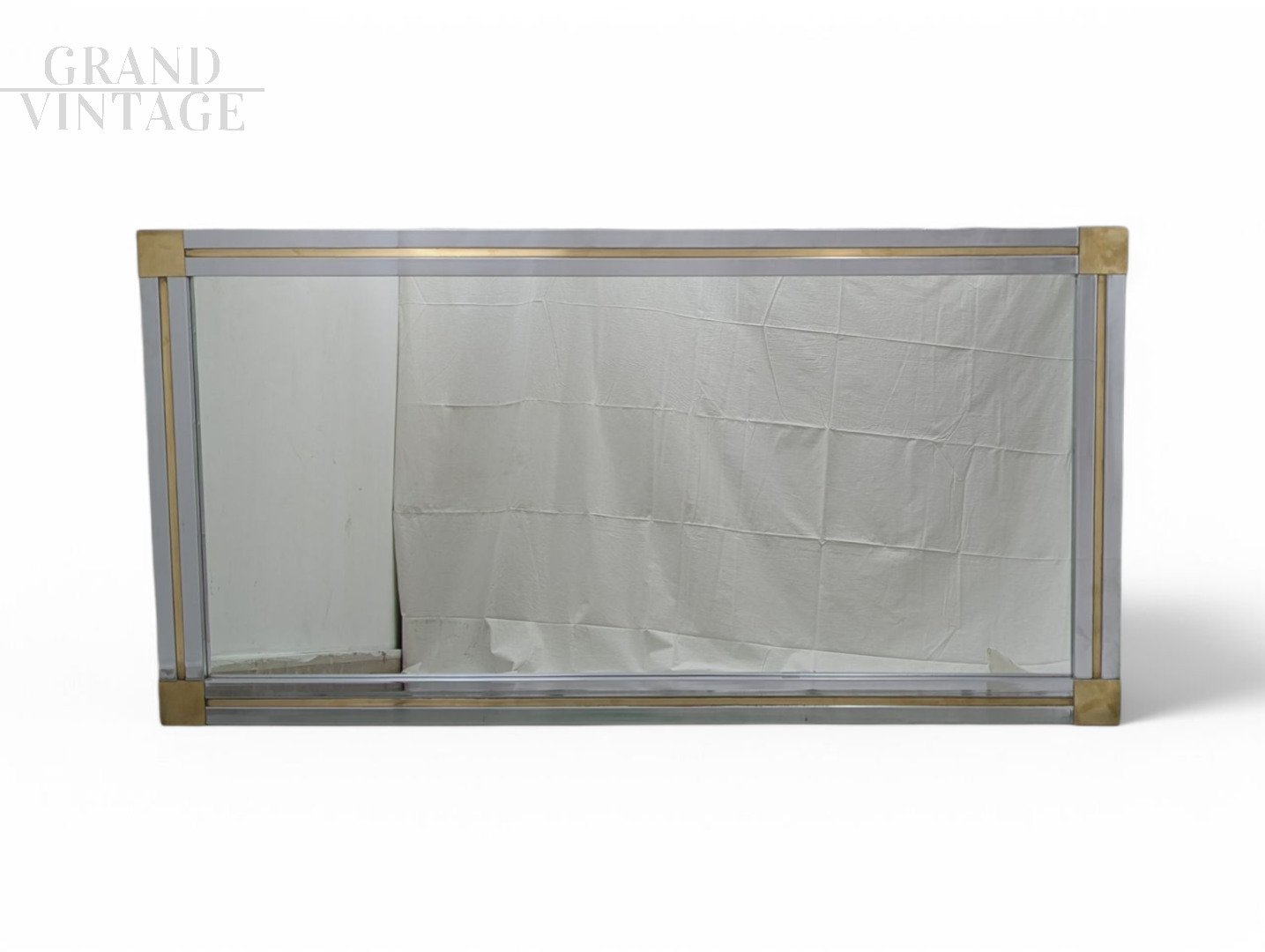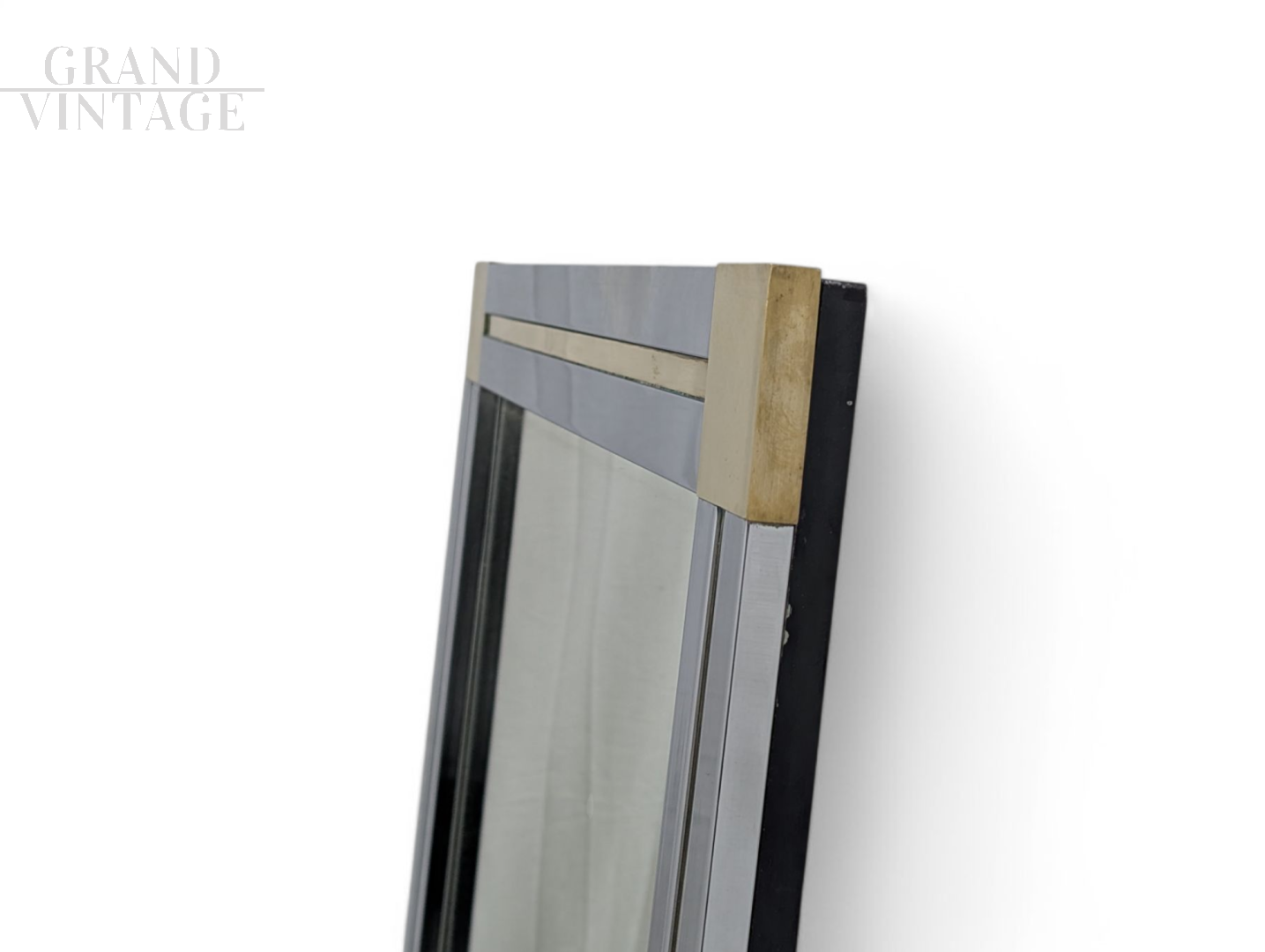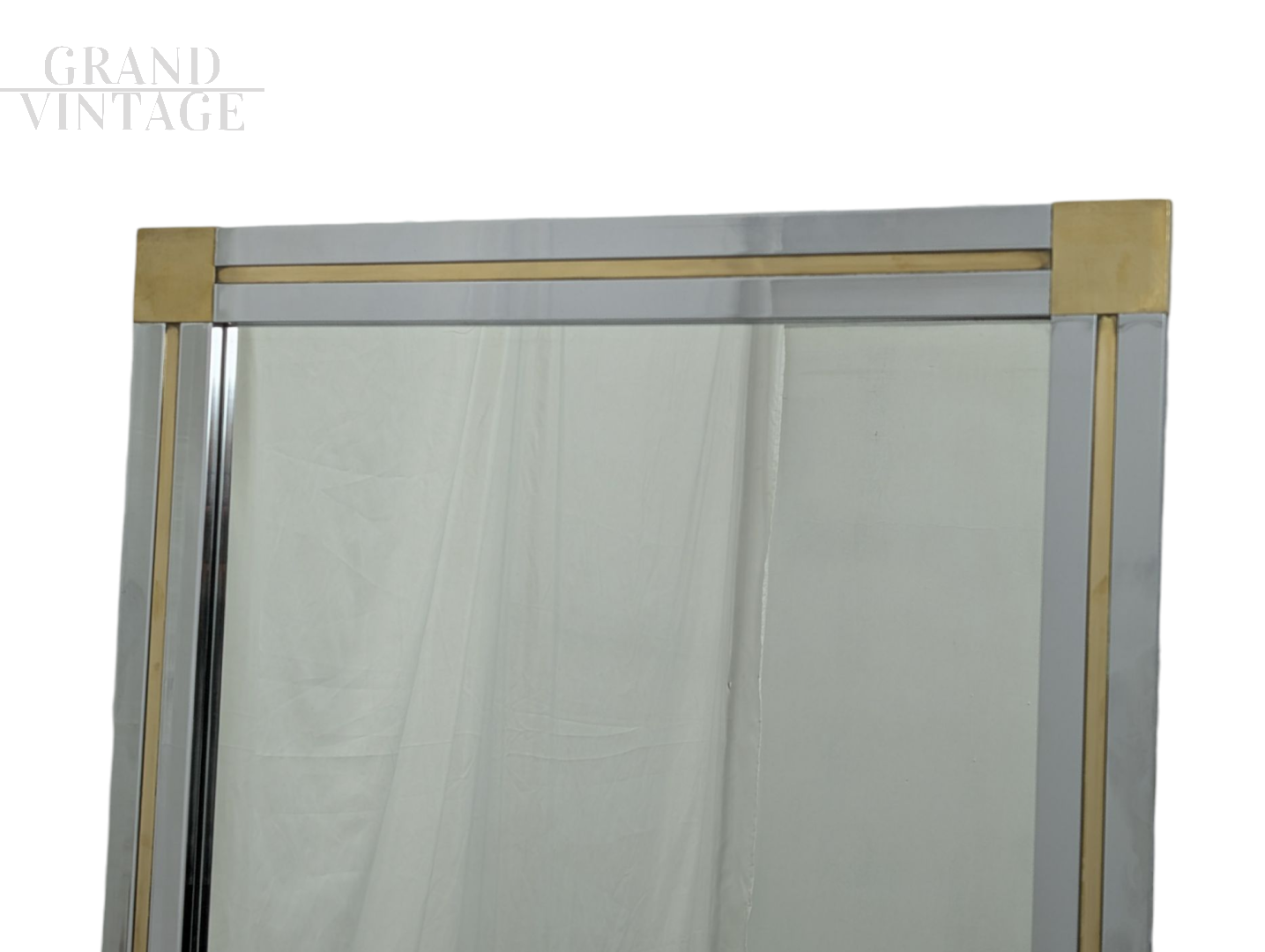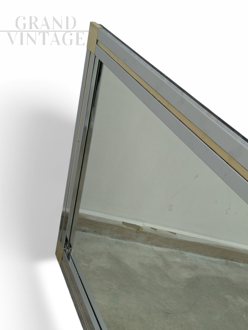Large full-length wall mirror with chrome frame with geometric brass decoration, Italy 1970s, in excellent condition, light signs of aging.