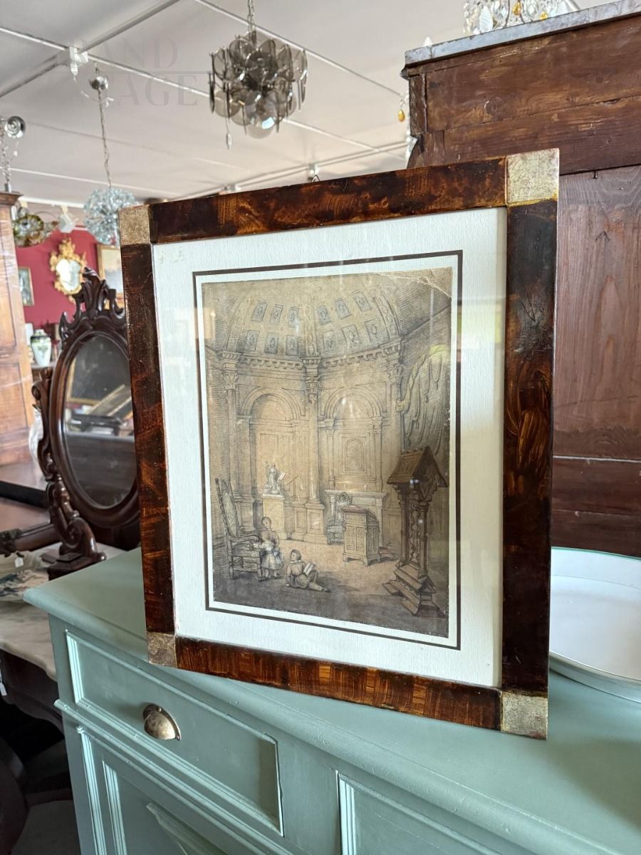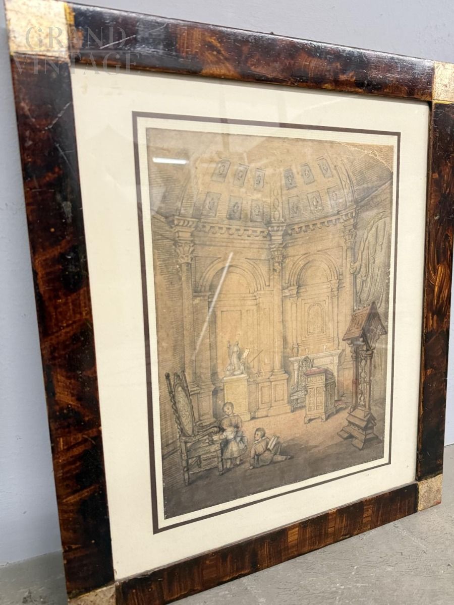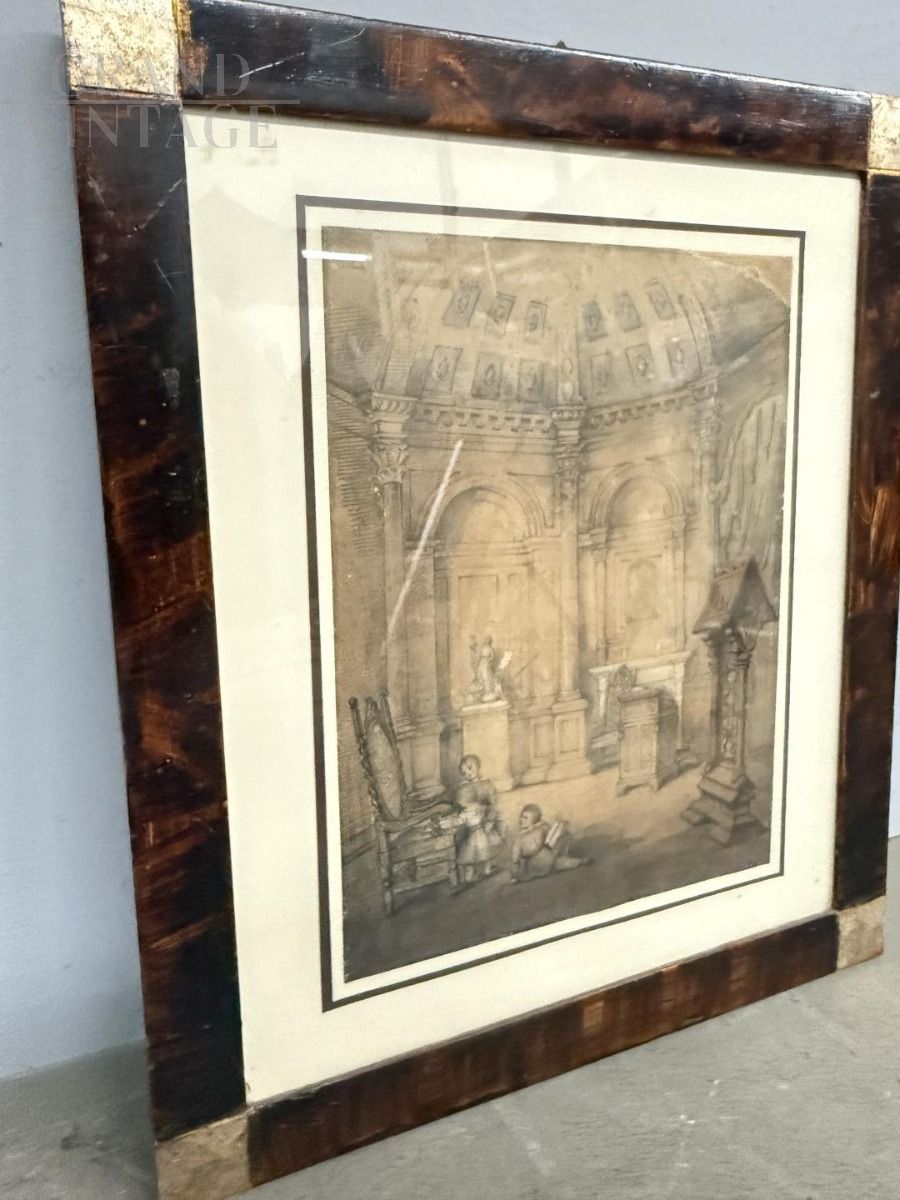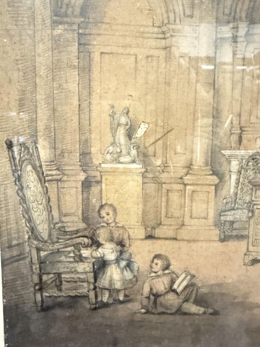Antique drawing with children and architecture signed Gael Covelli, made at the end of the 19th century, complete with antique frame. The drawing is of fine workmanship and is in excellent condition, signed lower left. Measurements: 51 x 43 cm.