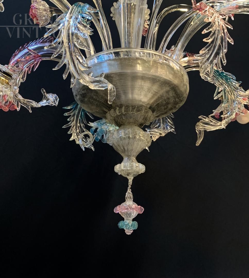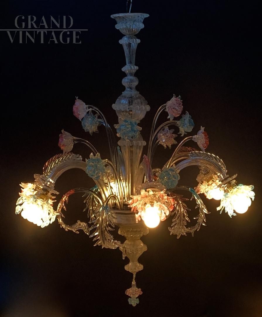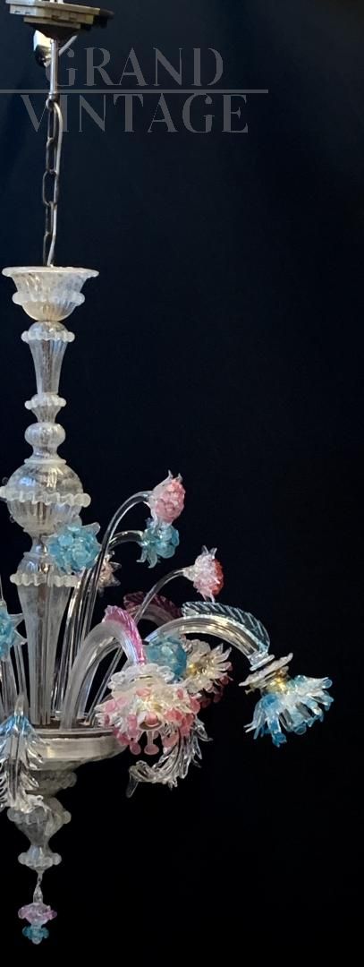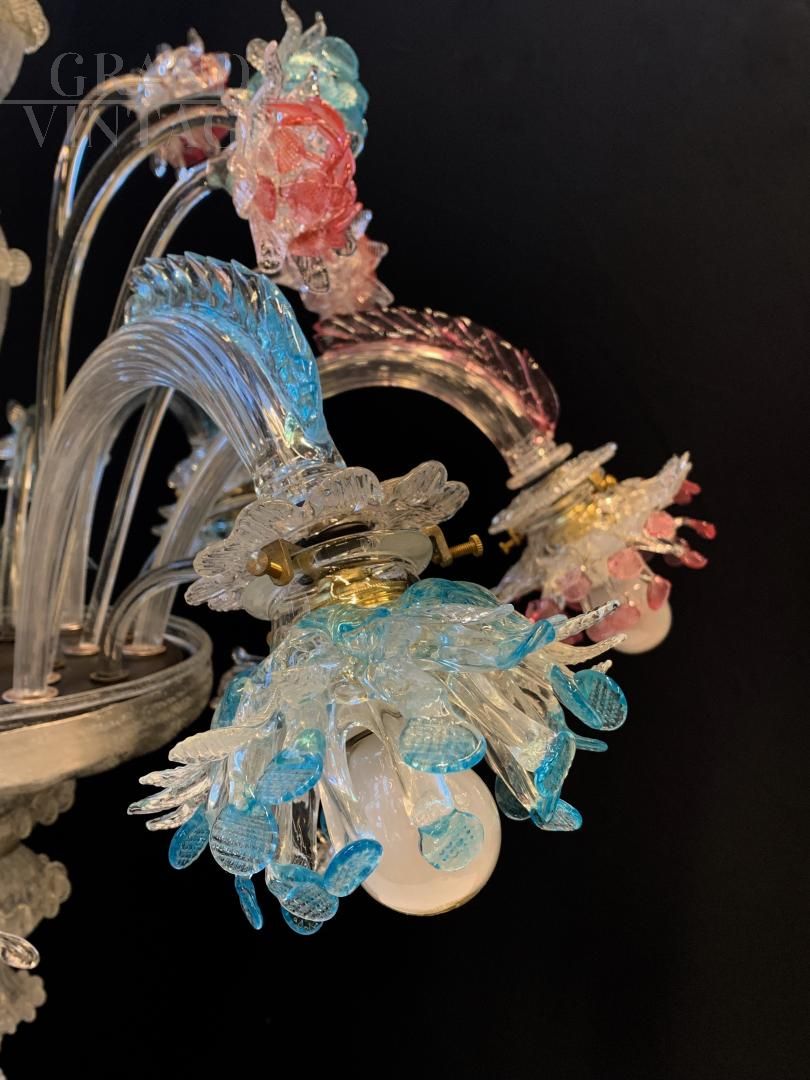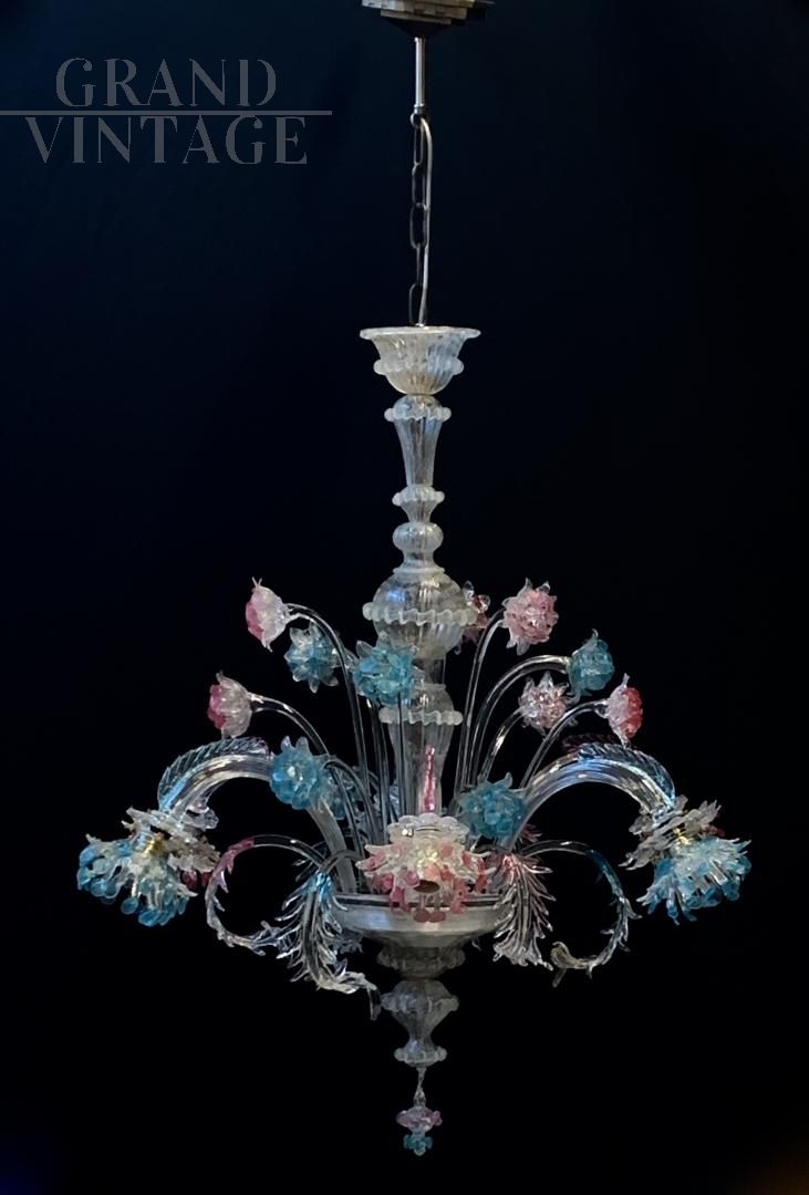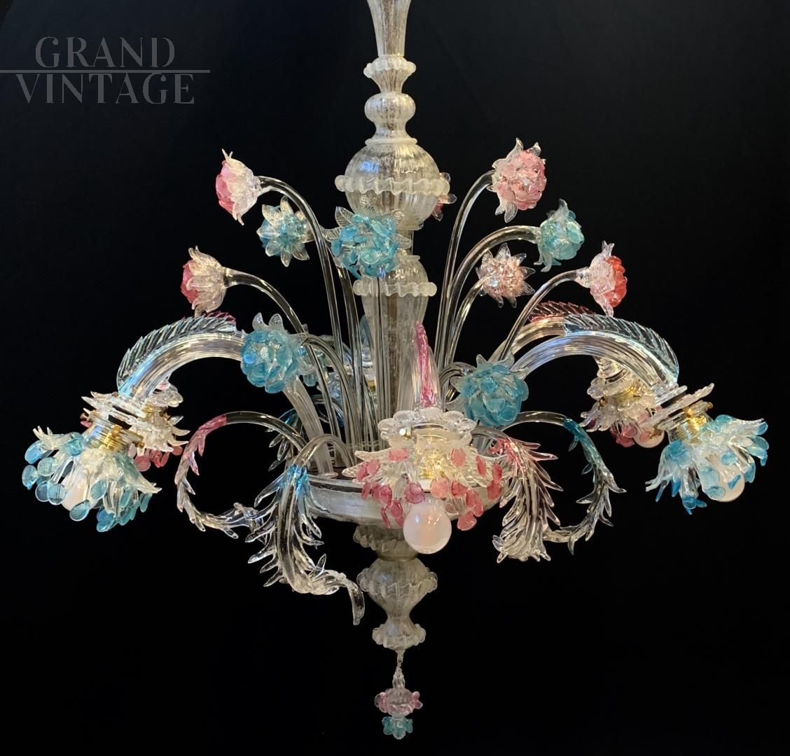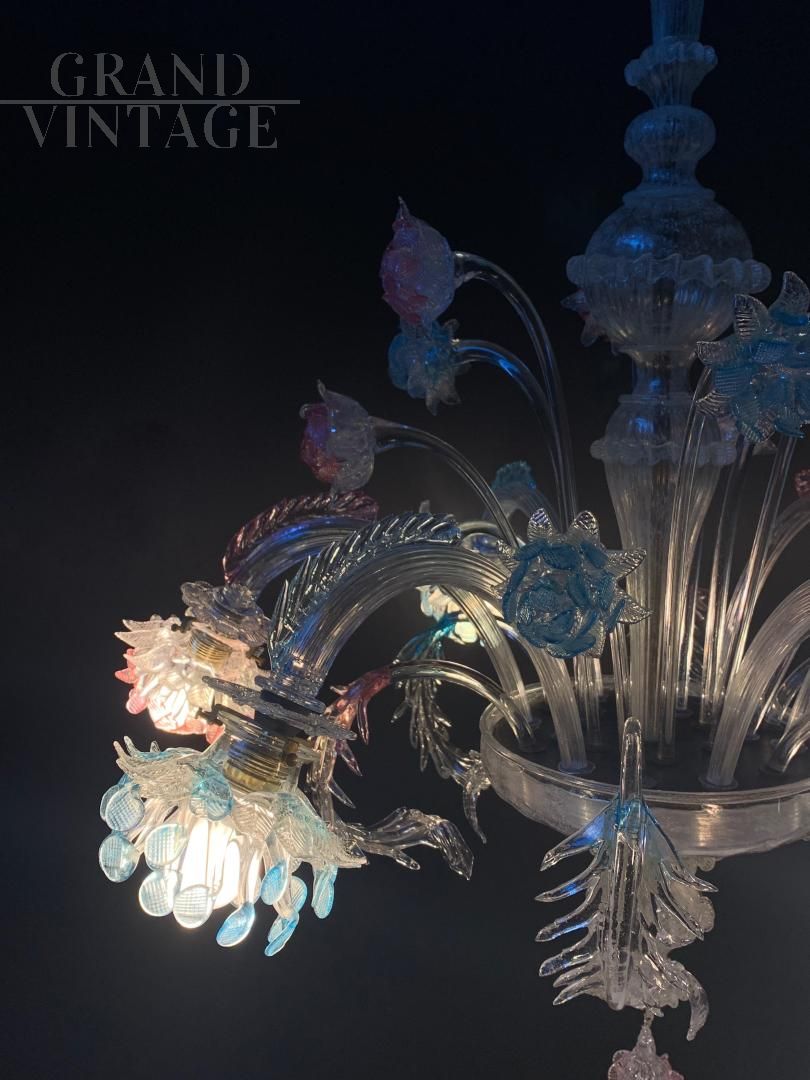 Fantastic original chandelier from the Galliano Ferro company in handmade Murano glass with pink and blue colors, from the 1950s, all original and with electrical system redone. The glasses are not cracked, note the fantastic leaves with double glass processing. Very elegant final cup that adapts to the whole chandelier, elegant and rational. Of course it has the signs of aging. For reasons of safeguarding the chandelier, collection directly from the seller is recommended.