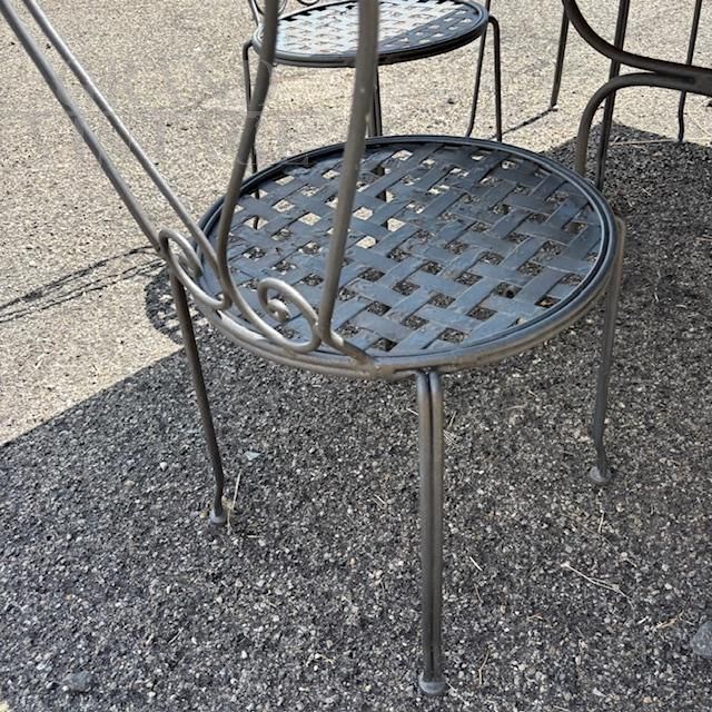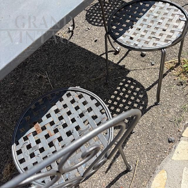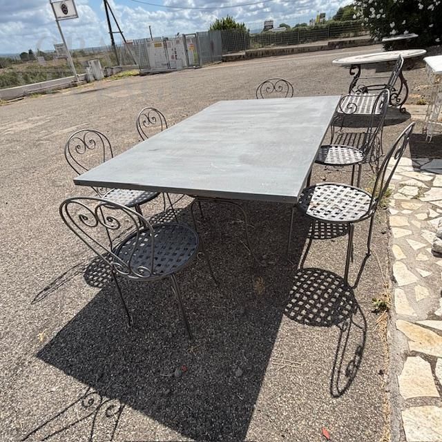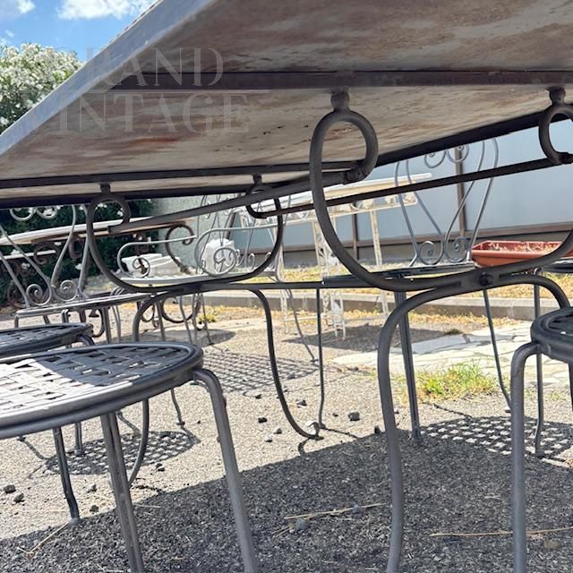 Beautiful vintage garden set consisting of a large table and six wrought iron chairs, handcrafted by master craftsmen during the 20th century. The iron is anthracite in color. In good condition.
