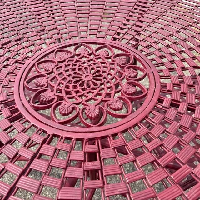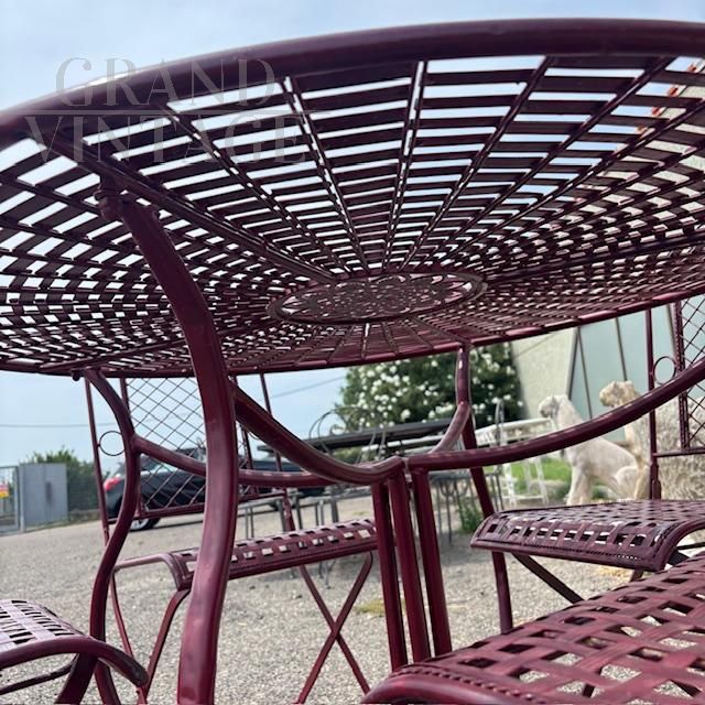 Vintage garden set consisting of a round table and four chairs in purple-red lacquered wrought iron, Italy 1970s. In very good condition.