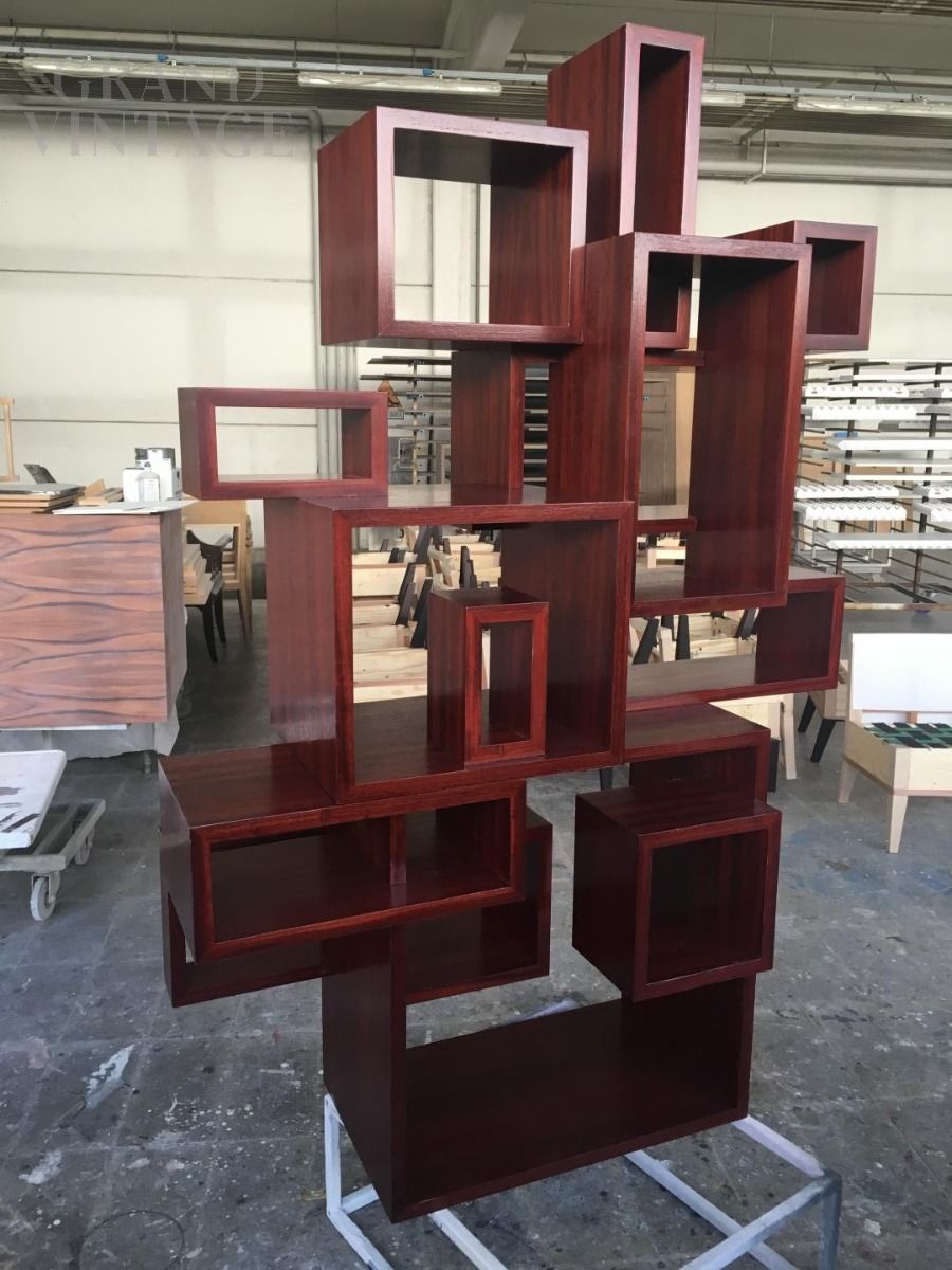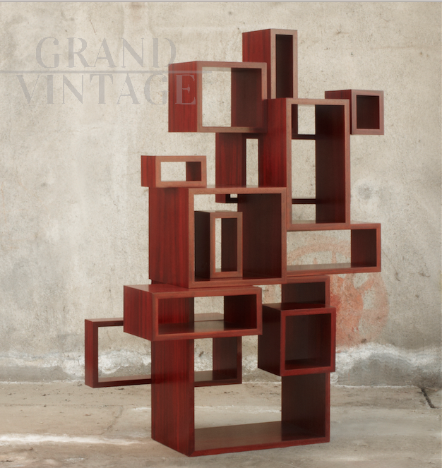 Design double-sided bookcase, perfect as a room divider, with an asymmetrical geometric line, is made of wood in shades of red. The bookcase is of Asian origin, built in a single copy by Atelier Mo.ba. of Como. Perfect bookcase, purchased in 2015 directly from the manufacturer.