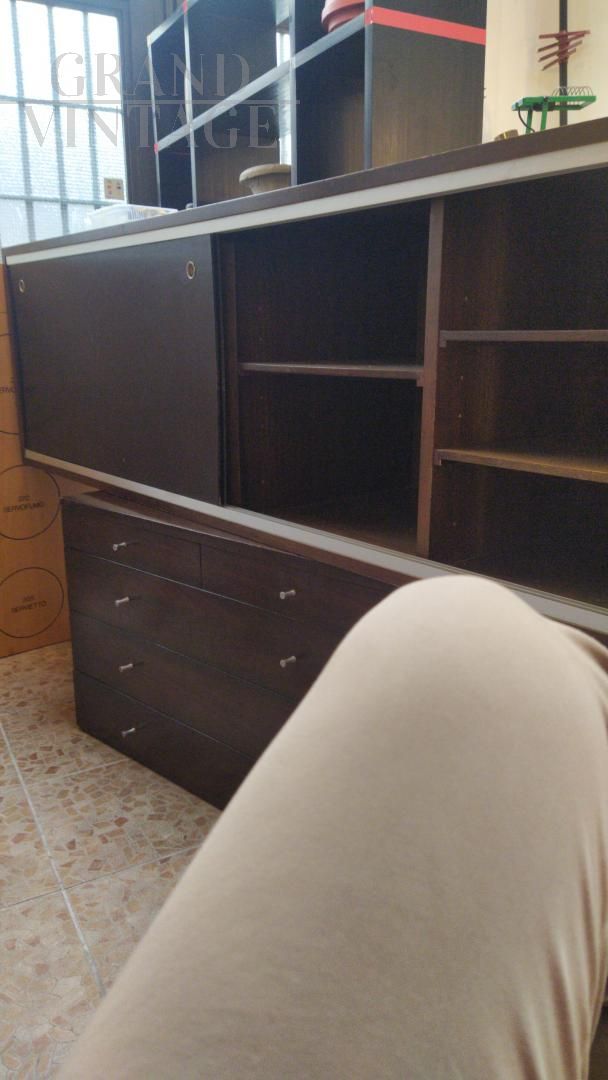 George Nelson bookcase for Herman Miller consisting of 6 teak shelves with width 90 cm, a chest of drawers with width 90 cm, a sideboard with width 180 cm, 4 guide rails. Teak panels are not available.