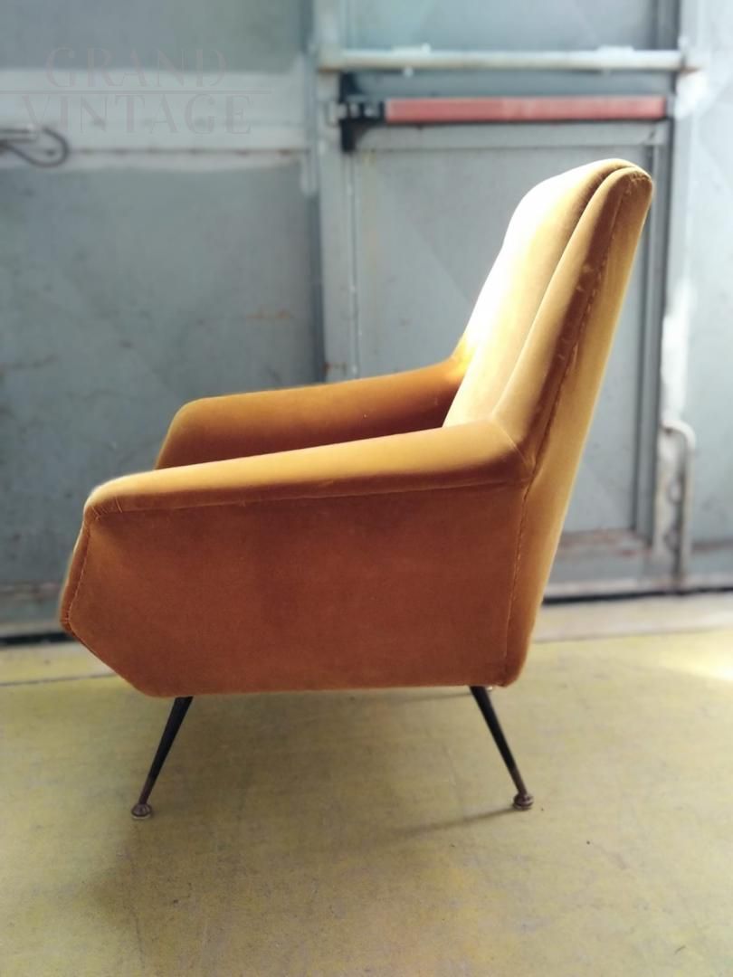 Large 1950s armchair by designer Gigi Radice for Minotti. Vintage golden yellow velvet in very good condition, not worn. Legs in black painted metal with brass feet. Very comfortable.