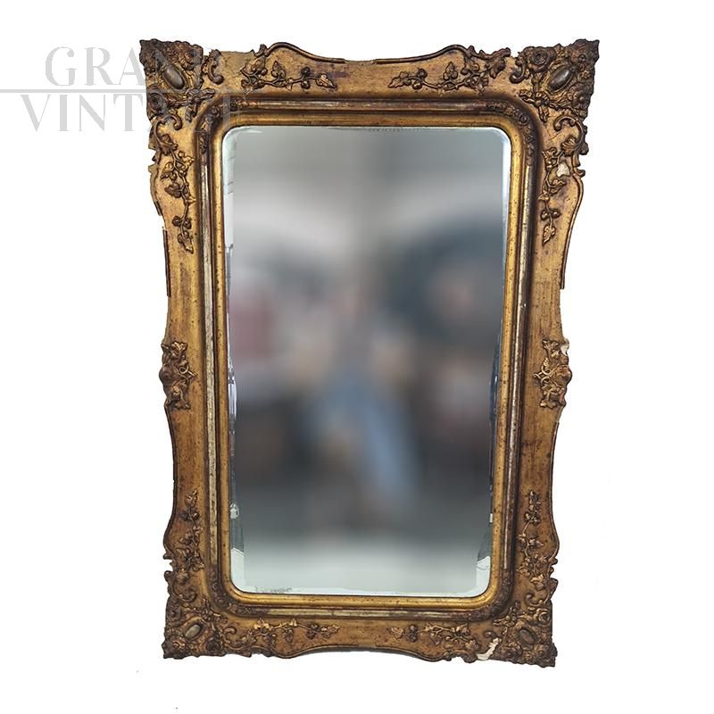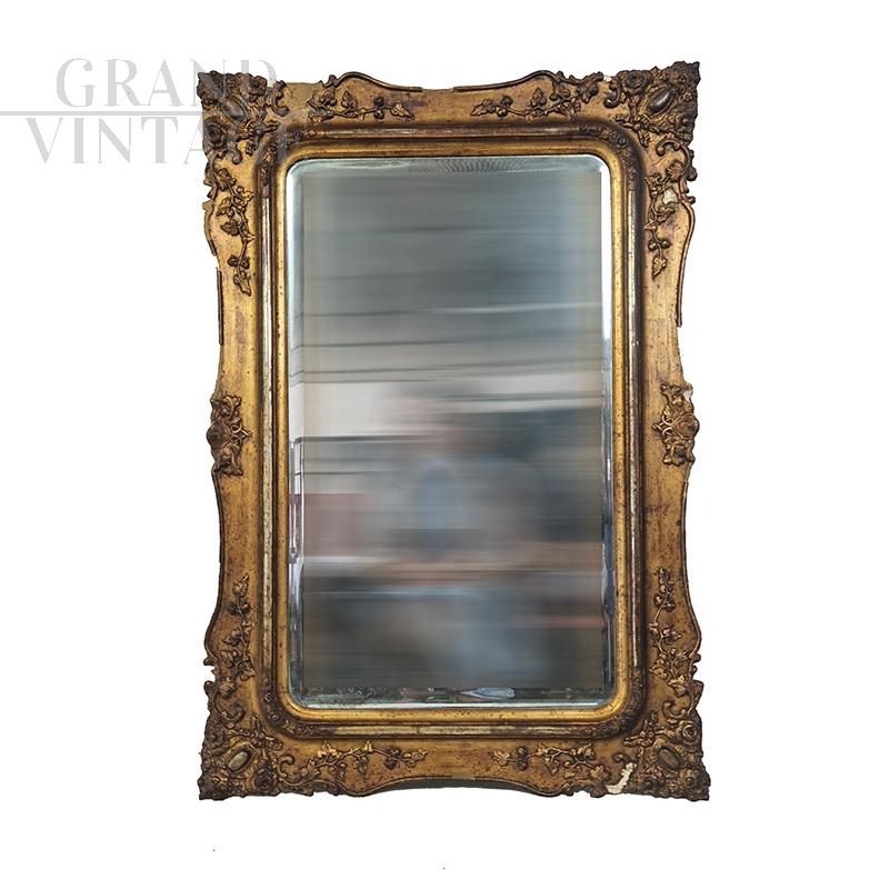 Antique style wooden mirror, gilded and decorated with floral motifs in relief, can be hung both horizontally and vertically.