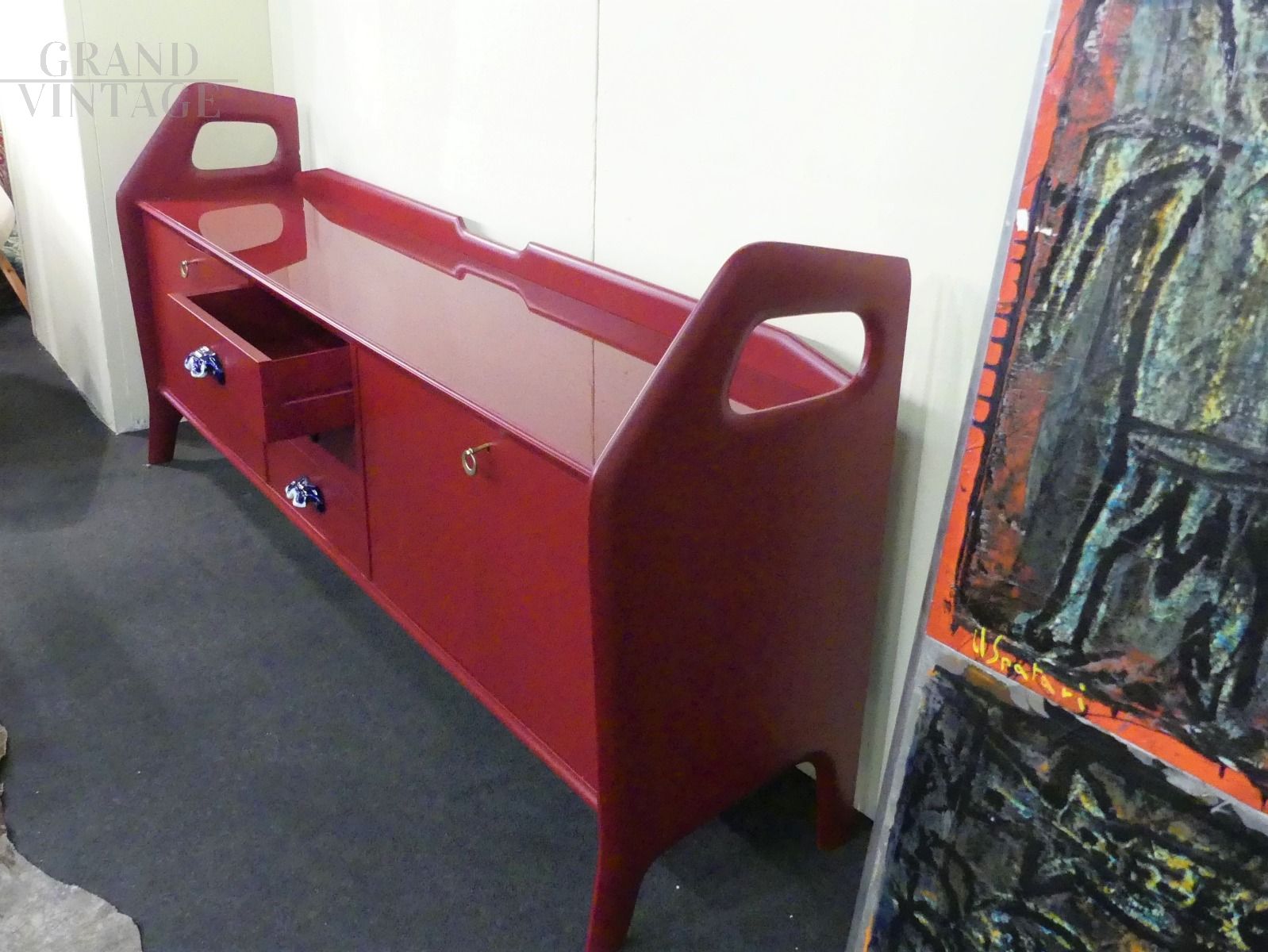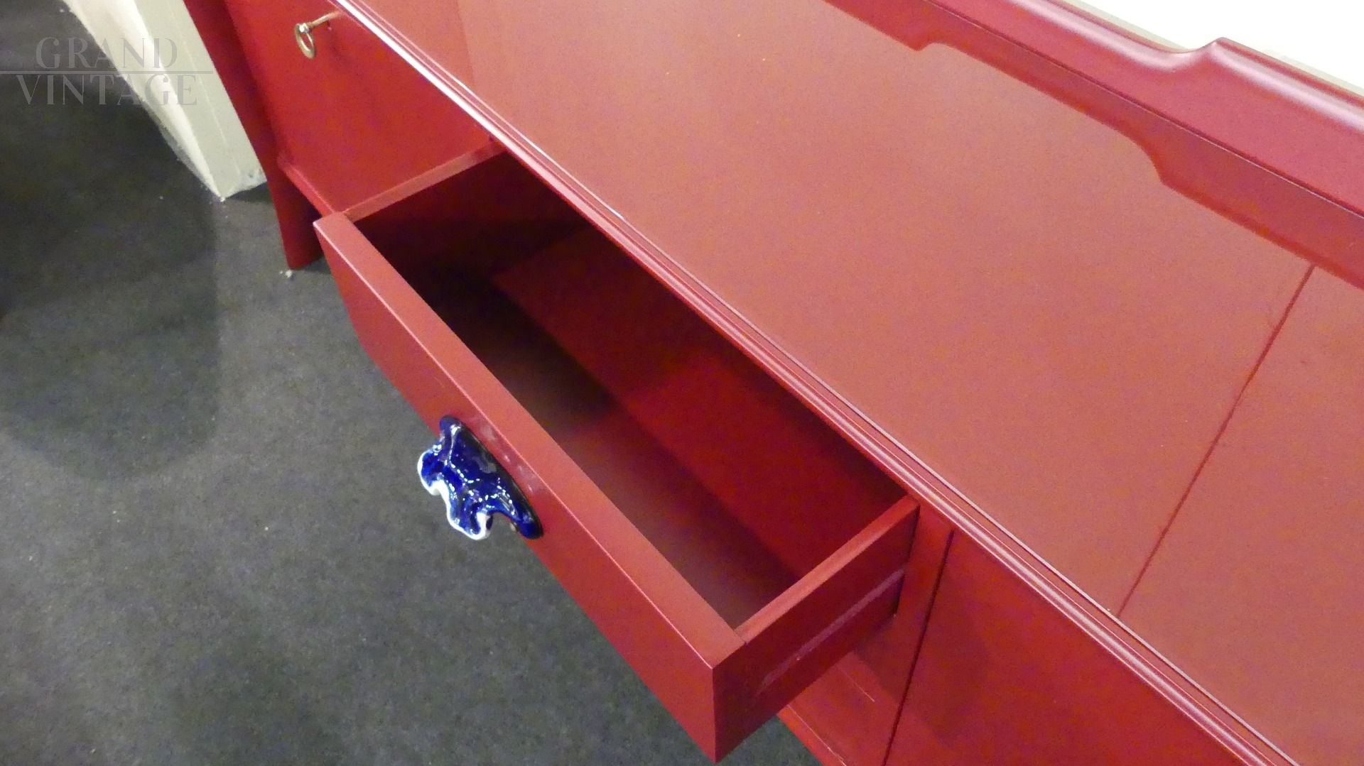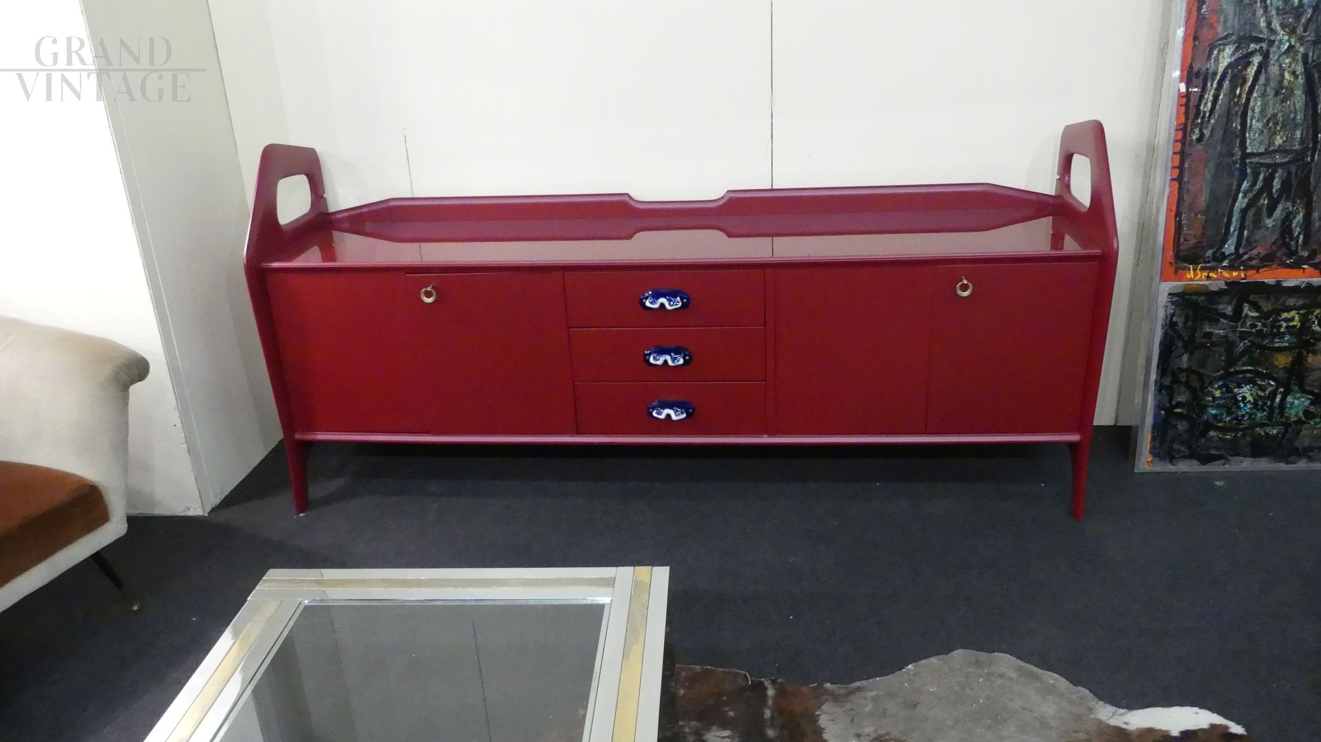 Beautiful vintage low sideboard in the style of Giò Ponti, 1950s, in matt red lacquered teak wood, with red back-lacquered glass top and precious original handles in white ceramic with blue details. Possibility of adding a second glass top, originally planned to be interlocked above the top. With working locks, a true design item capable of changing the personality of the environment in which it is placed.