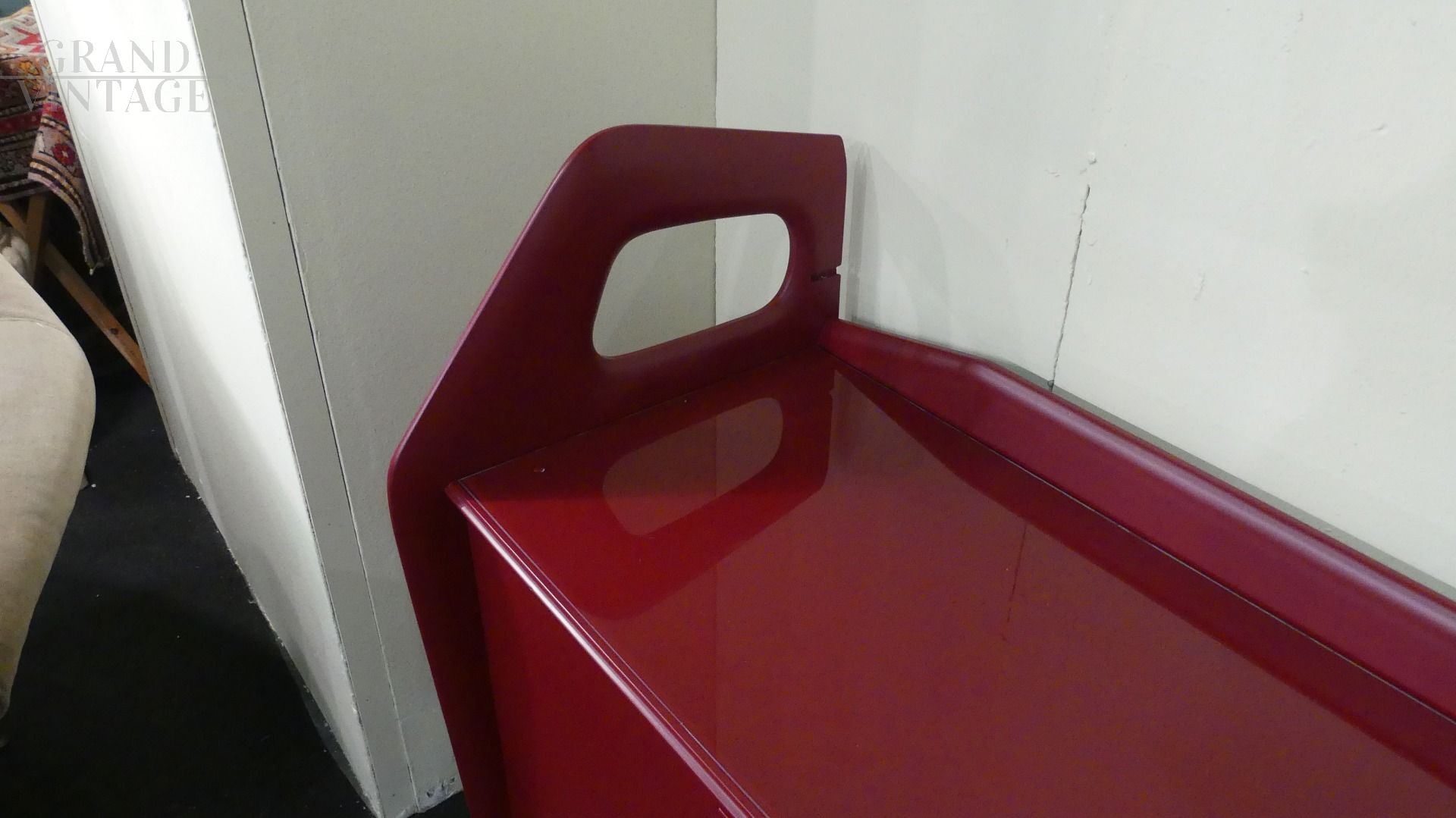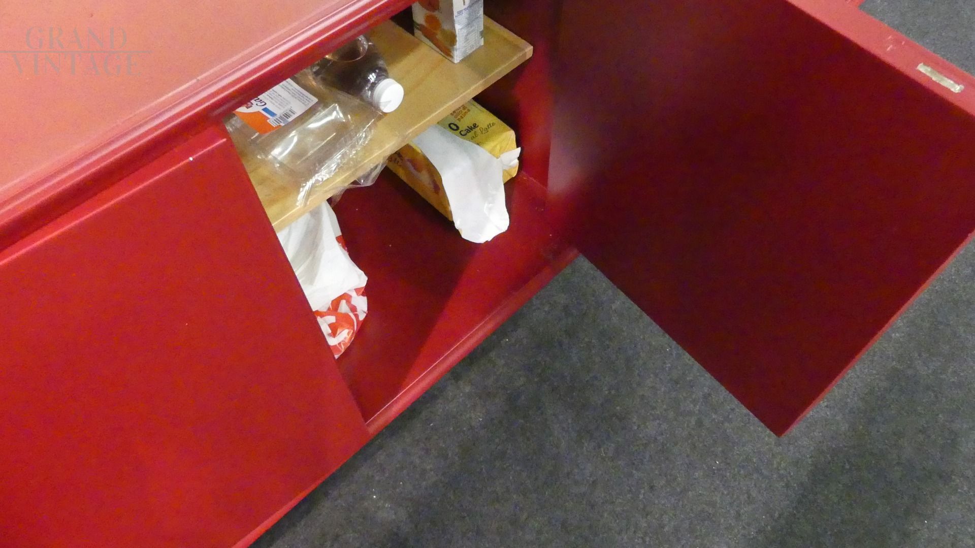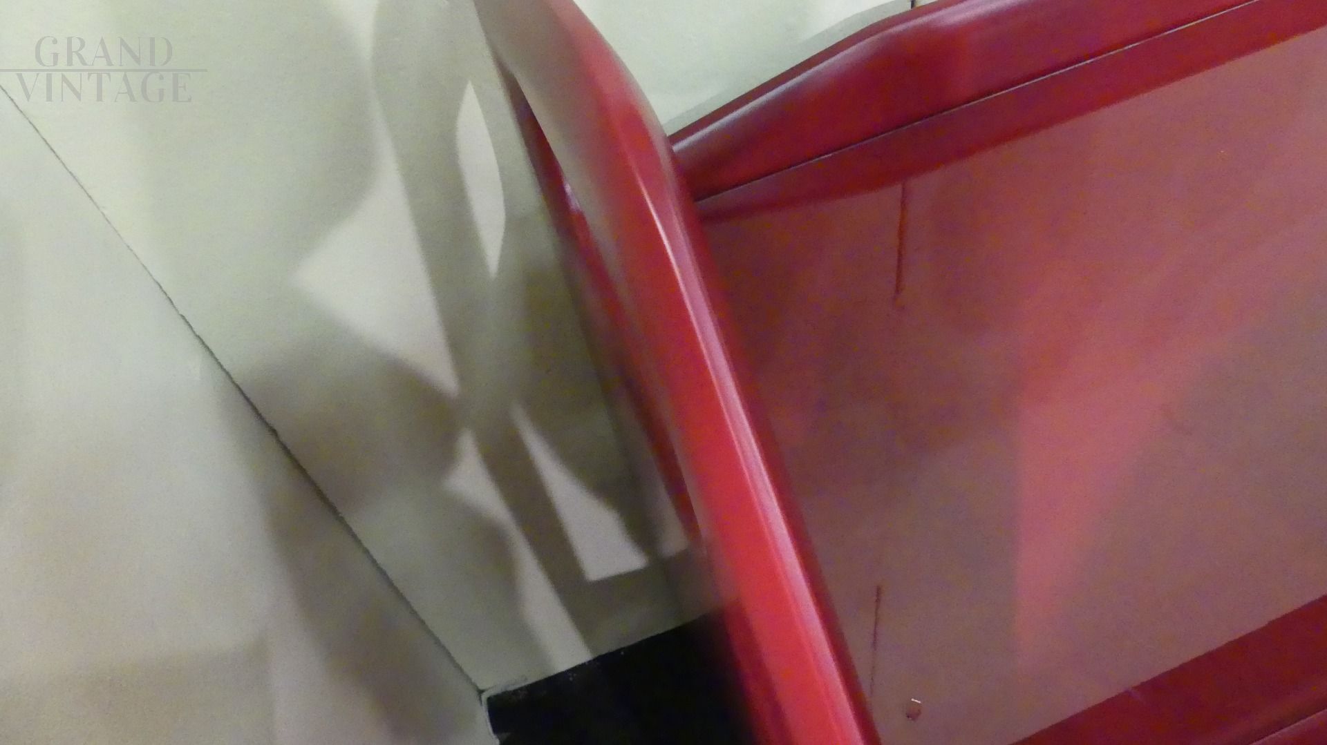 Beautiful vintage low sideboard in the style of Giò Ponti, 1950s, in matt red lacquered teak wood, with red back-lacquered glass top and precious original handles in white ceramic with blue details. Possibility of adding a second glass top, originally planned to be interlocked above the top. With working locks, a true design item capable of changing the personality of the environment in which it is placed.