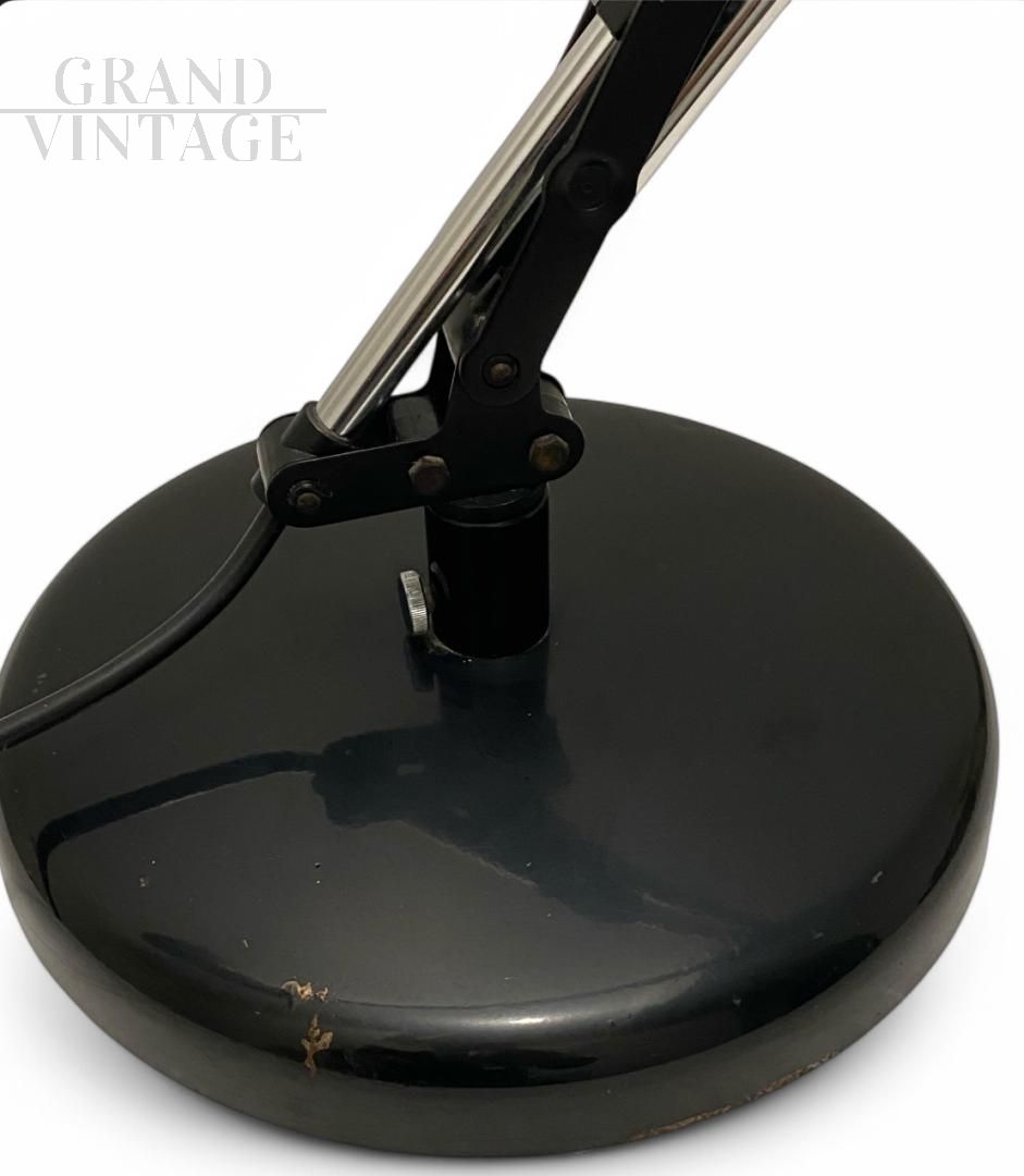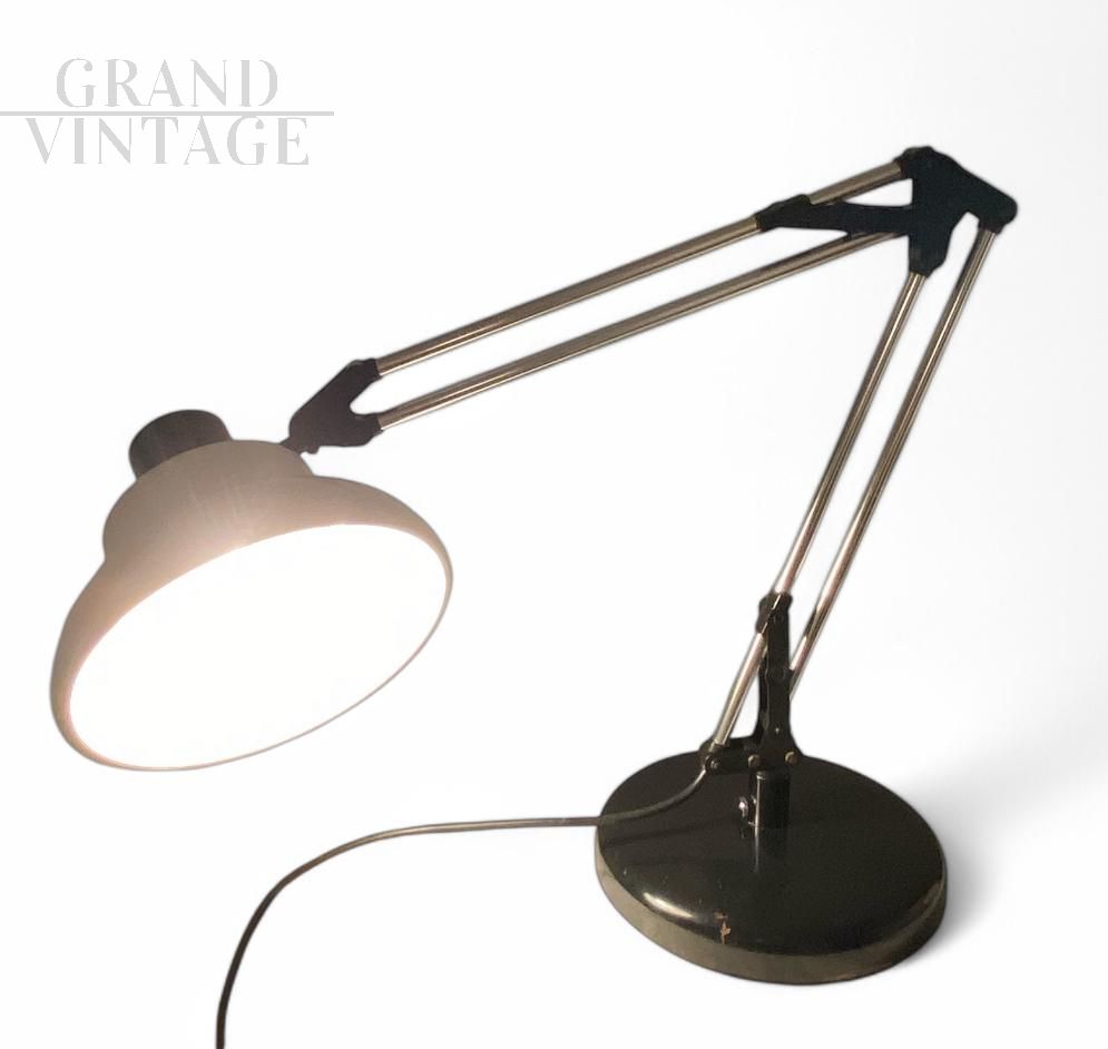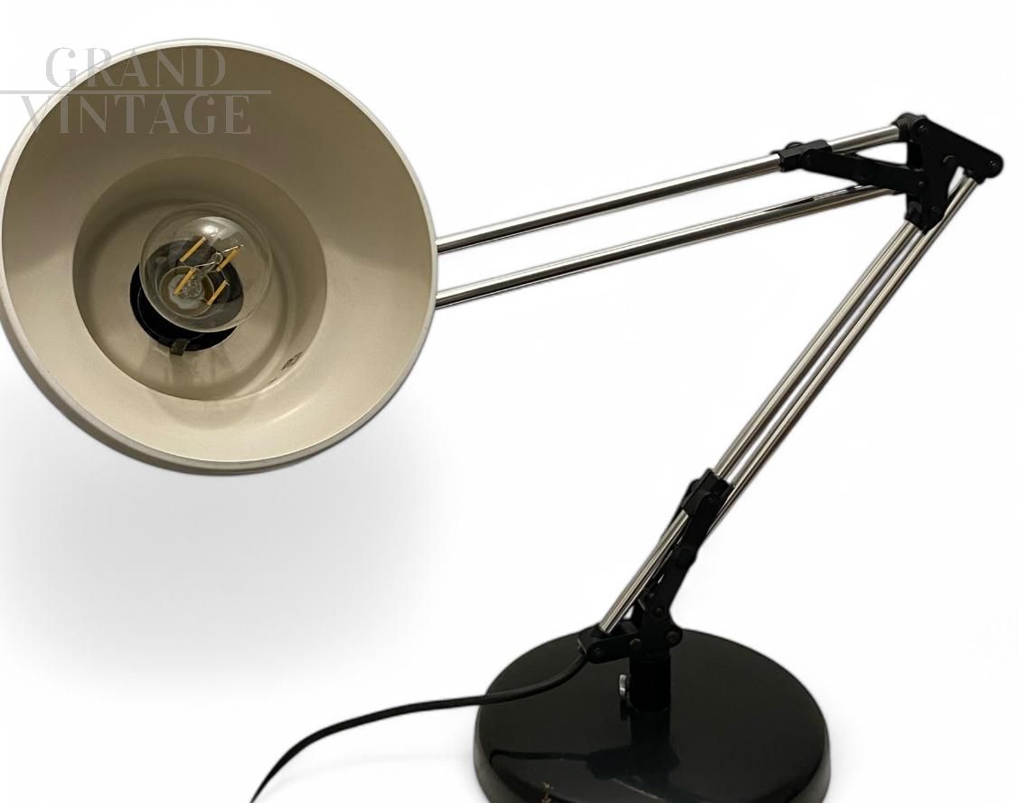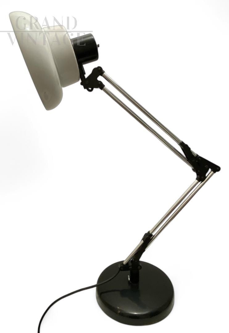 Beautiful Giotto office lamp by Luce e Dimensioni, Italian mid-century modern industrial design from the 70s. This table lamp has an adjustable arm and a metal diffuser. The diffuser measures 20 cm in diameter. Slight signs of wear. The switch has a very simple function: To turn the lamp on or off, you need to rotate the switch.