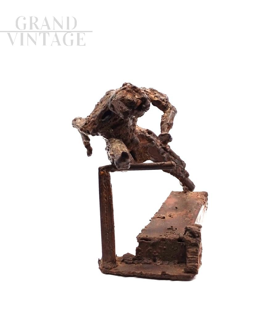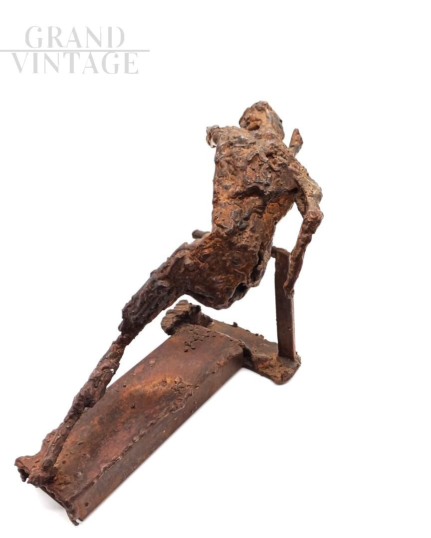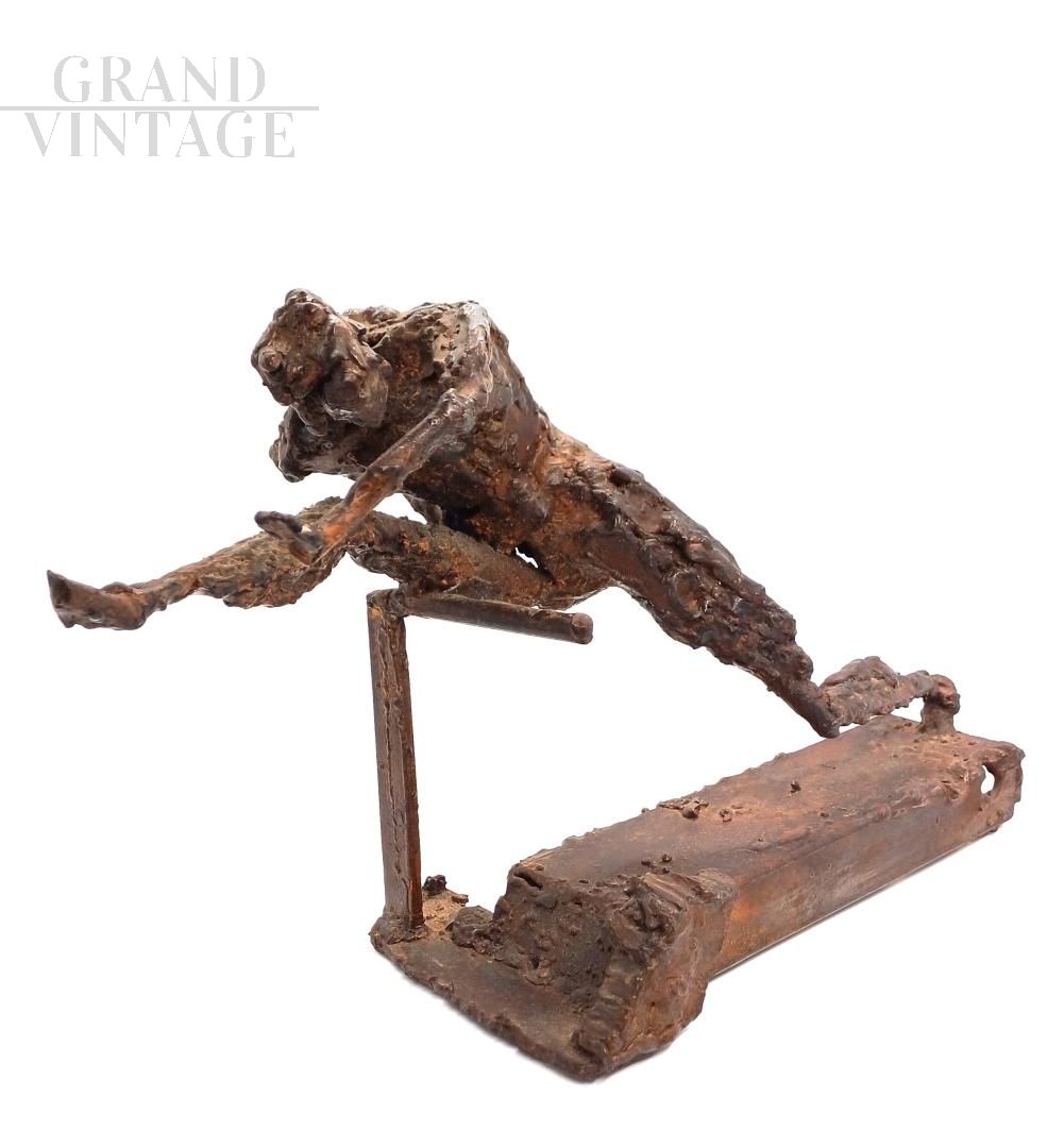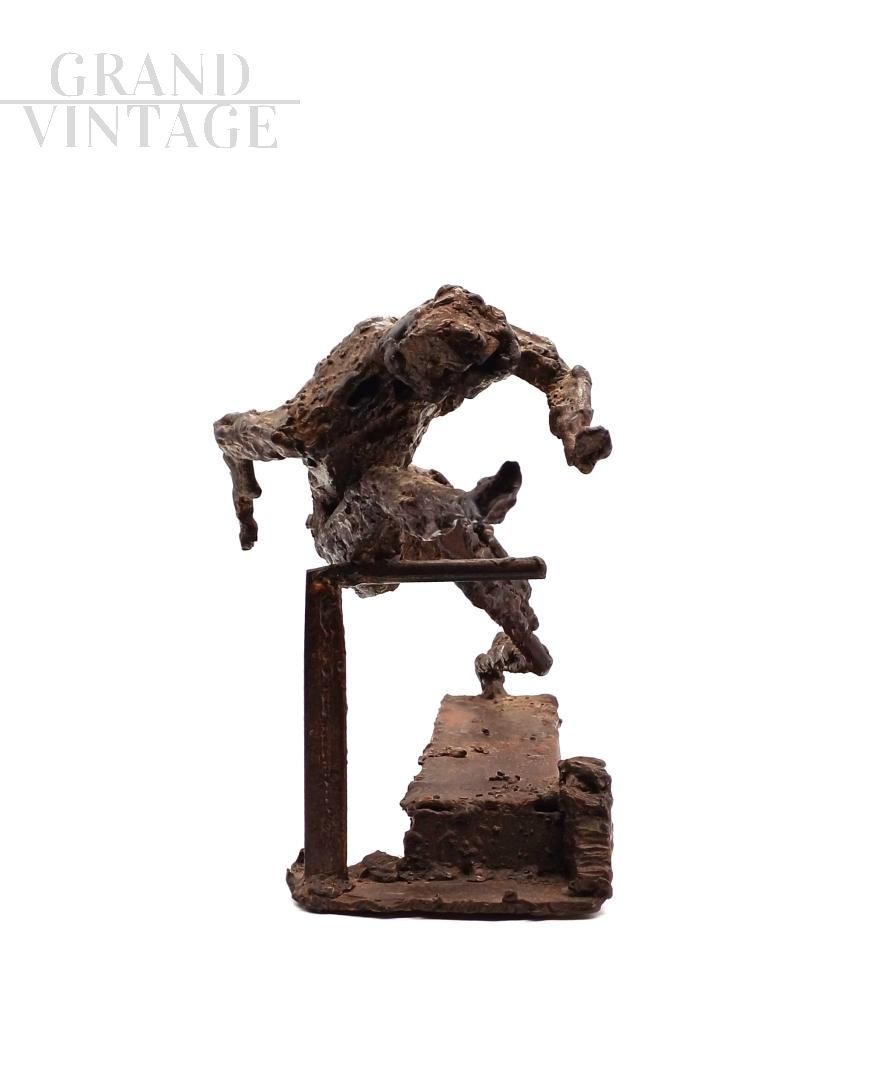 Bronze sculpture with a brown patina by Giovanni Naglia (Ravenna 1895-1968), an artist, sculptor, and painter active during the 20th century. It depicts a stylized human figure in dynamic motion, resting on a rectangular base. The work features a modern composition with geometric shapes and textured surfaces that highlight the contrast between smooth and textured areas. The figure appears to represent an athlete or runner in action, with a sculptural language influenced by Futurism and Art Deco. Signed at the base. Original condition, intact.