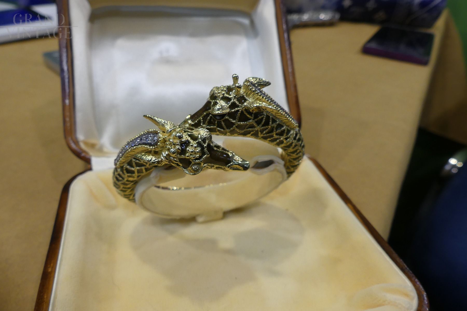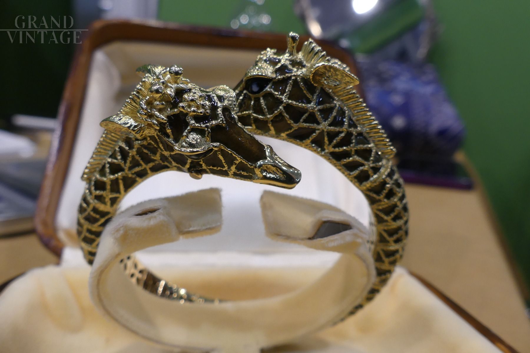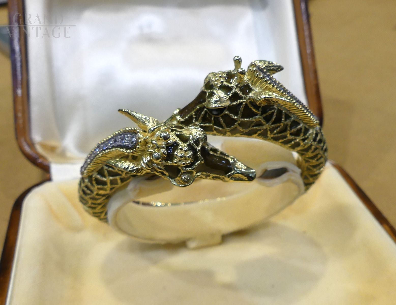 Beautiful Frascarolo bracelet with giraffes in 18 kt yellow gold and 0.80 carat diamonds, with fired enamel details, original made in the 1970s, weight 106 grams. The bracelet has a diameter of 5.8 cm on the inside and 7.5 cm on the outside.