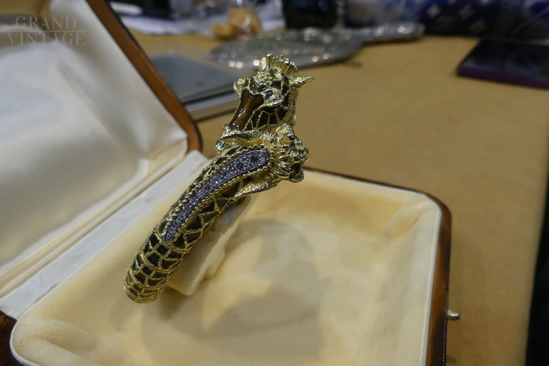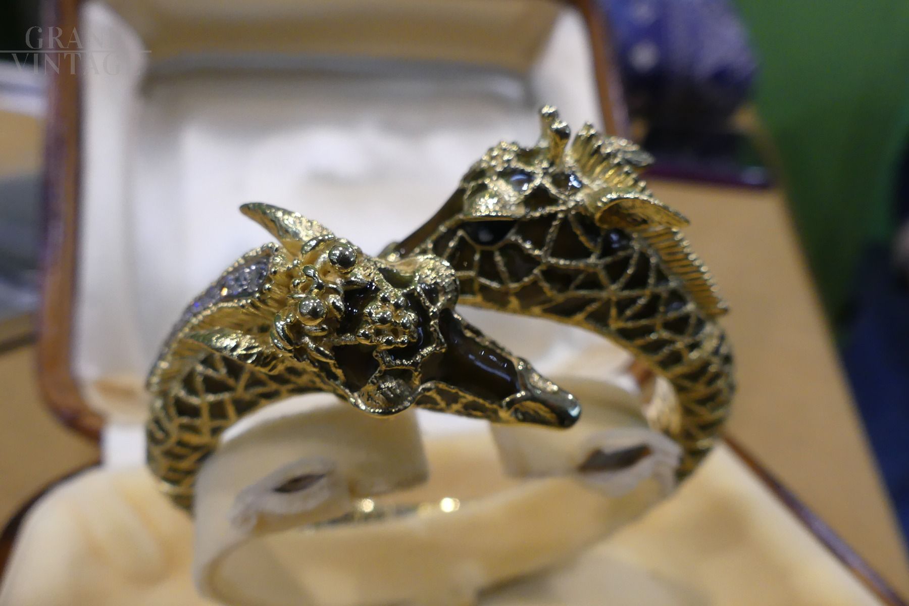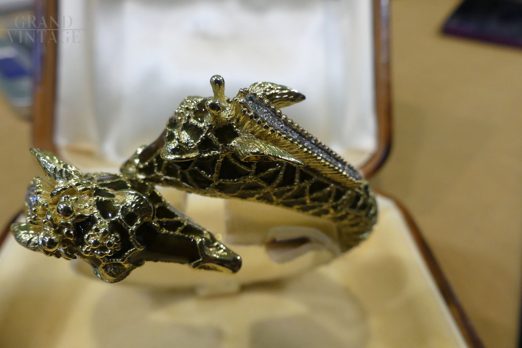 Beautiful Frascarolo bracelet with giraffes in 18 kt yellow gold and 0.80 carat diamonds, with fired enamel details, original made in the 1970s, weight 106 grams. The bracelet has a diameter of 5.8 cm on the inside and 7.5 cm on the outside.