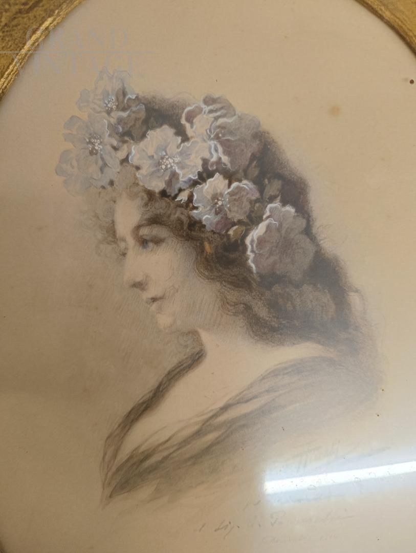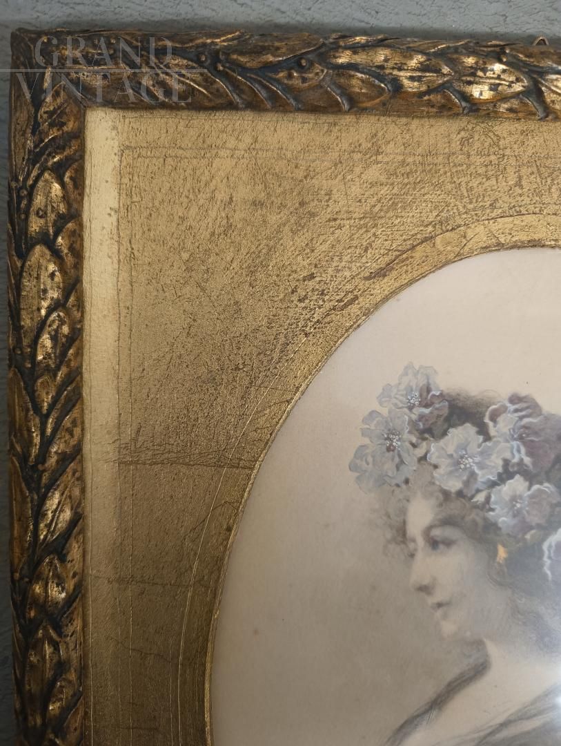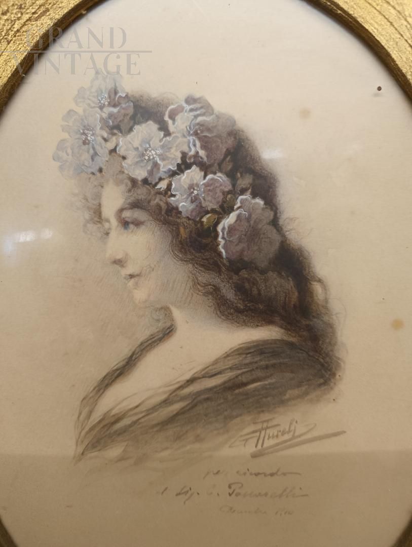 Watercolor painting on paper, of great quality, depicting the portrait of a girl in Art Nouveau style, signed and dated lower right with dedication: Giuseppe Aureli, Rome, 1910, in an antique gilded frame.