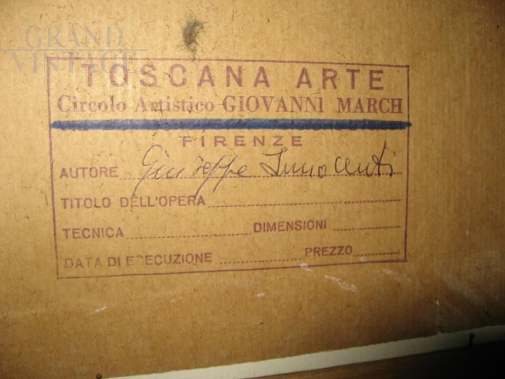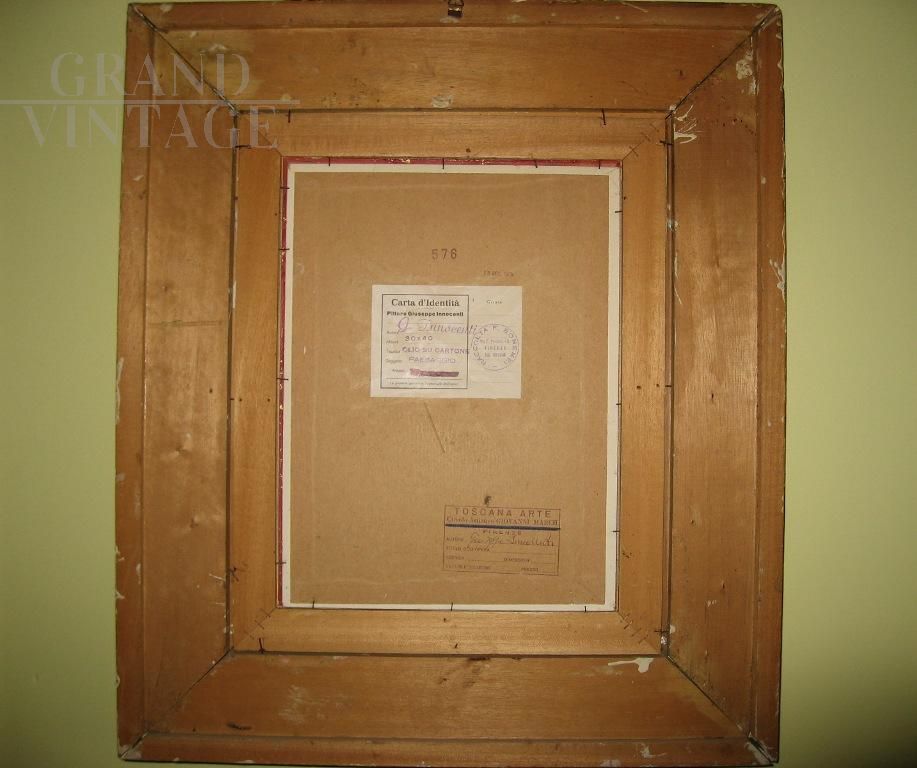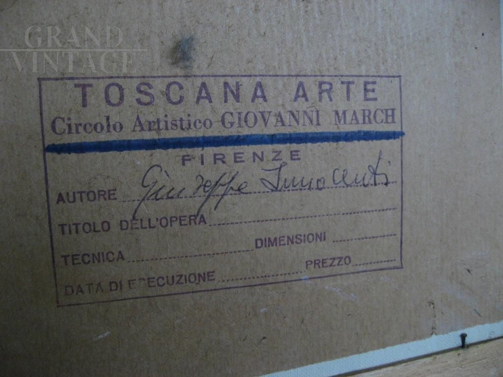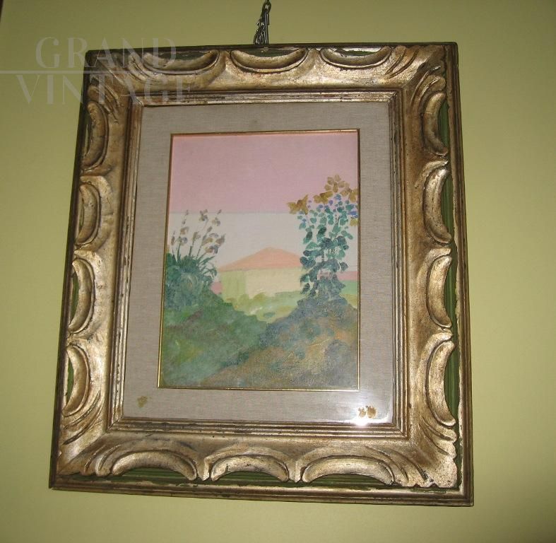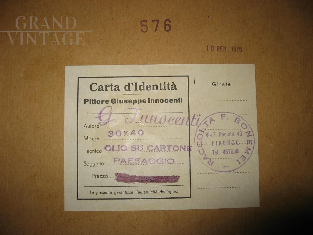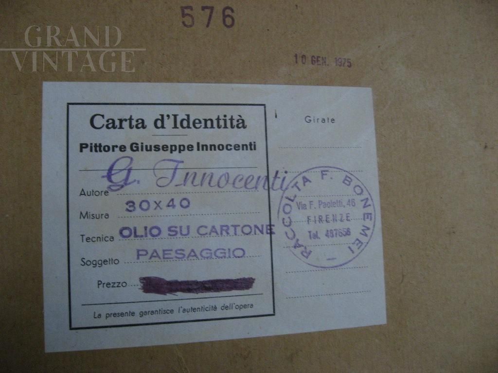 Contemporary painting with countryside landscape by Giuseppe Innocenti, oil on cardboard from the 70s. Giuseppe Innocenti, contemporary artist from Scarperia di Mugello, Tuscany, Italy.