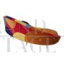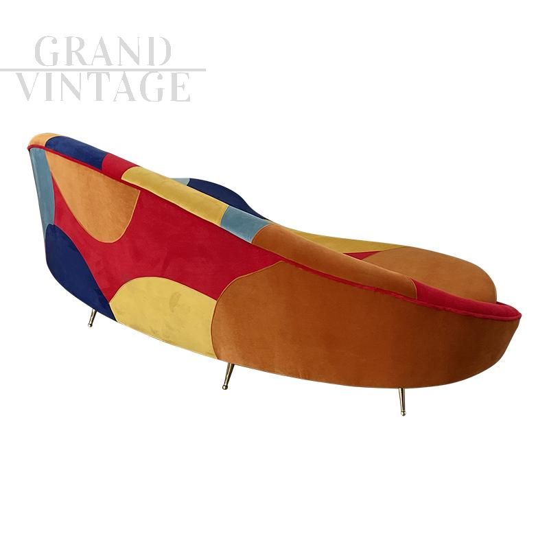 Glamorous curved three-seater sofa in retro style, with wooden structure, padded and covered in multicolor fabric with color block patchwork technique in wavy pieces, feet in golden brass. The sofa is equipped with three multicolor cushions in the same fabric.