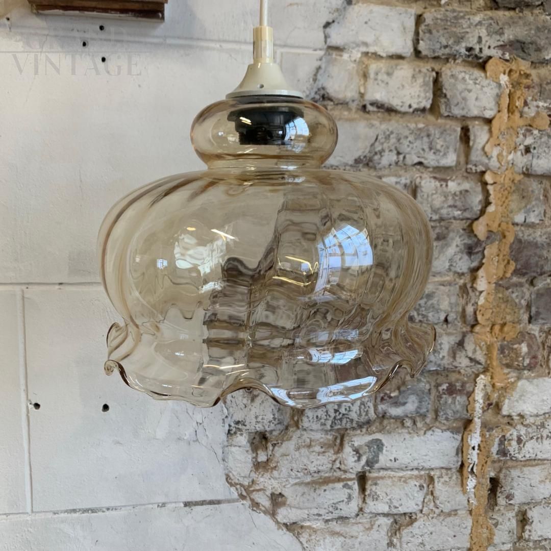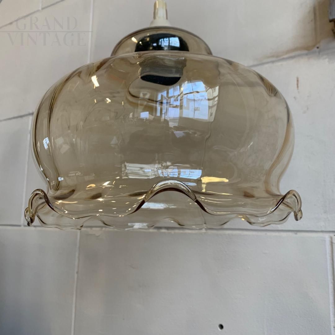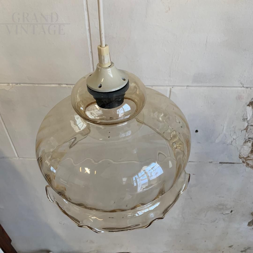Vintage amber glass pendant lamp in the shape of a domed bell, from the 1970s, in good general condition with the natural traces of time.