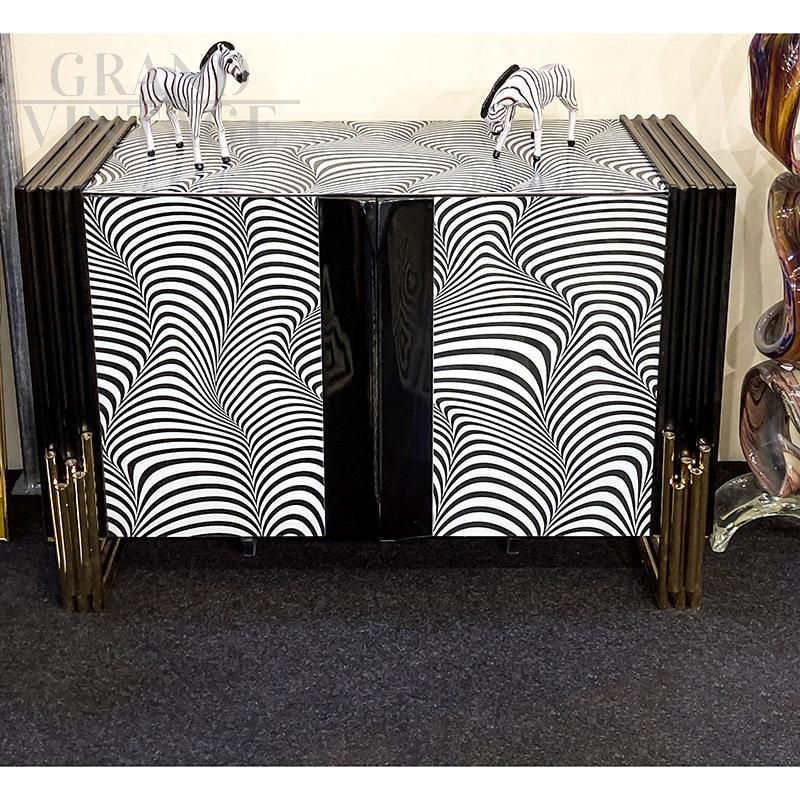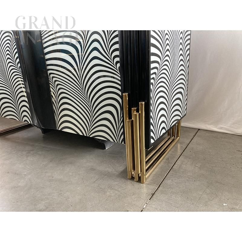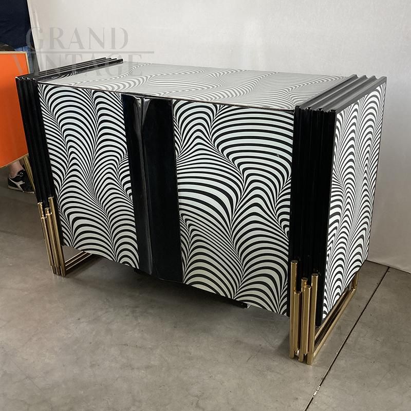 Sideboard with two doors, wooden frame covered with black and white wave-striped glass, black lacquered edge elements, legs in golden steel tubes.