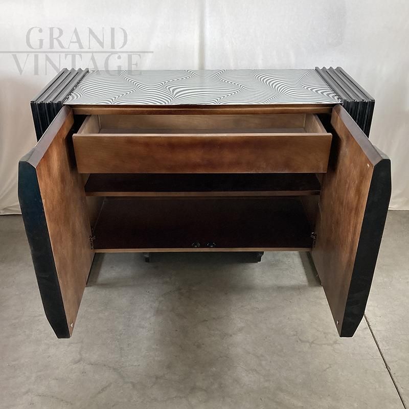 Glass sideboard printed with black and white wave stripes in 3D effect