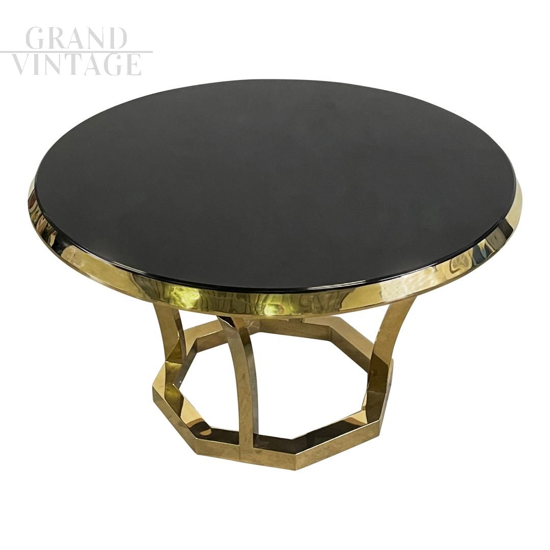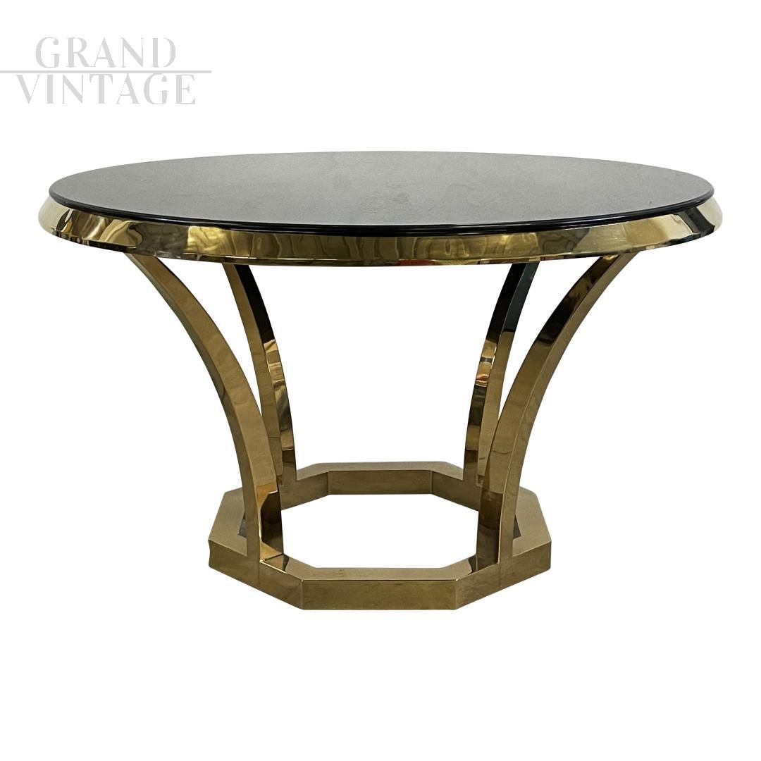 Art deco circular table with square section tubular steel structure and gold chrome plating, and with black glass top.
