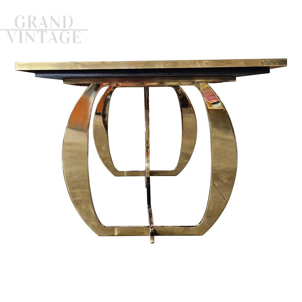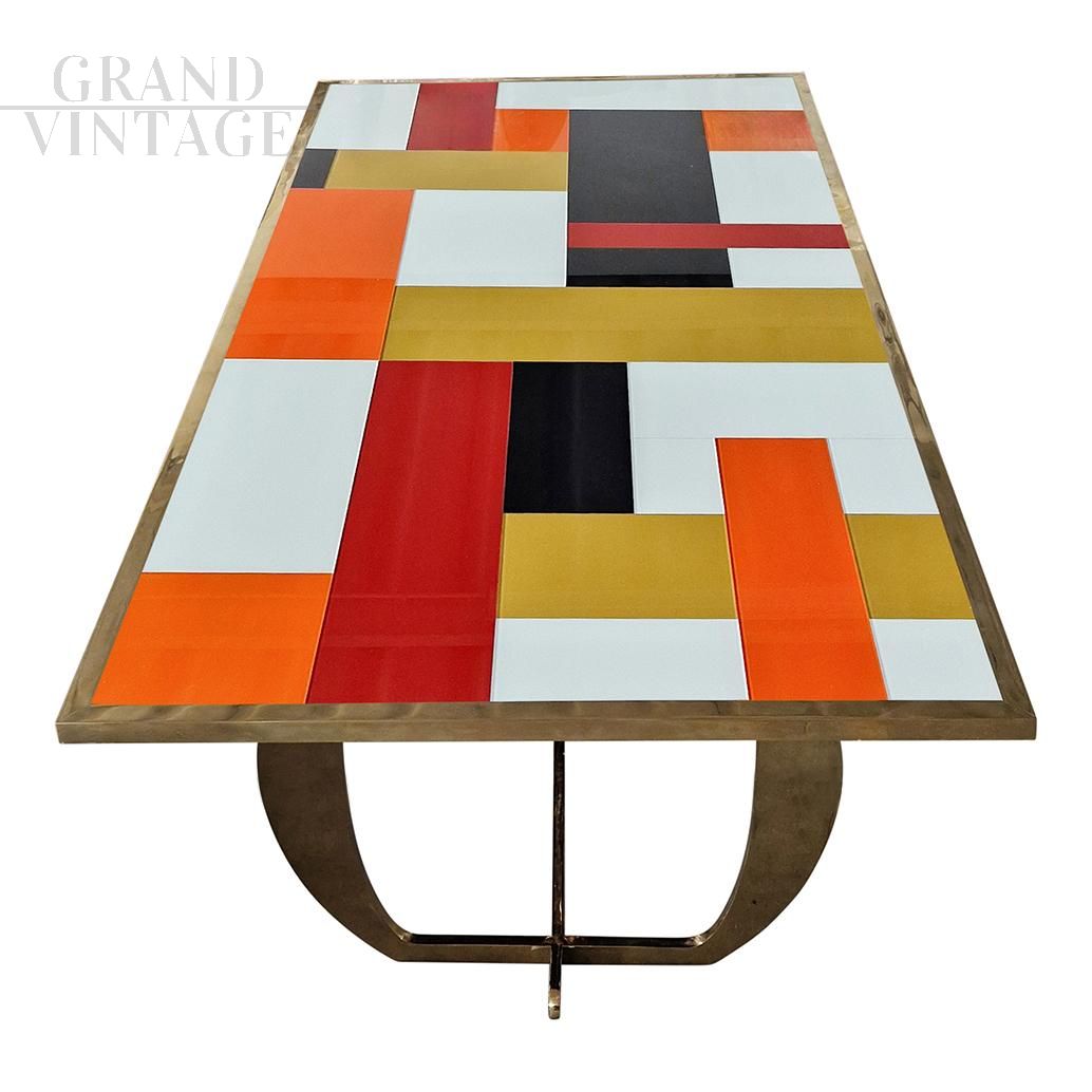 Table with a refined design entirely handmade with gold chromed steel base and colored Murano glass top with Mondrian style square pattern, in warm colours. Golden brass profiles.