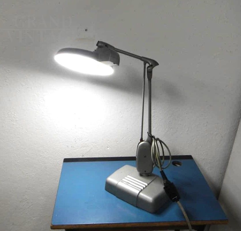 Vintage goldsmith lamp with magnifying glass, in metal and aluminum, industrial style, neon light 22 w. Working, rewired.