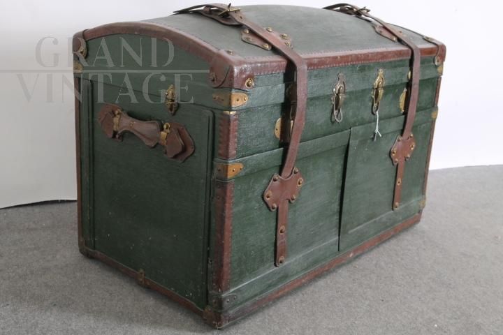 Vintage travel trunk with internal wardrobe, one of the first examples of modern suitcases. Used for long trips in the early 1900s, intact, made with leather details and yellow fabric interiors, equipped with straps, compartments and little drawers at the bottom. Rare design object in excellent condition, ideal for furnishing apartments or shops.