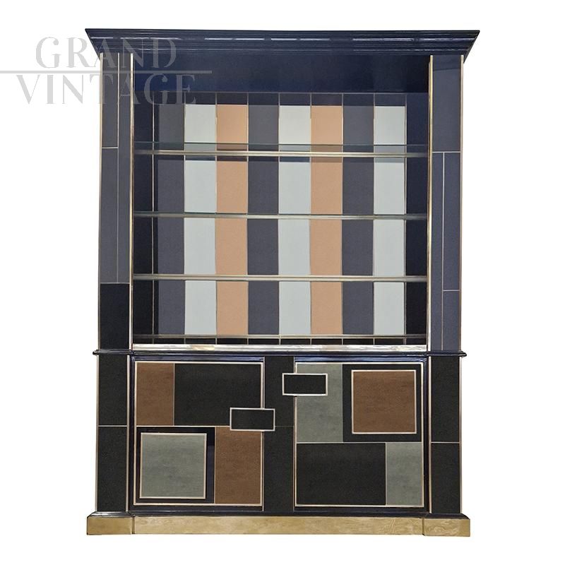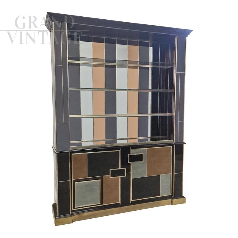 Libreria design a doppio corpo con due ante vetrate, tre ripiani in legno e interni specchiati retroilluminate. Interamente realizzata a mano, con struttura in legno rivestita in vetro nero specchiato. Profili in ottone dorato, base e cornicione in legno laccato nero. Nella parte inferiore tre ante a specchio colorato con maniglie rettangolari in vetro nero. La struttura si illumina con un telecomando.