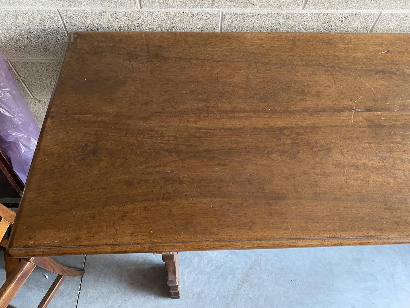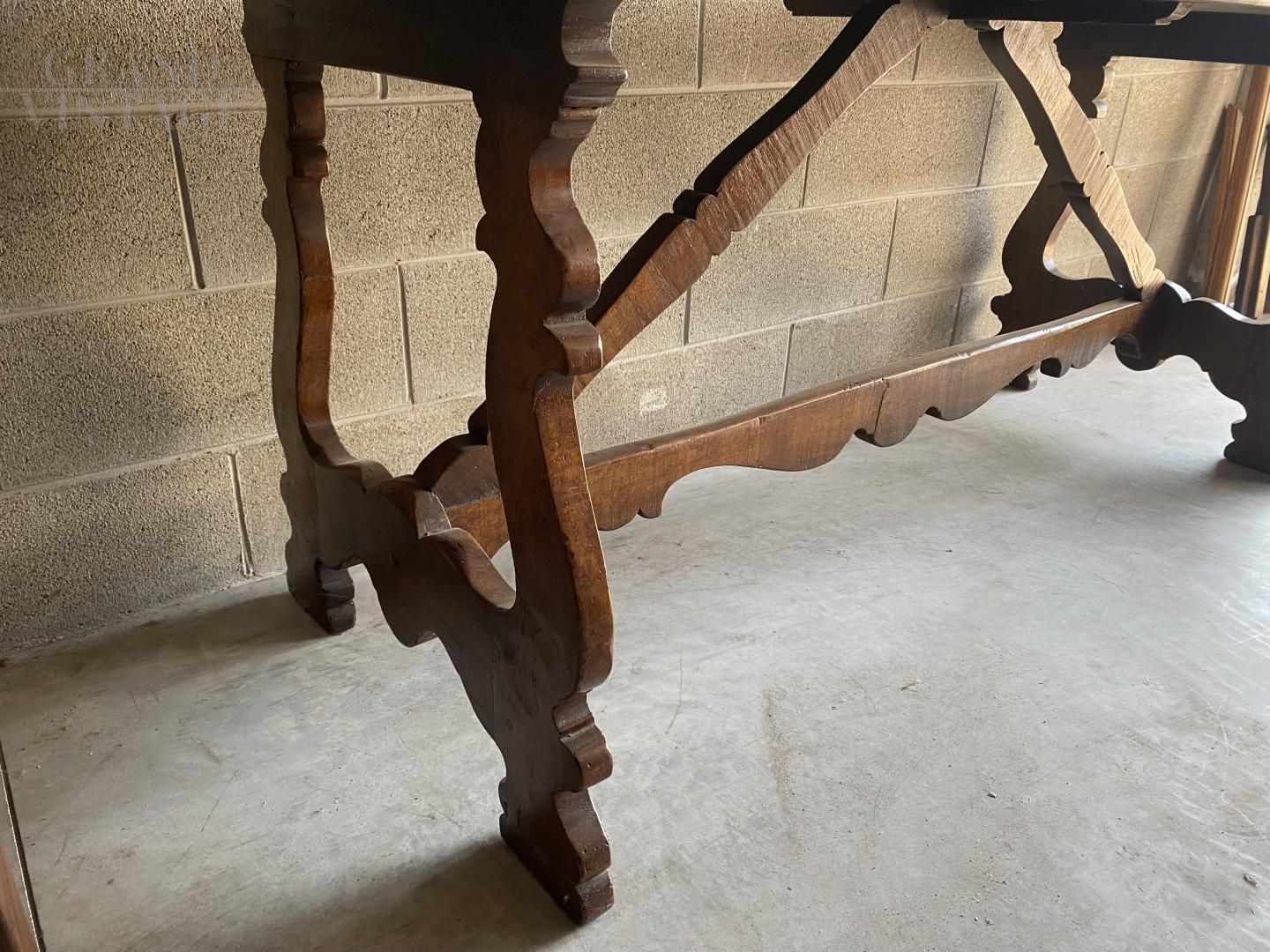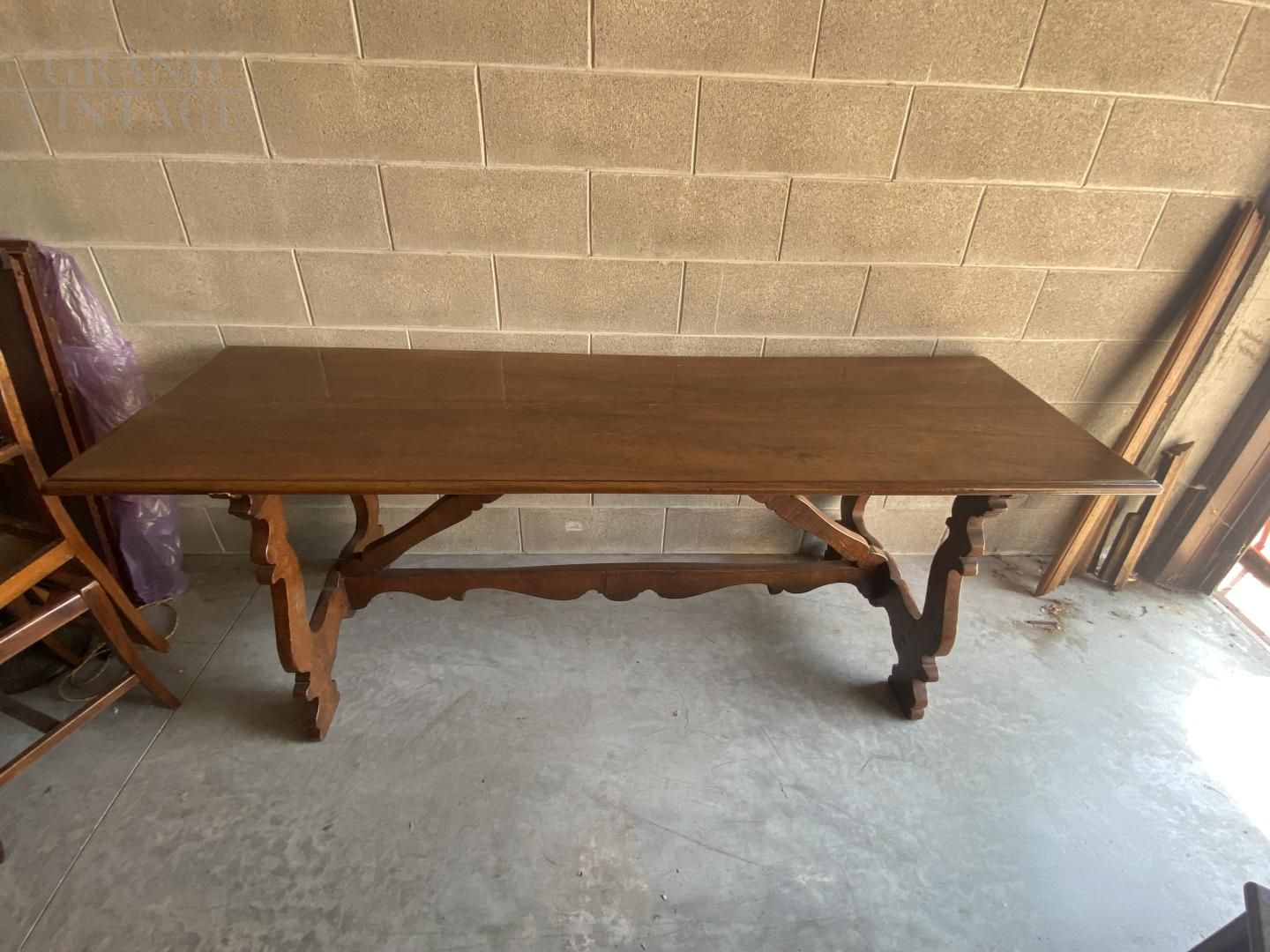 Splendido tavolo fratino in legno massello di noce, intagliato a mano da un maestro ebanista con bellissime gambe a lira che conferiscono una presenza imponente ma allo stesso tempo armoniosa, perfetta per ambienti classici e ambienti moderni che danno un tocco chic. Solido e in ottime condizioni.