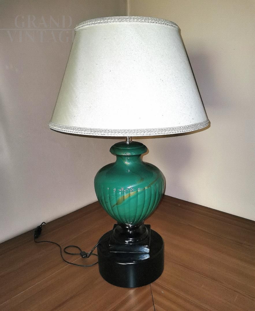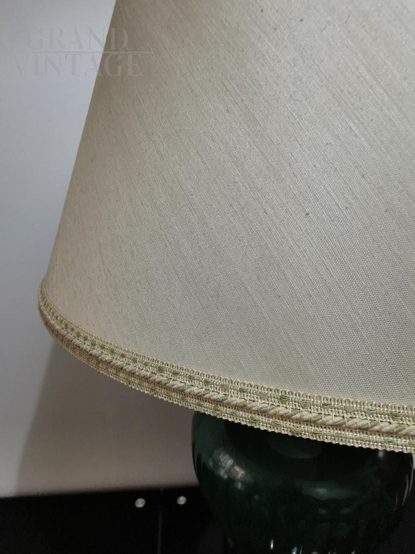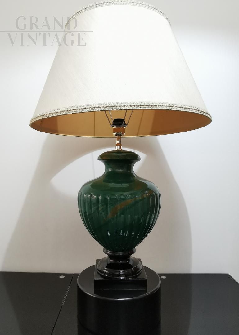 Vintage emerald green ceramic living room table lamp with marbled gold veining. The lampshade is round and made of white canvas. This is a very high-quality Italian lamp from the 1990s. It has some signs of wear, particularly some scratches on one side.