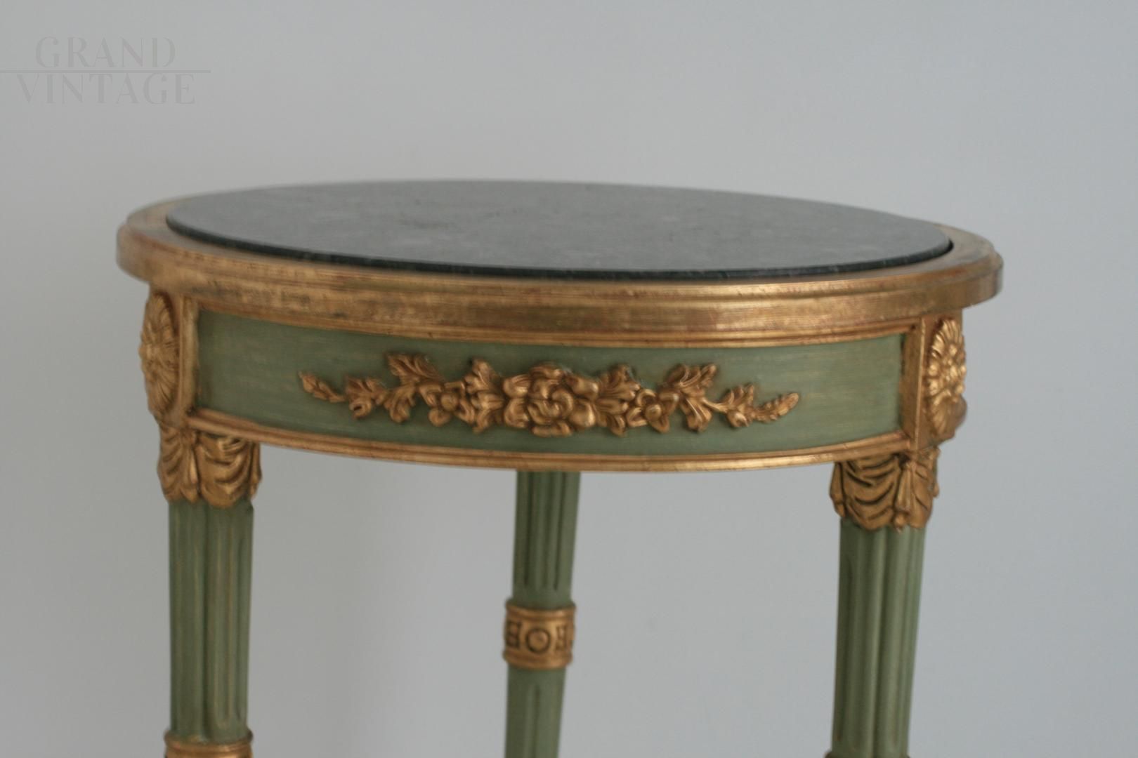 Vintage coffee table made by the Silvano Grifoni company in Louis Philippe style, in solid wood with round marble top, lacquered in green color with gilded carvings, Made in Italy craftsmanship, like new. Diameter 57cm, height 65cm, weight 16kg.
