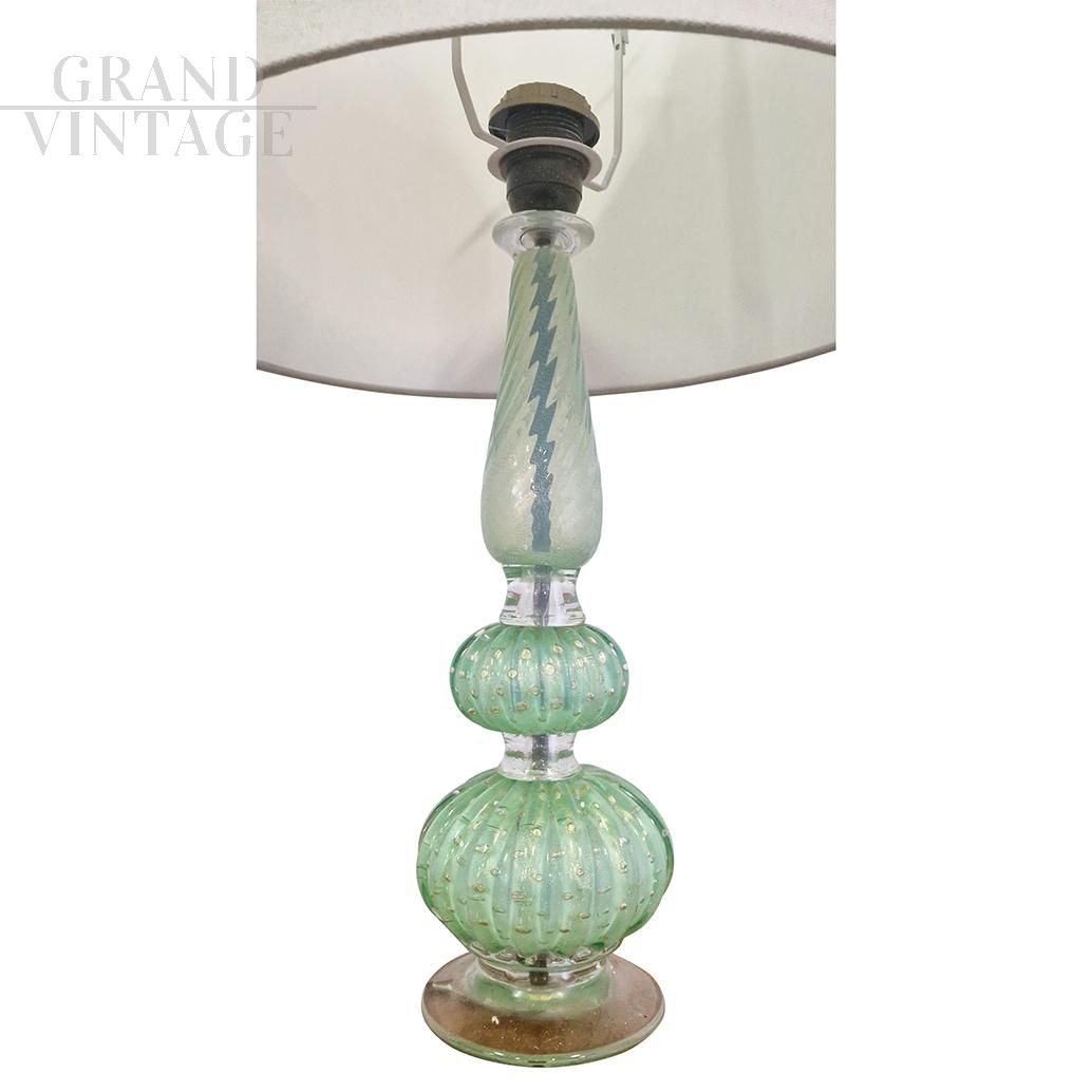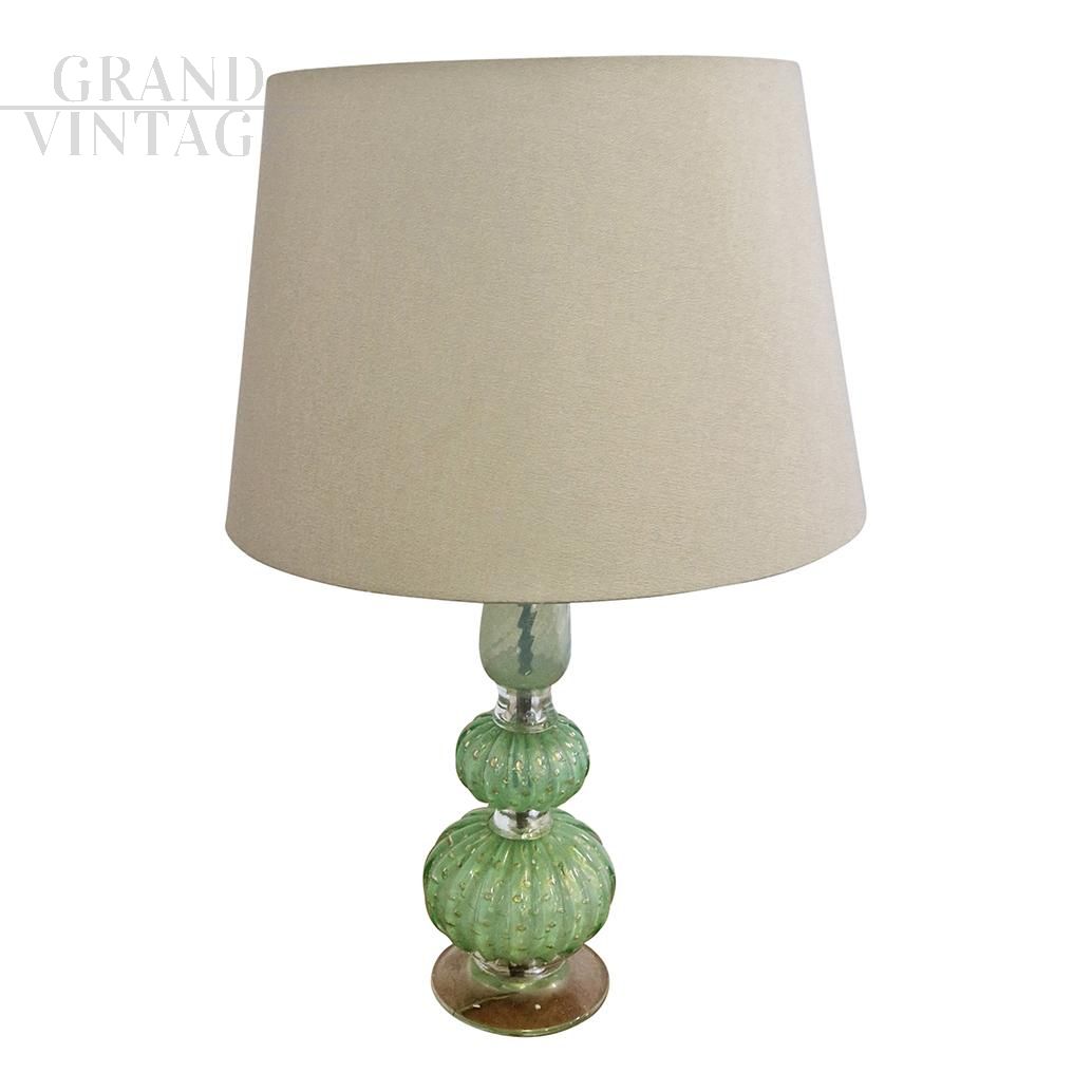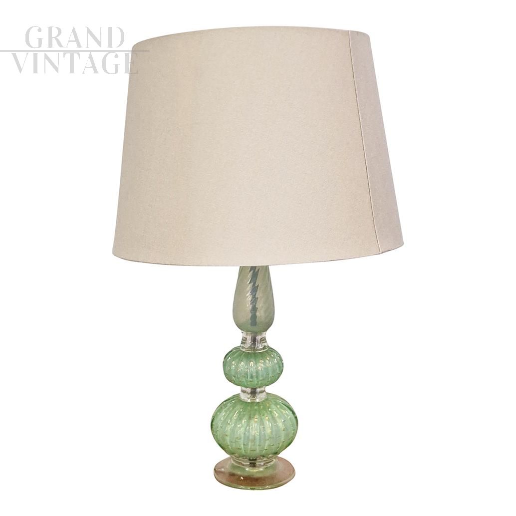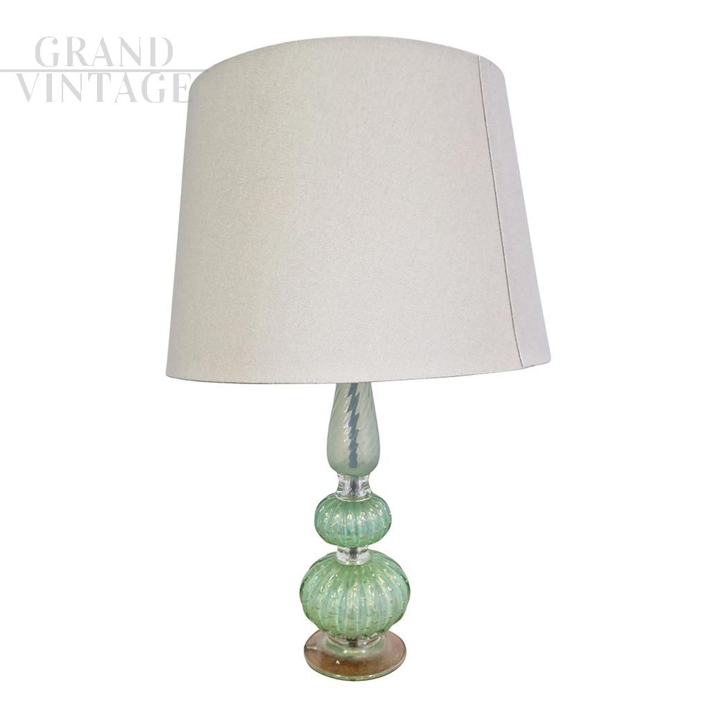 Table lamp abat-jour in light green artistic Murano glass with amber-colored details, with white fabric lampshade, working with an E27 type bulb.