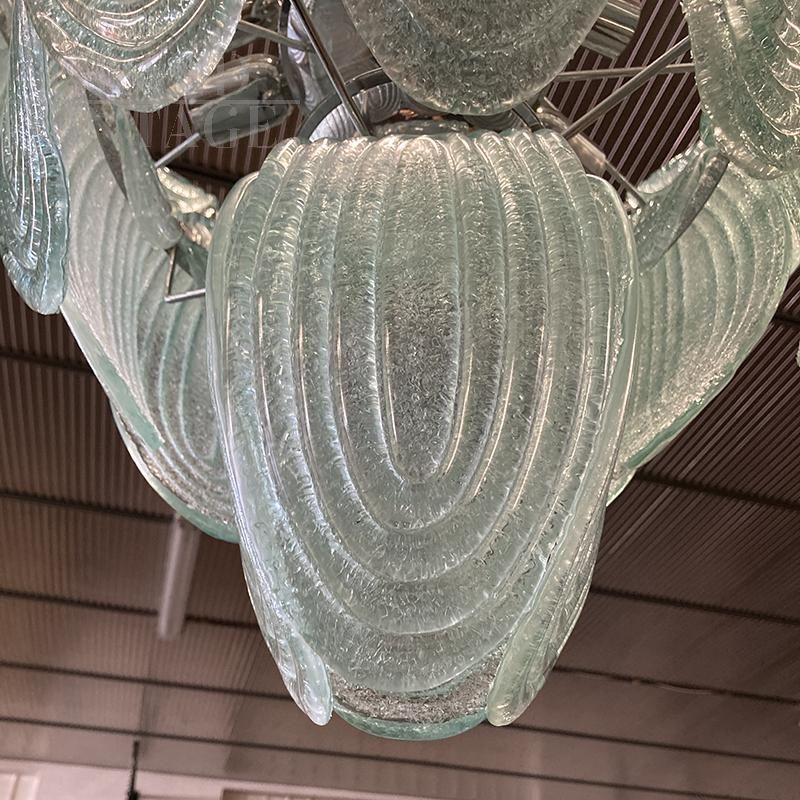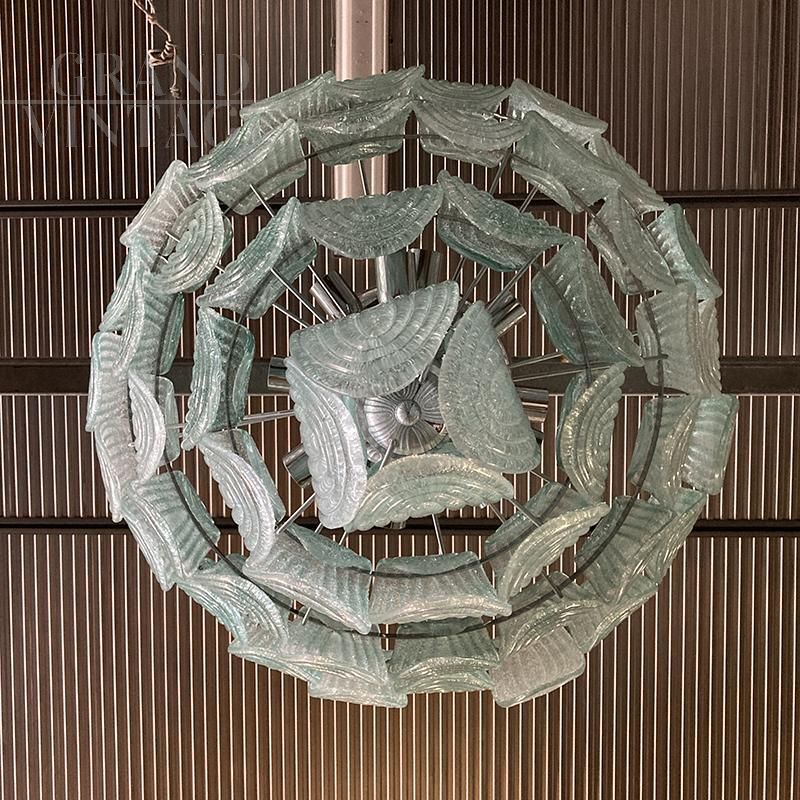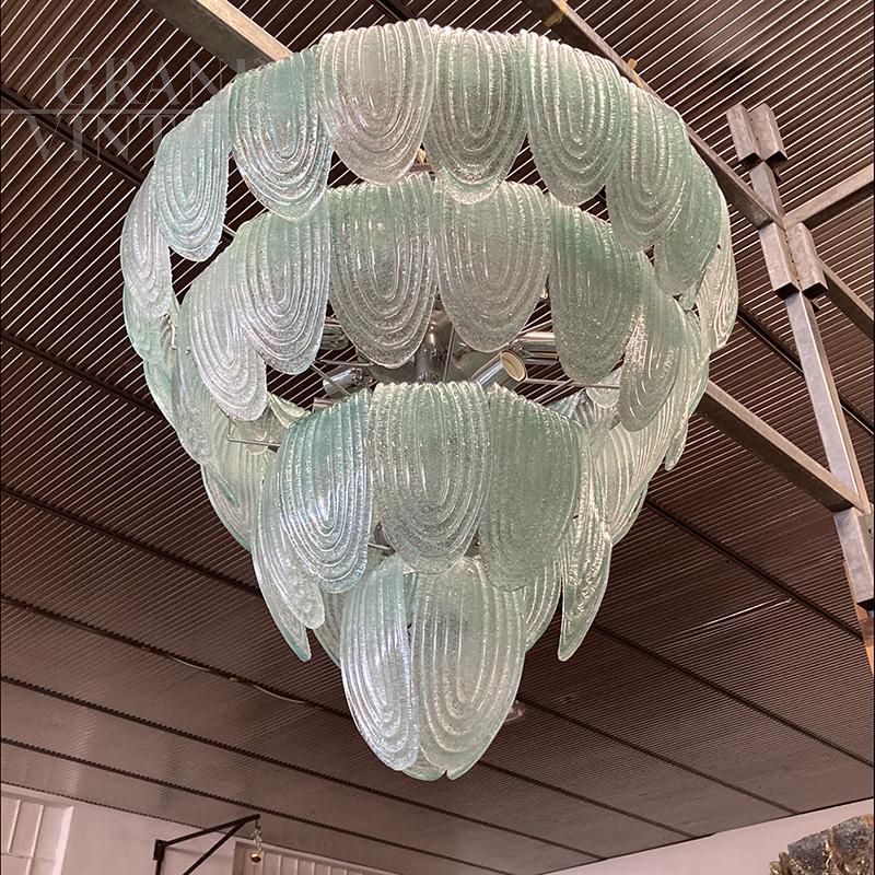 Cascade chandelier in green Murano glass with metal structure, the glasses are arranged on four levels to conceal eleven internal light bulbs. This chandelier with a luxurious and elegant design is a true work of art capable of giving an extra touch to the aesthetics of any space.