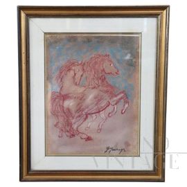 Artwork created on leather by the Italian Lombard artist Gregorio Mancino, famous throughout the world for his hearts, depicting a horse. A curious and innovative technique that the artist wanted to experiment in the 80s. The painting comes with a certificate of originality signed on the back by the artist himself.
