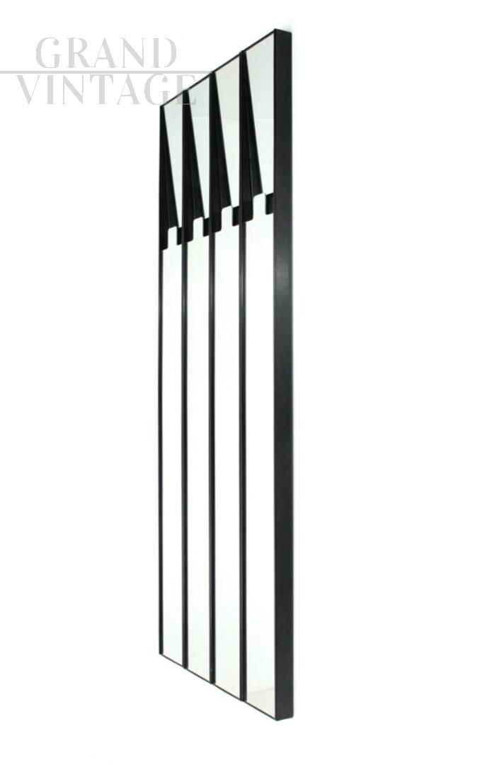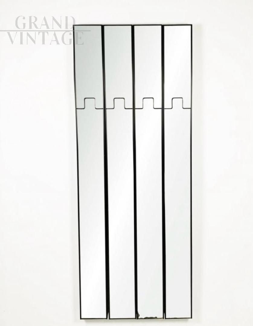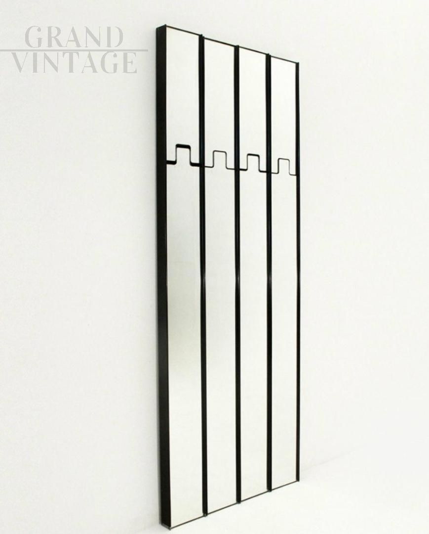 Modular entryway coat rack, design Gronda by Luciano Bertoncini for Elco, composed of four mirrored elements, Italy 1960s - 1970s. The wall part is made up of a brown plastic box; the front has two mirror sections, the upper one springs back to allow you to hang clothes. The structure is equipped with two tracks to hang it on the wall. The four closely spaced elements measure approximately 80 cm wide. There are natural signs of use.