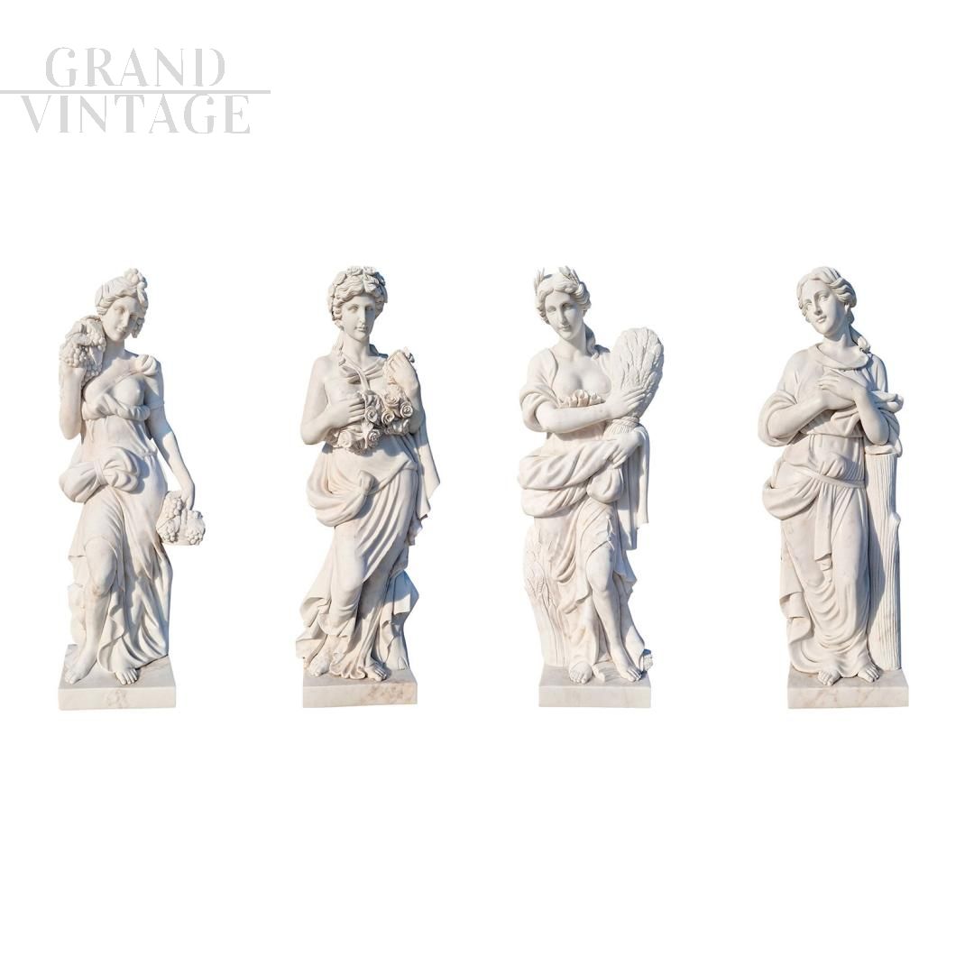 Group of 4 fine white marble sculptures depicting the Four Seasons allegorically represented by female figures, suitable for elegantly decorating a garden. Summer is represented with the ear of corn, Spring with roses, Autumn with grapes and Winter sheltered with a velvety robe.