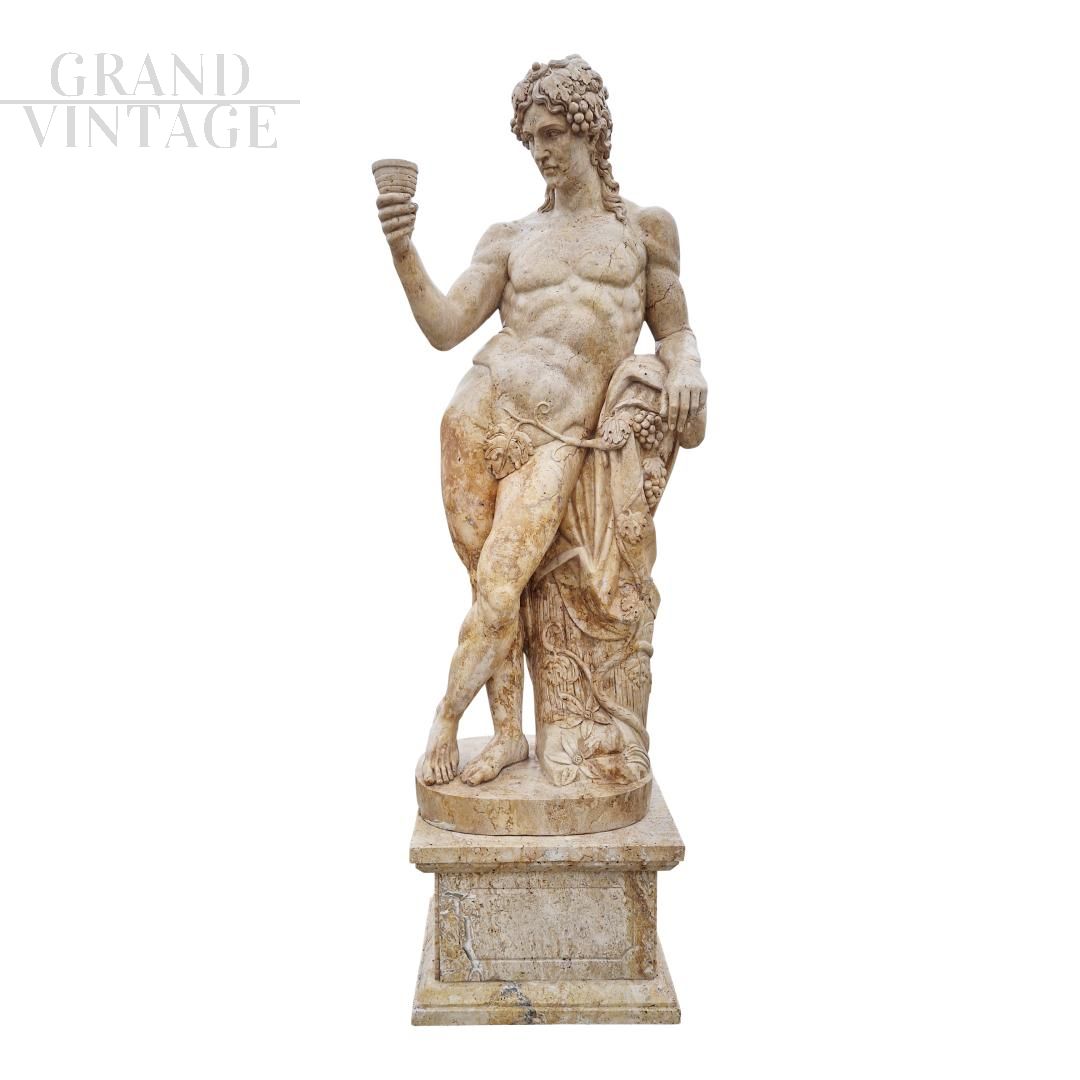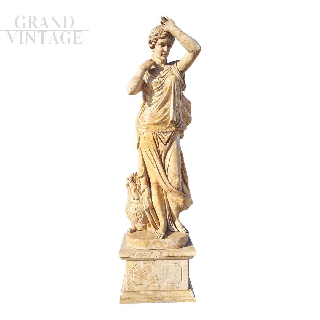 Group of 4 fine travertine marble statues depicting the Four Seasons allegorically represented by neoclassical characters, suitable for elegantly decorating a garden. Summer, the only male figure, is represented with the ear of corn, Spring with roses, Autumn with grapes and Winter with fire.