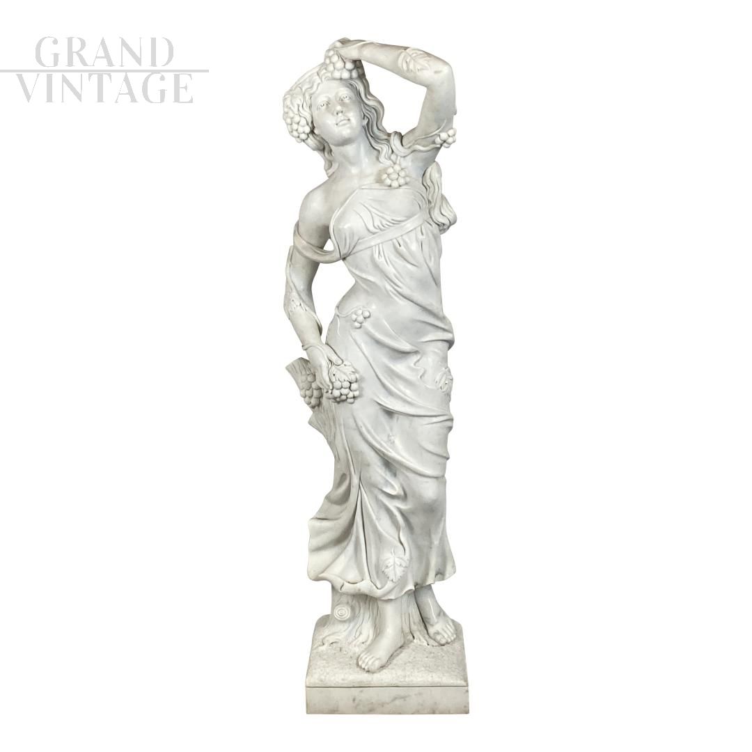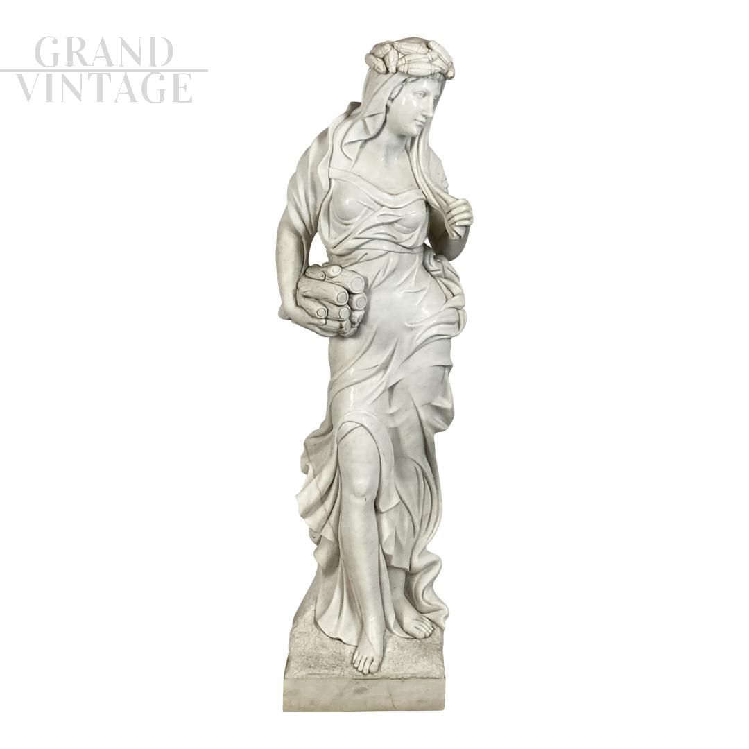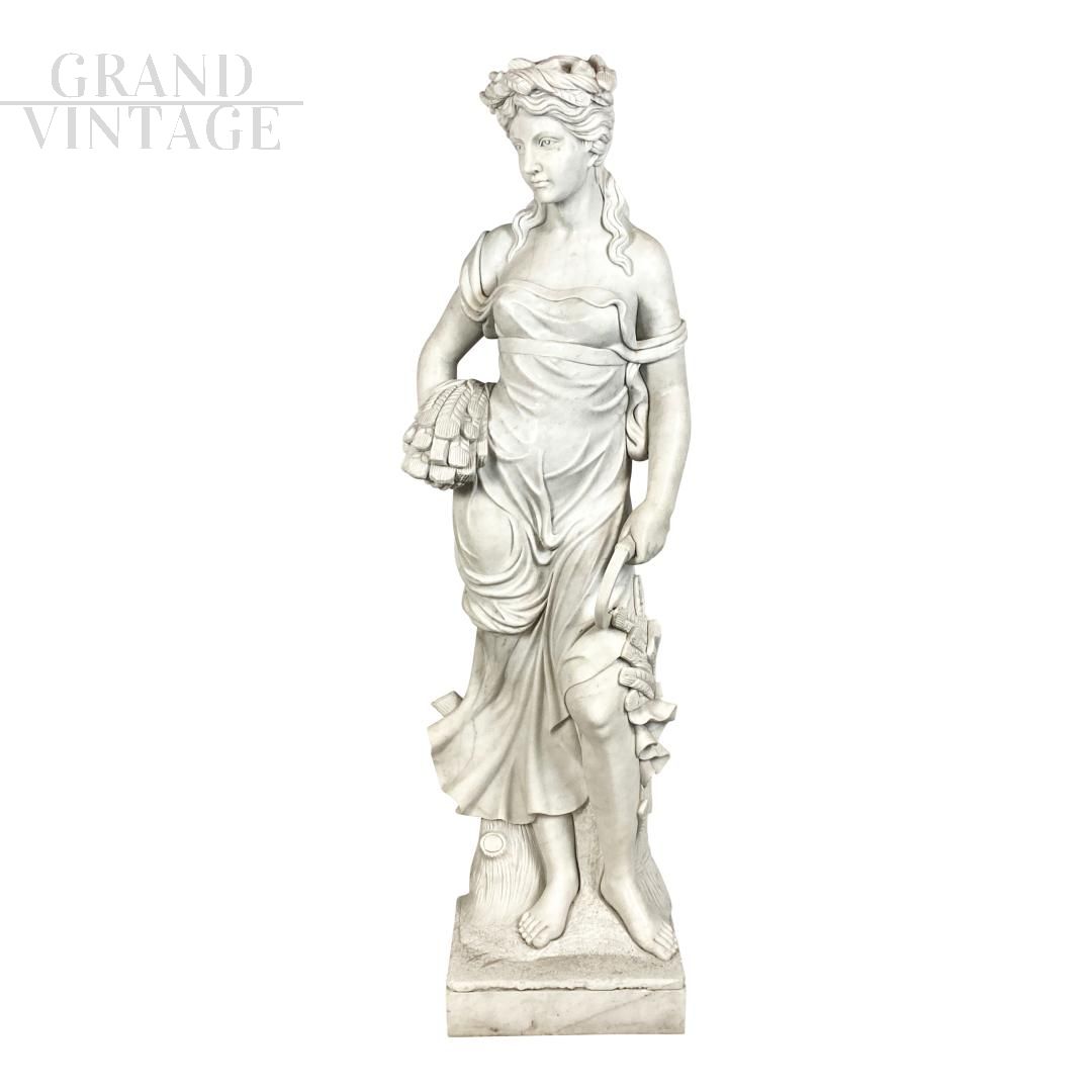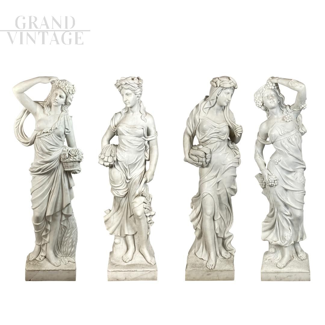 Group of 4 fine white marble statues depicting the Four Seasons allegorically represented by female figures, suitable for elegantly decorating a garden. Summer is represented with the ear of corn, Spring with roses, Autumn with grapes and Winter with firewood.
