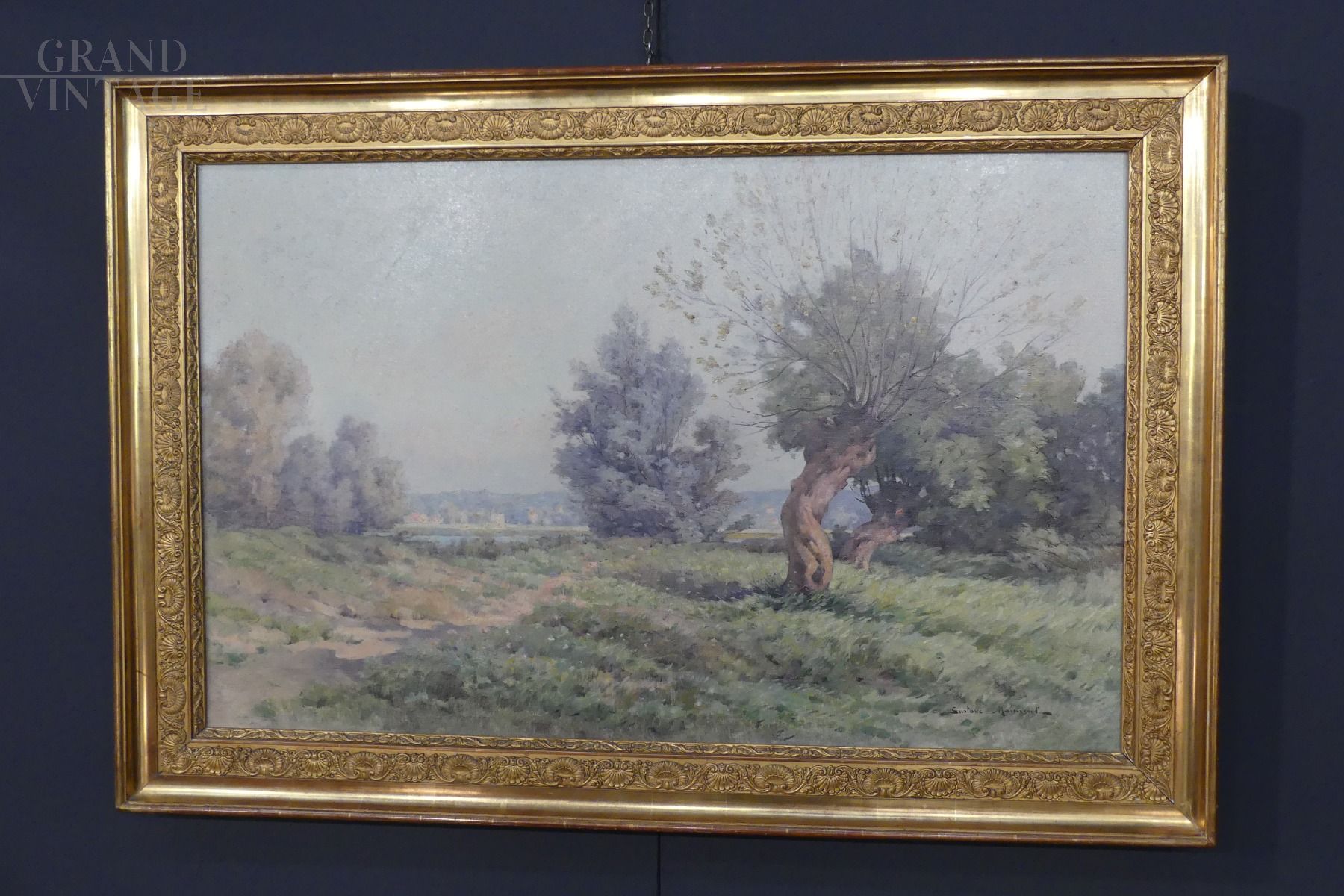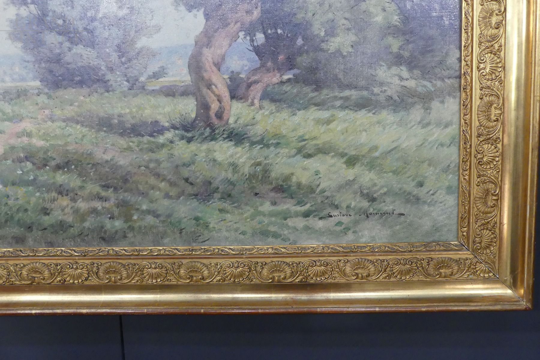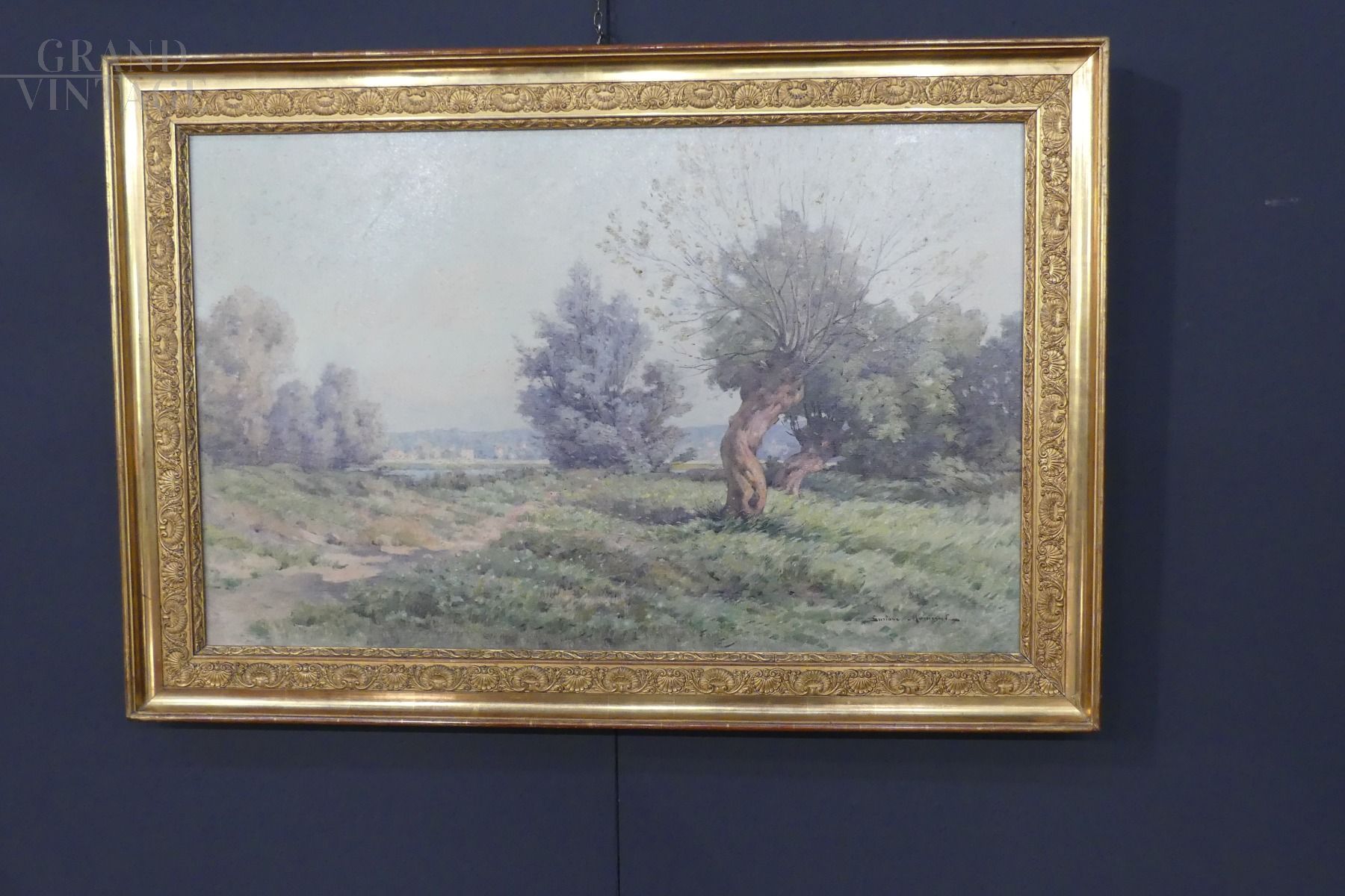 Country landscape painting by the French painter Gustave Maincent (1850 - 1887), oil on canvas in a non-coeval gilded frame, restored in 2007.