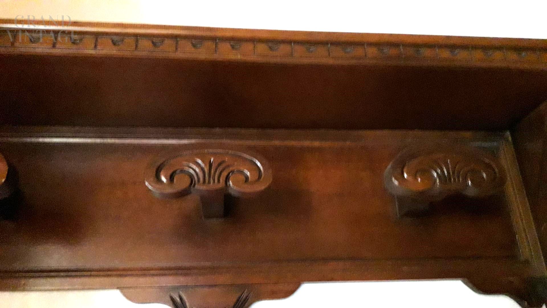 Hallway wall coat rack in classic antique style in carved solid walnut wood, with hat shelf.