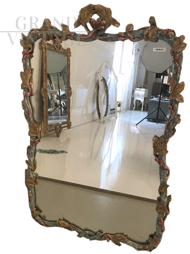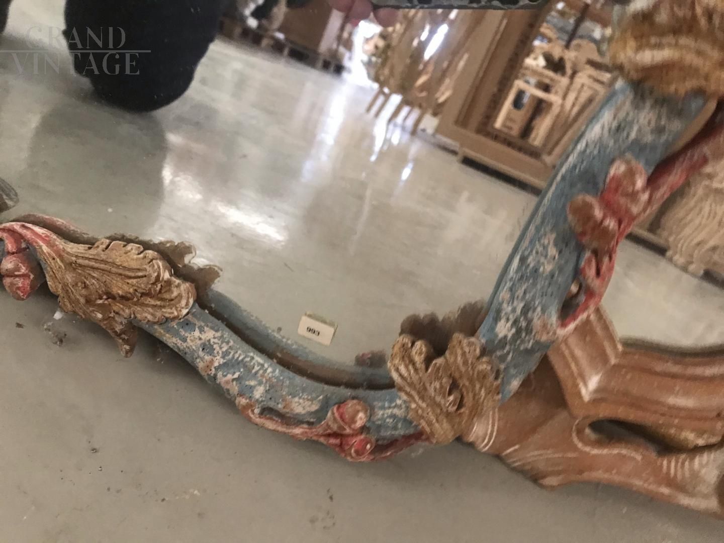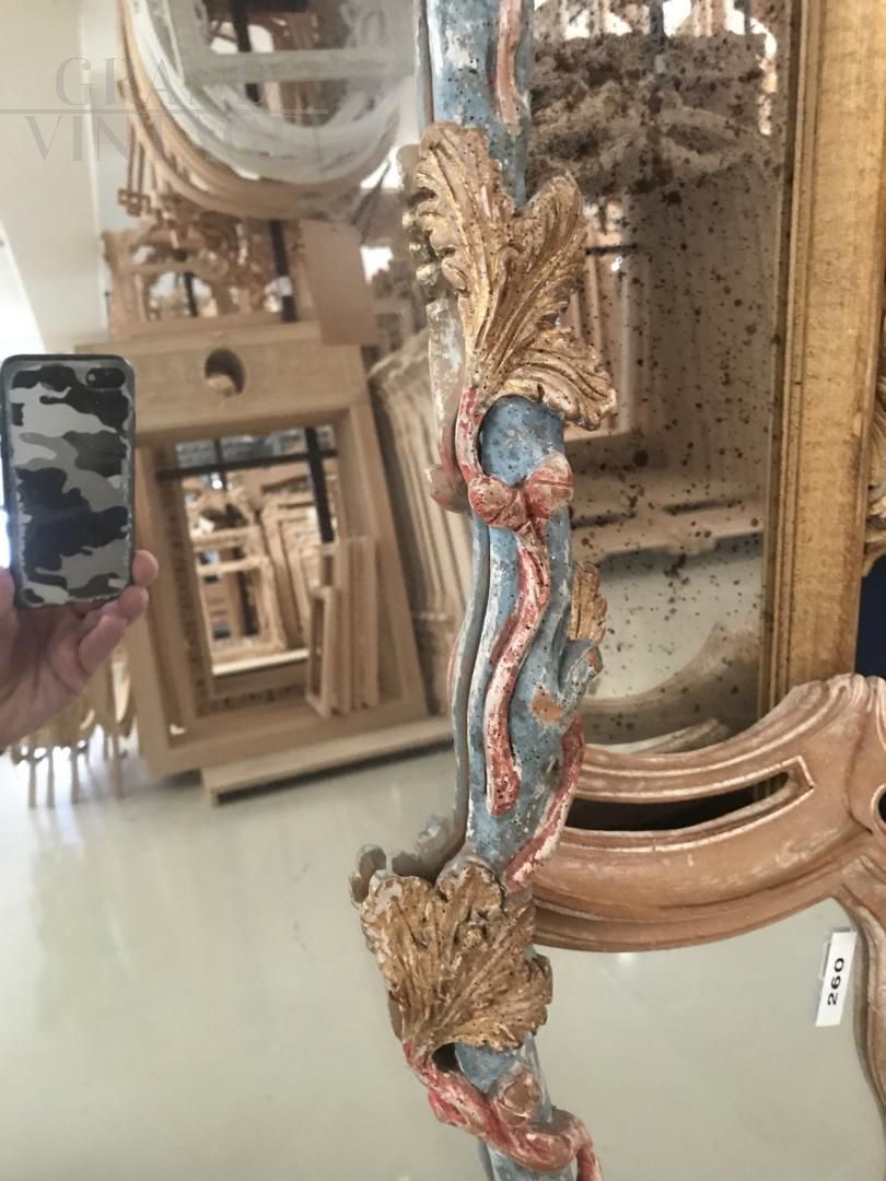 Hand carved mirror in antique style and painted with pastel polychrome colors