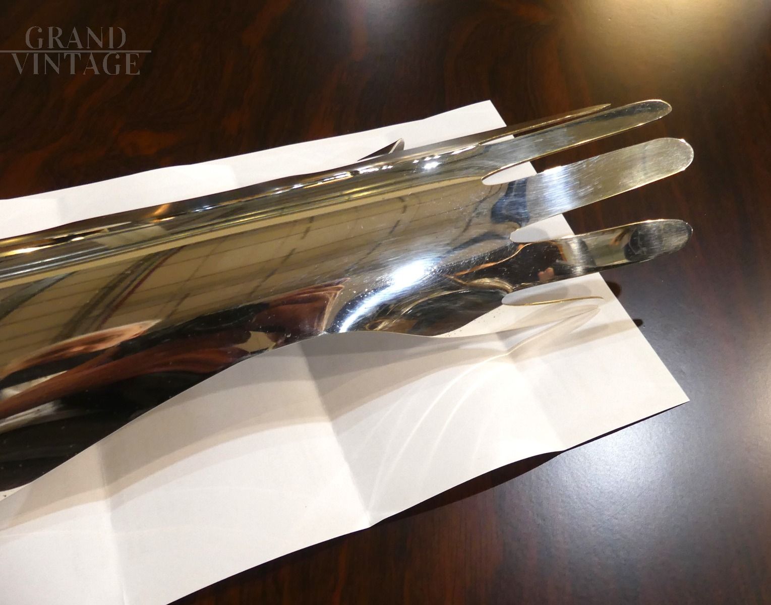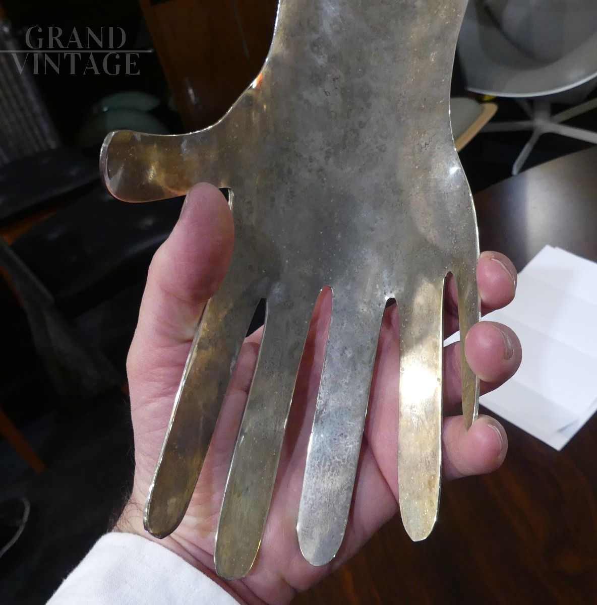 Beautiful sculpture by Gio Ponti in silver metal foil depicting a stylized hand. The artwork is signed.