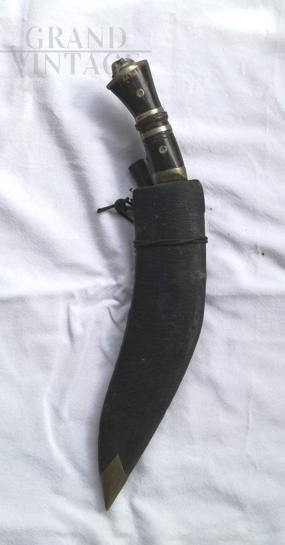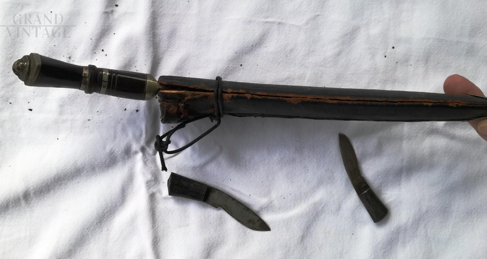 African art set from the 80s consisting of a curved dagger and 2 small knives, with leather case with metal tip. The dagger is not sharp, the brown color above the blade is transferred from the leather, it is not rust. The knives are in good condition, the leather case needs to be repaired.