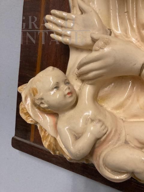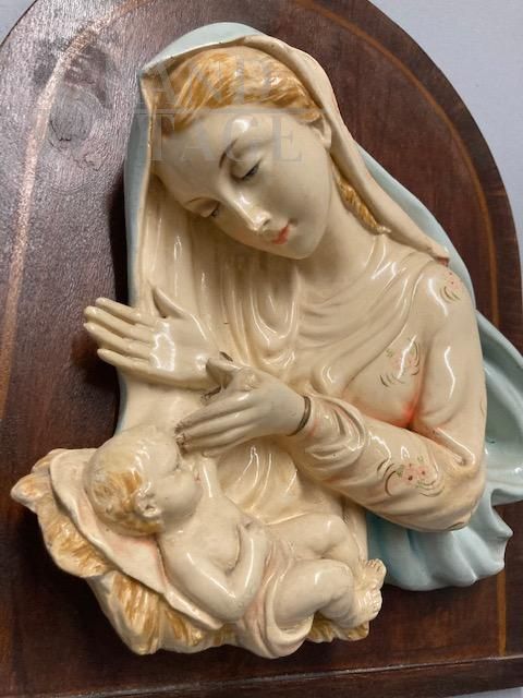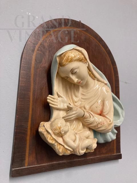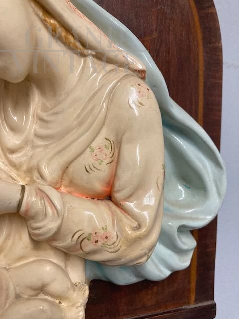 Headboard Madonna in polychrome painted majolica of Italian Tuscan manufacture by Signa from the 1940s, Virgin and Child on a wooden base. Good state of conservation.
