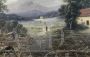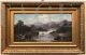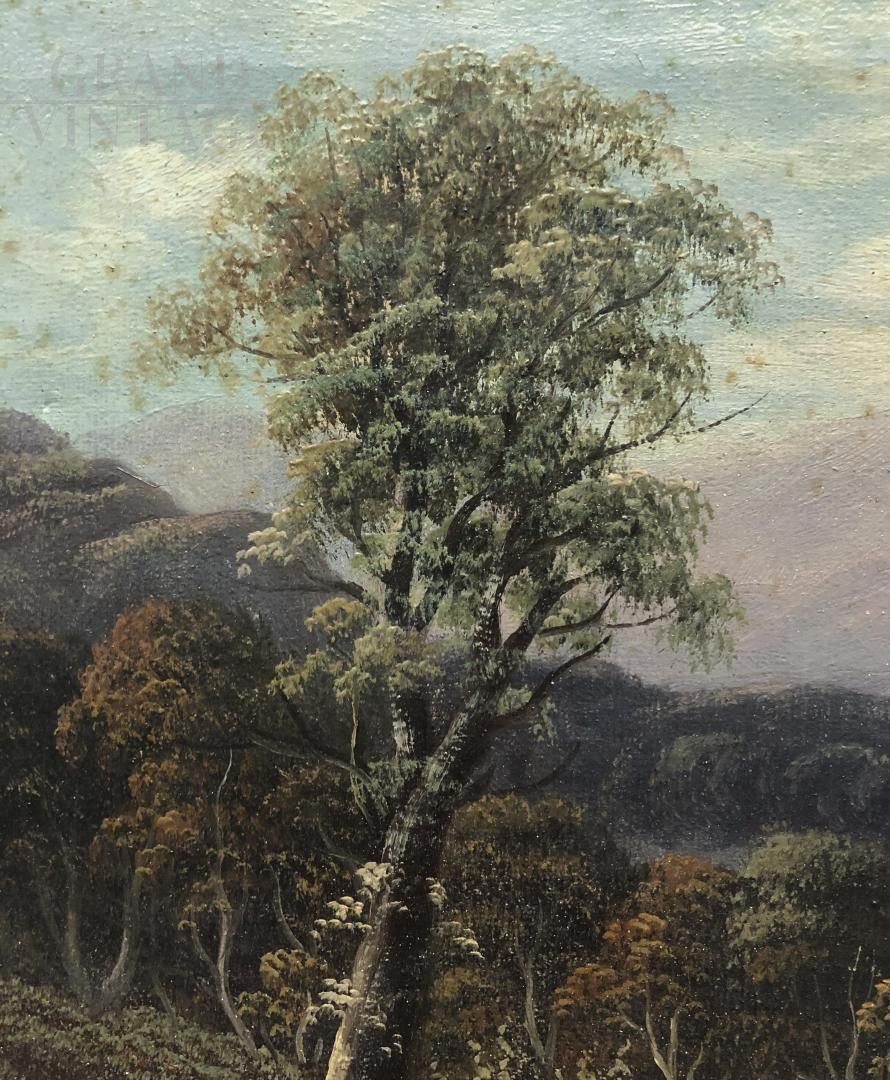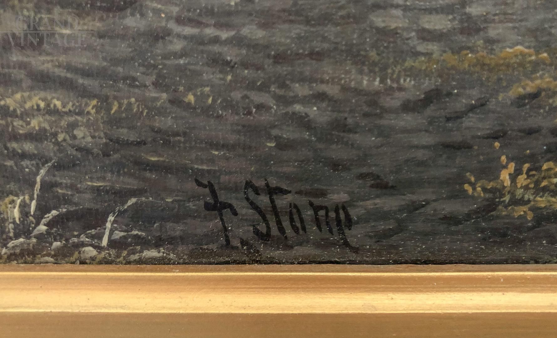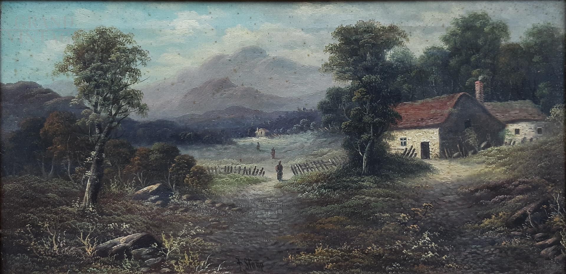 Oil painting on canvas from the nineteenth century depicting a hilly landscape with characters and houses. Work signed by the English painter Frank Stone (1800 - 1859), within a gilded wooden frame.
