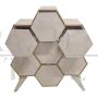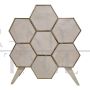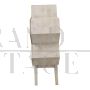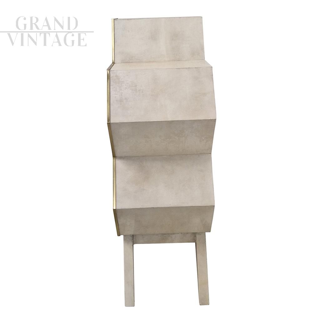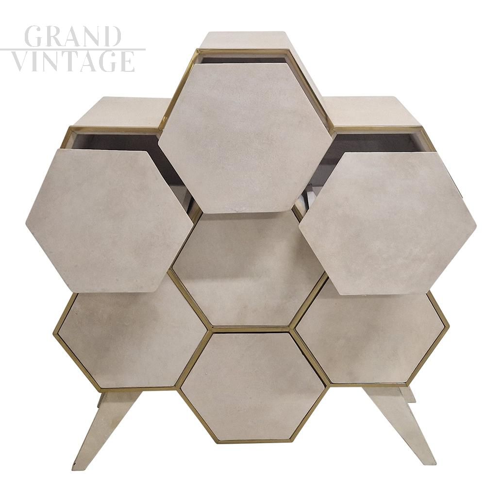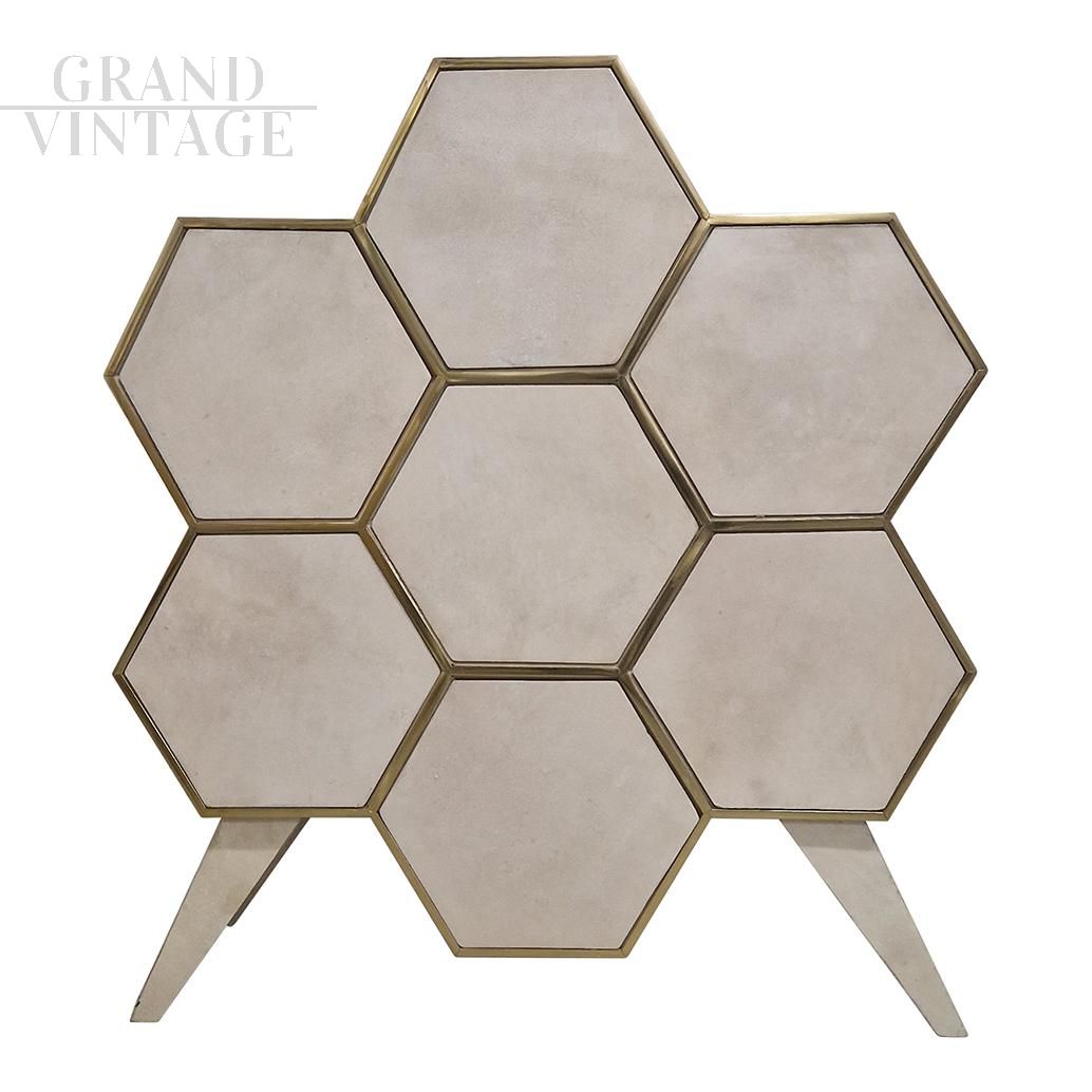 Beautiful chest of drawers with wooden honeycomb structure with seven drawers, covered in natural parchment with brass profiles and feet.